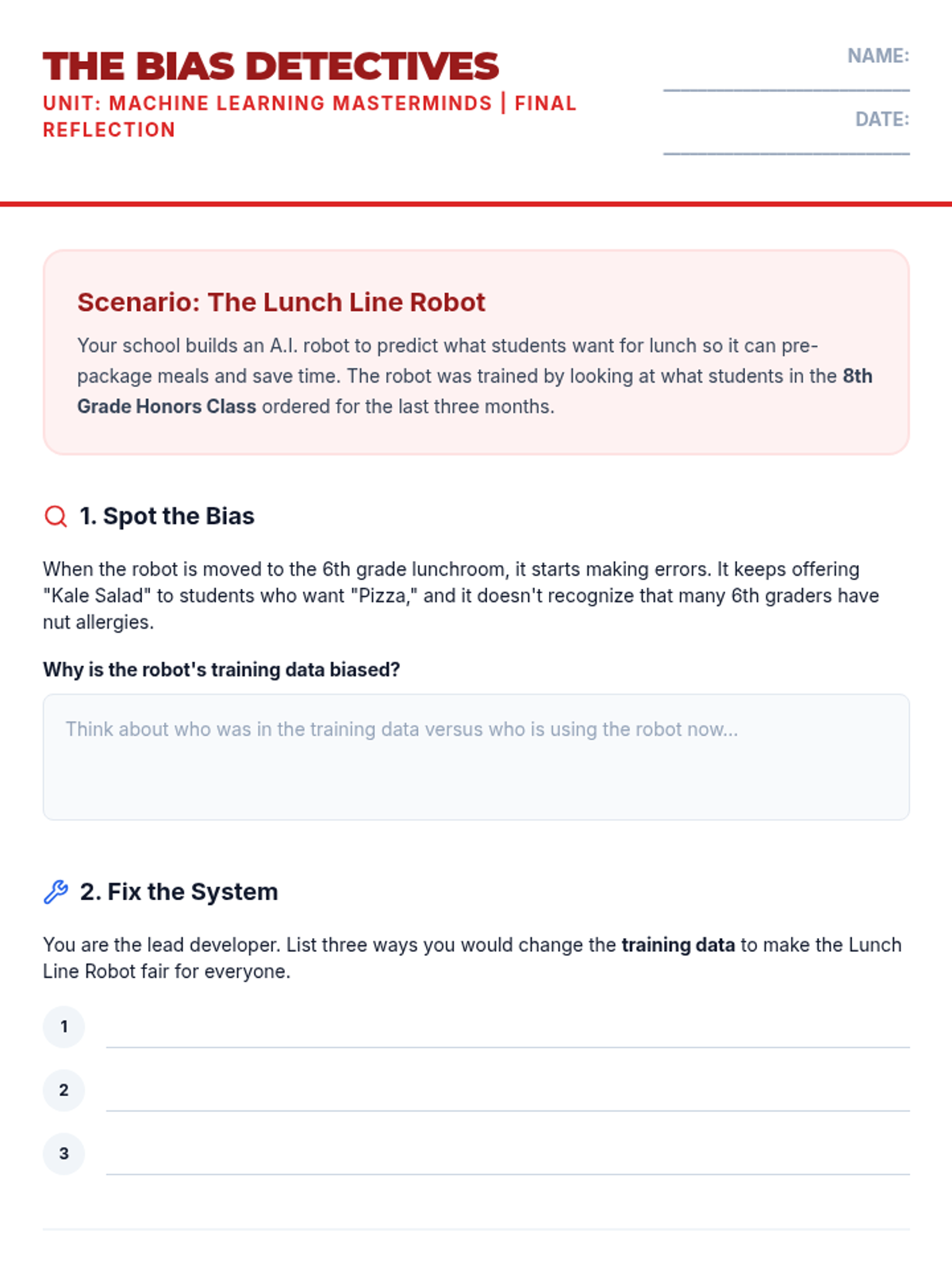 Students analyze real-world case studies of algorithmic bias and reflect on the responsibility of developers to create fair and equitable technology.