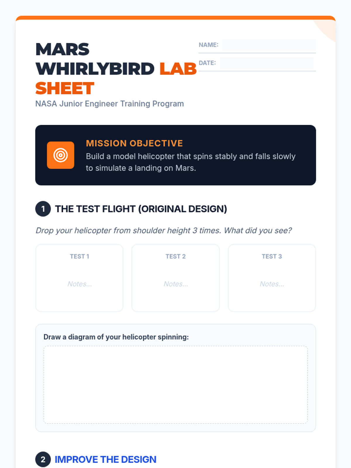 Students follow the Engineering Design Process to build and test paper helicopters, inspired by NASA's Ingenuity Mars helicopter. They will experiment with variables like weight and blade length to observe changes in aerodynamics and spin.