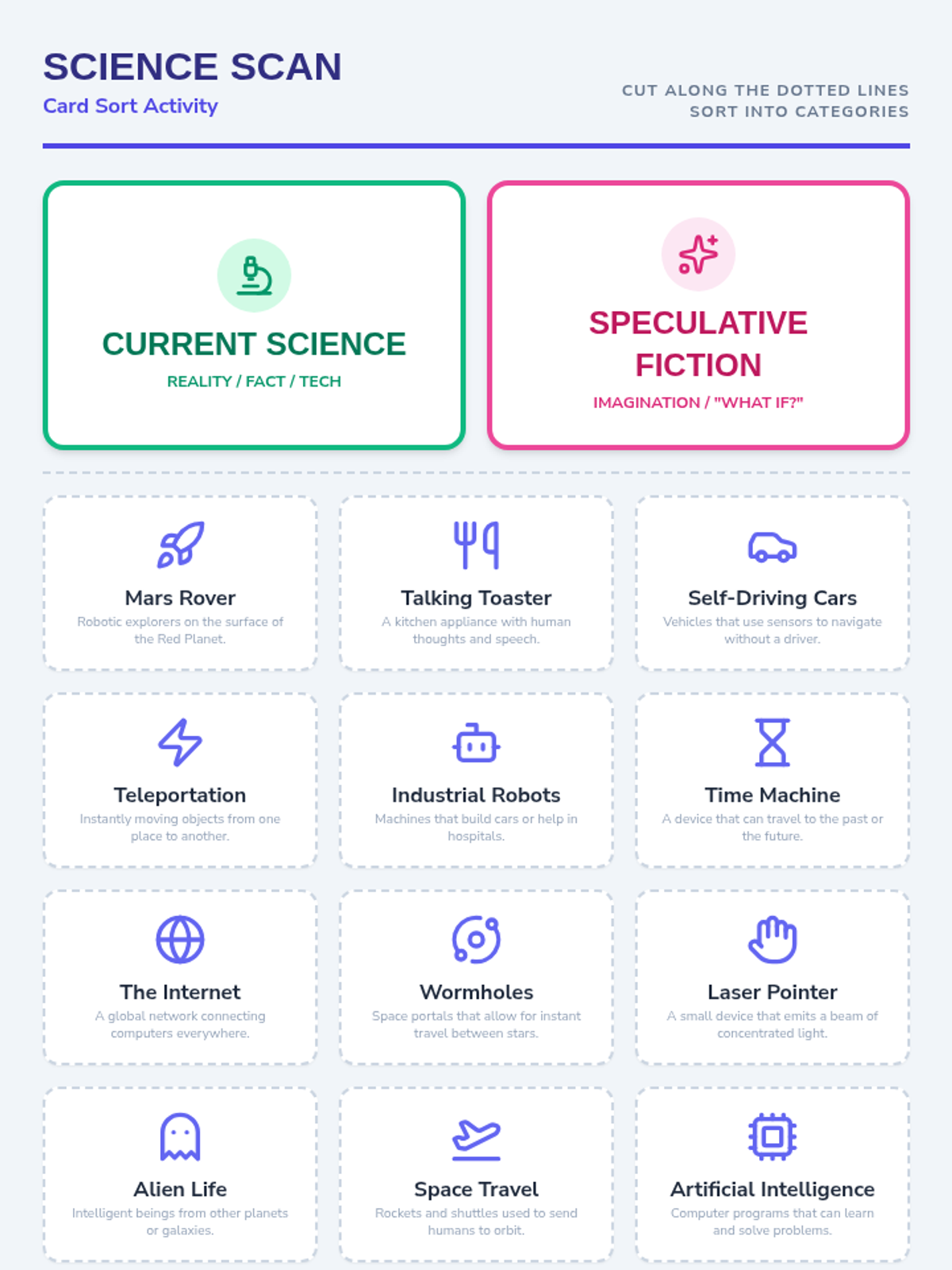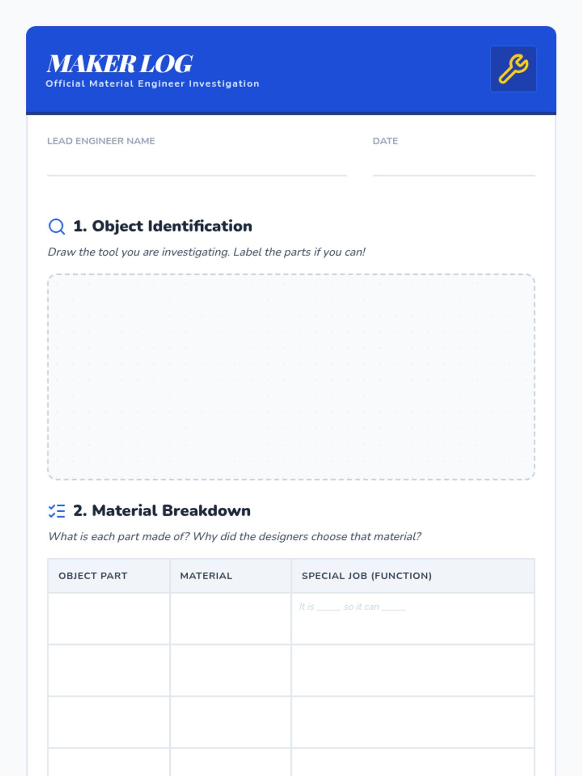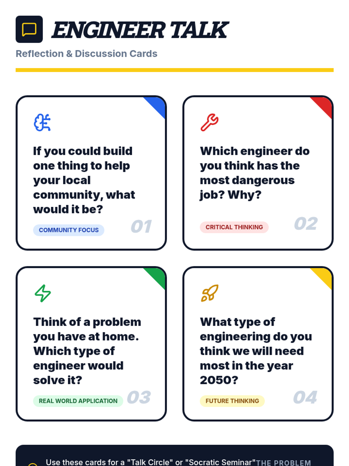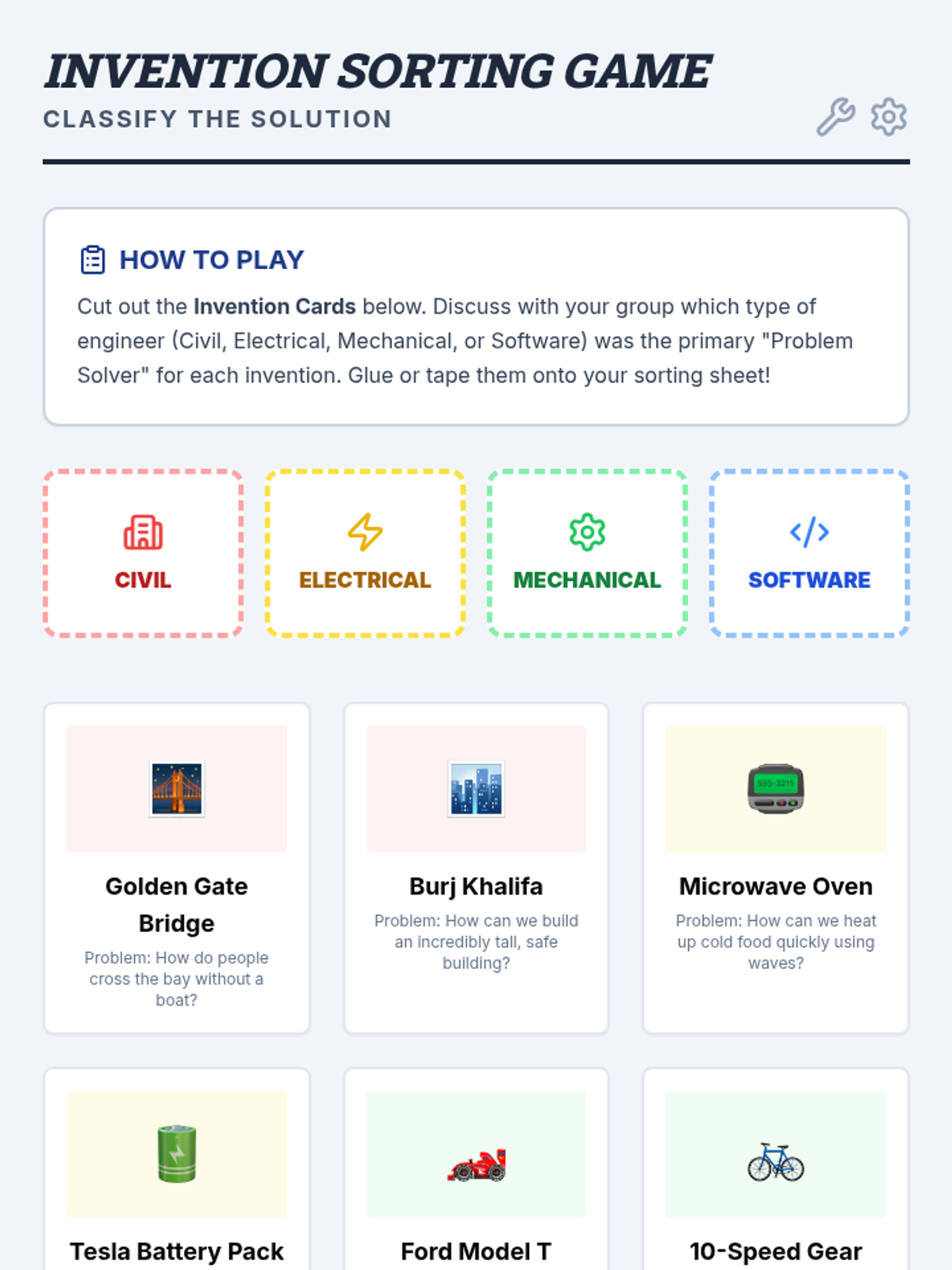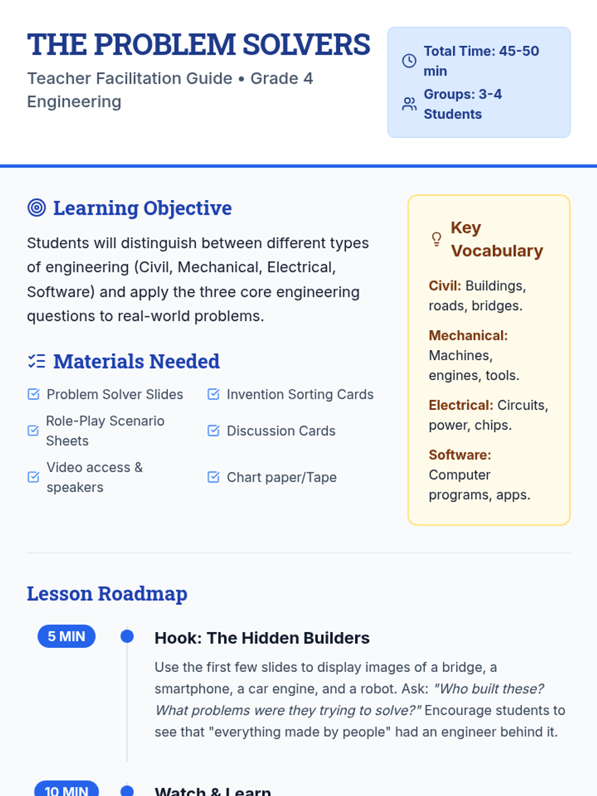 Students explore four major fields of engineering (Civil, Mechanical, Electrical, and Software) through a video, a categorization game, and interactive role-play scenarios. they learn to apply the three core questions of engineering: what is the problem, who has it, and why does it matter?