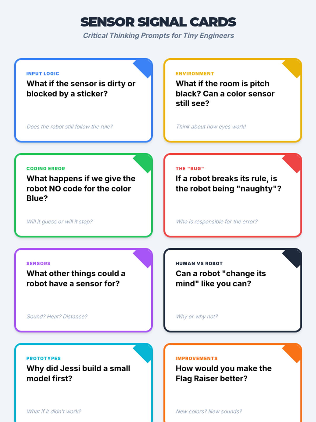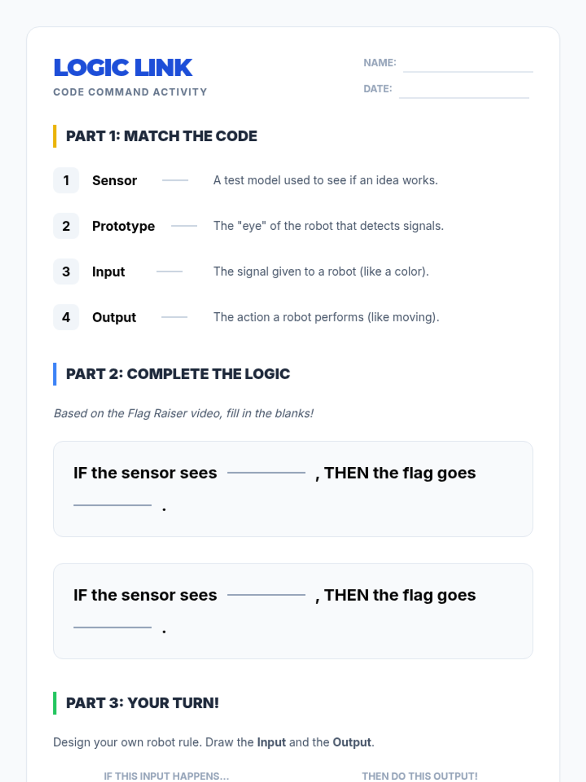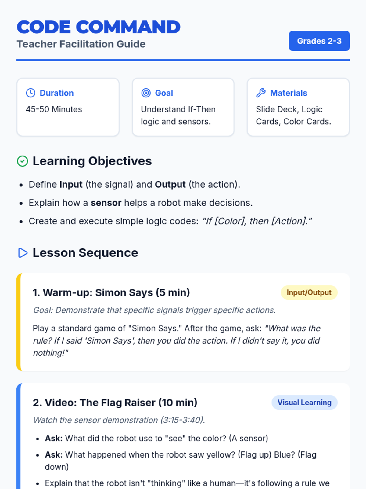 An introductory robotics and logic lesson where students explore input/output relationships through a color sensor demonstration and physical role-play activities.