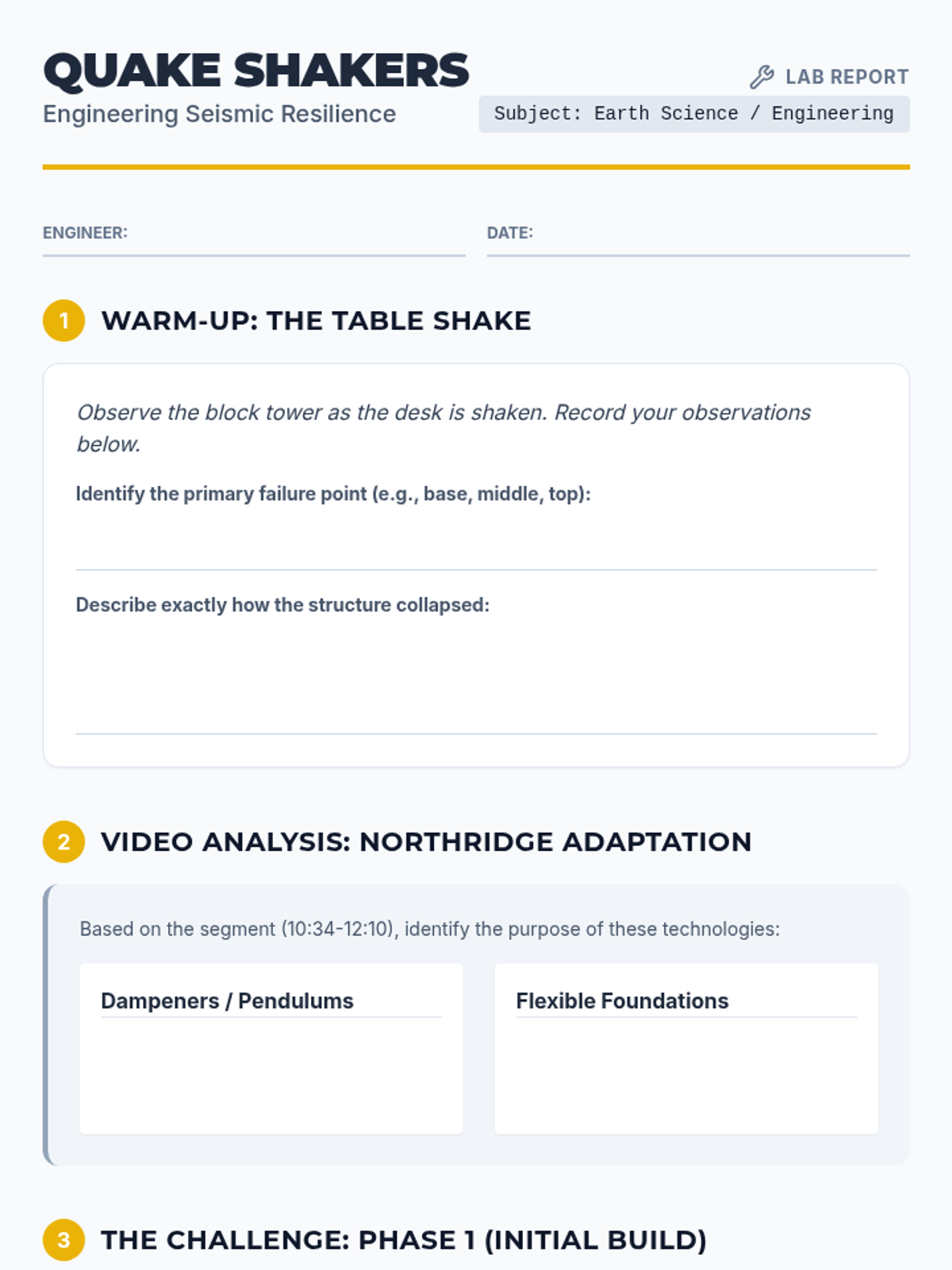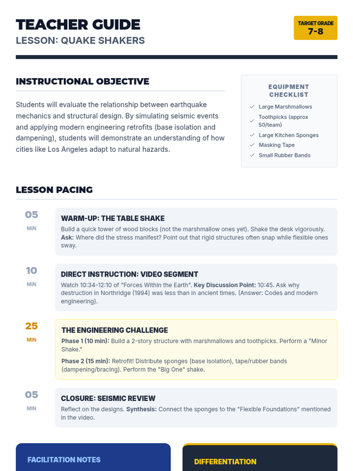 A hands-on engineering lesson where students explore seismic resilience by building and retrofitting structures using marshmallows and toothpicks, inspired by modern California engineering solutions.