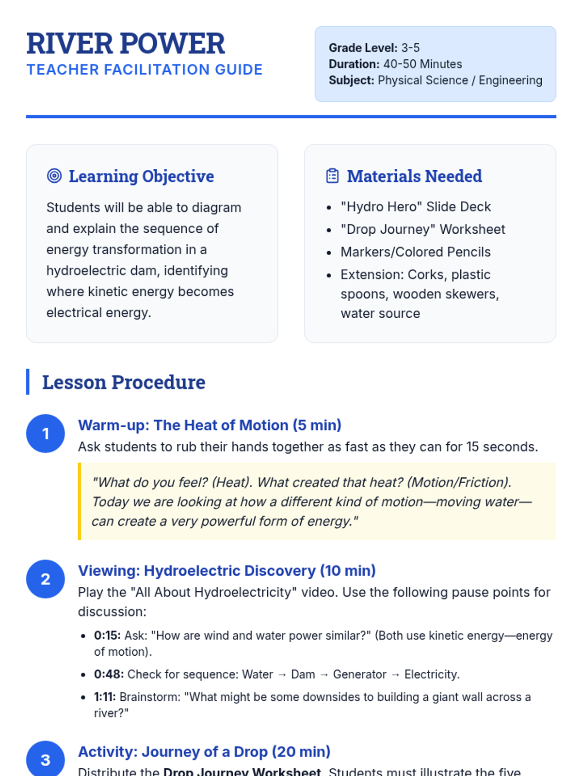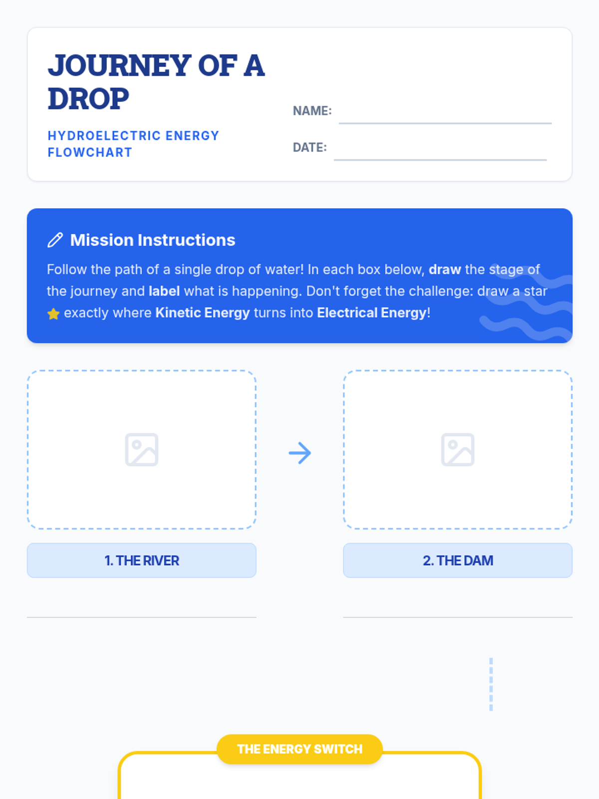 A lesson where students explore how moving water transforms into electricity through hydroelectric dams, culminating in a flowchart diagram of the energy journey.