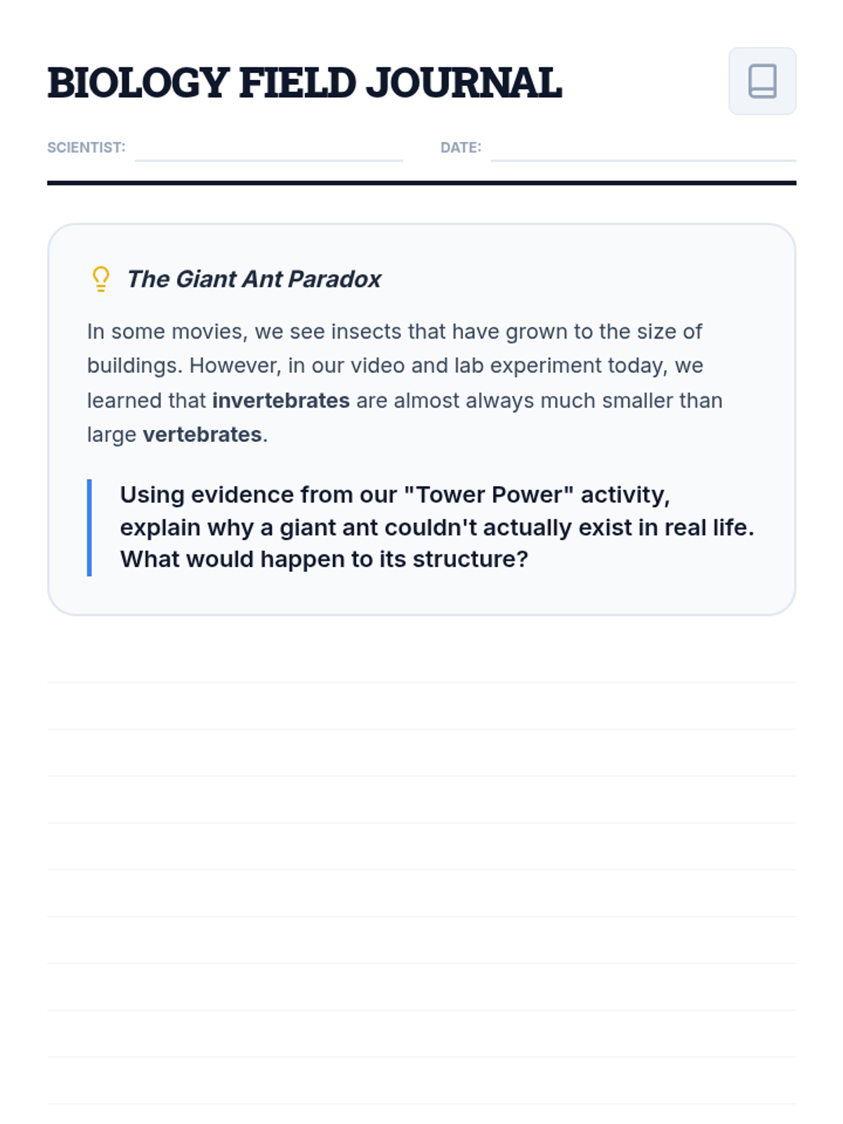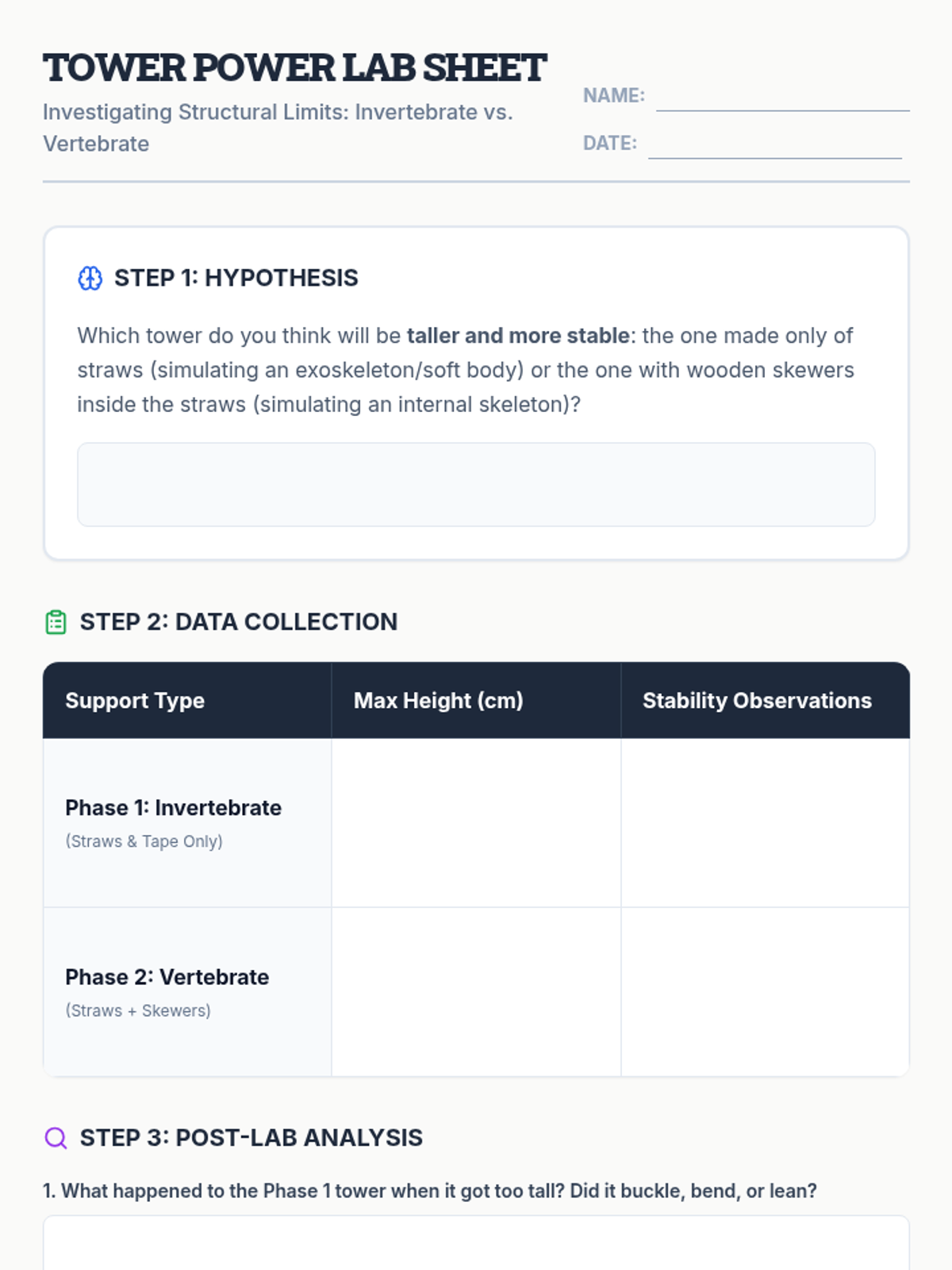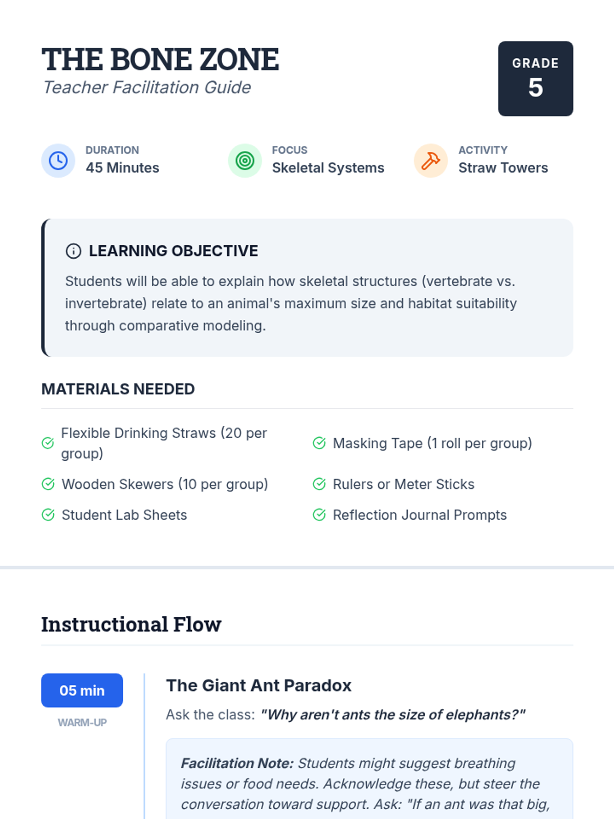 A hands-on exploration of how internal skeletons and exoskeletons determine the size and stability of animals, featuring a straw-tower engineering challenge.