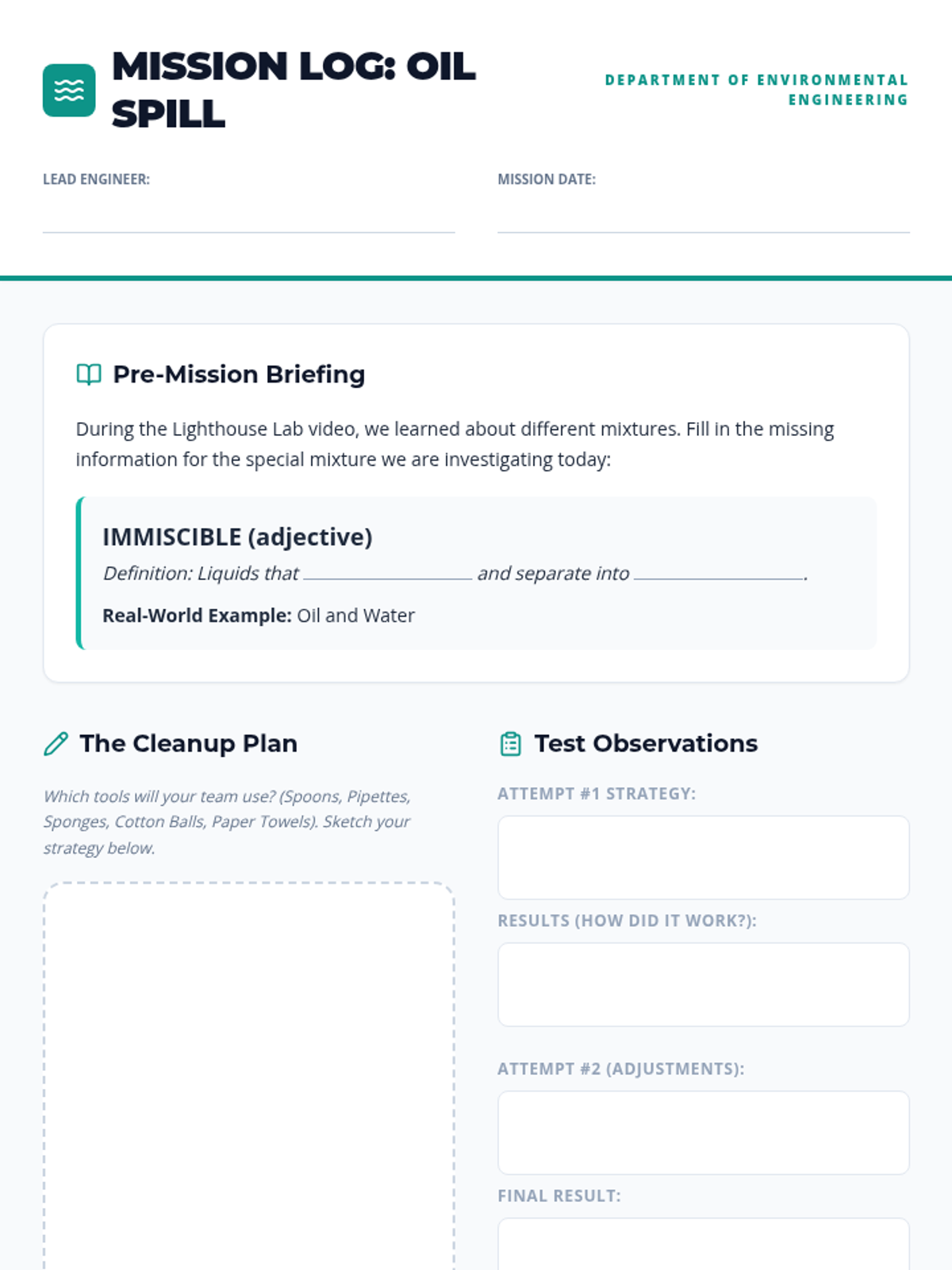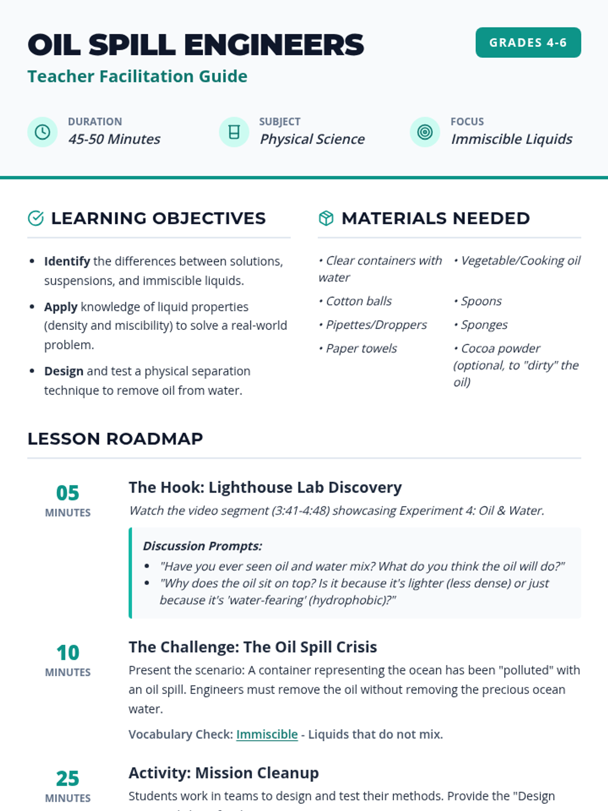 Students investigate the properties of immiscible liquids through an environmental engineering challenge where they must design a method to clean up a simulated oil spill using various tools and materials.