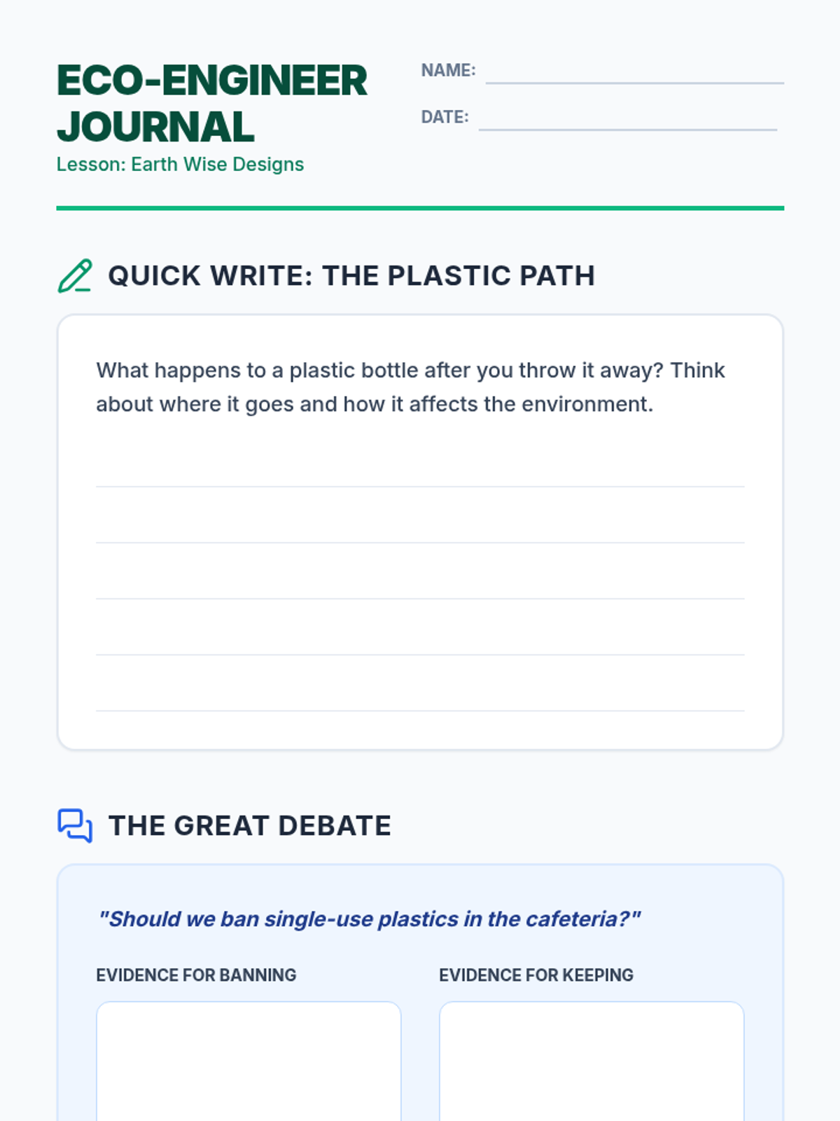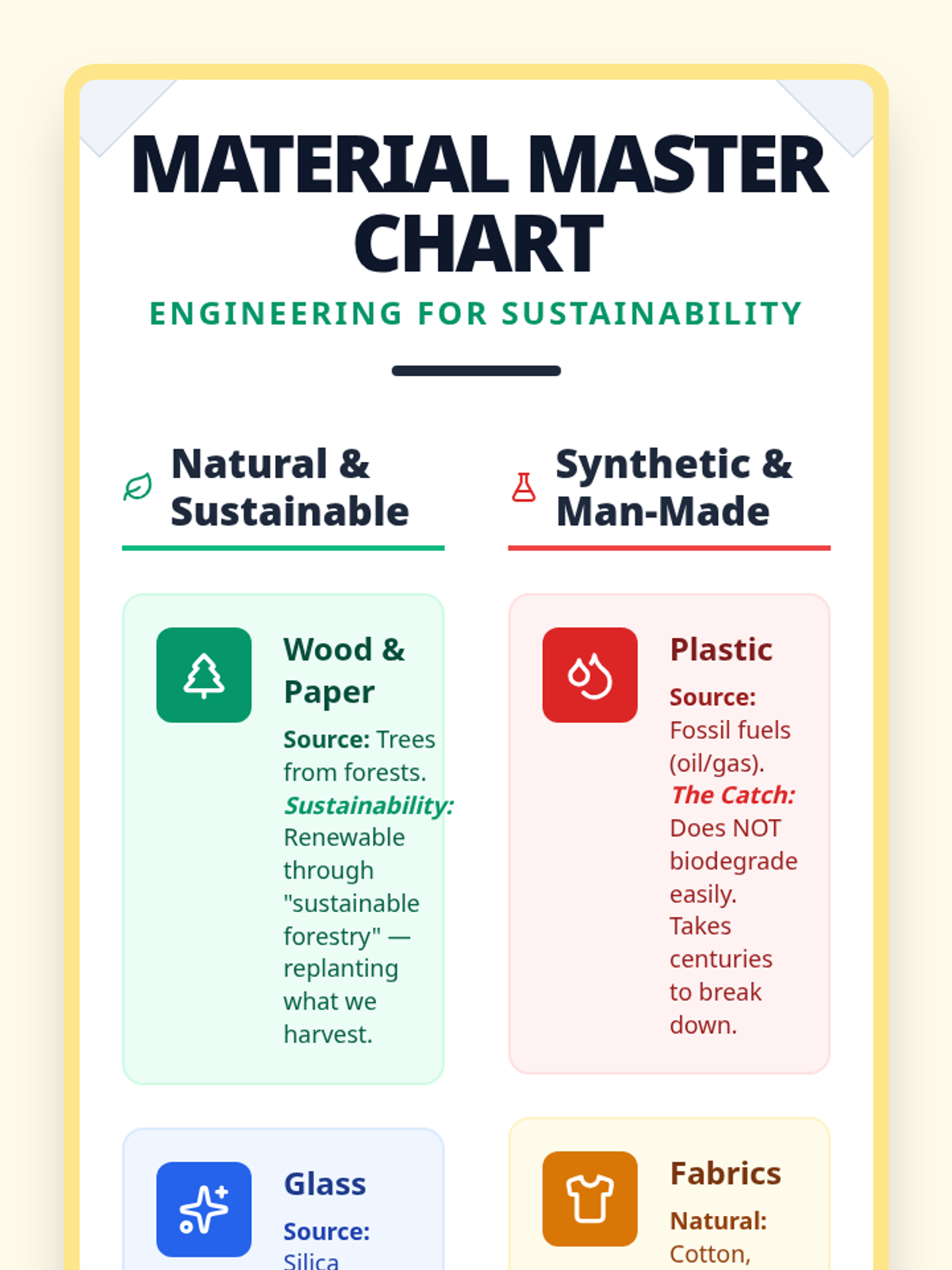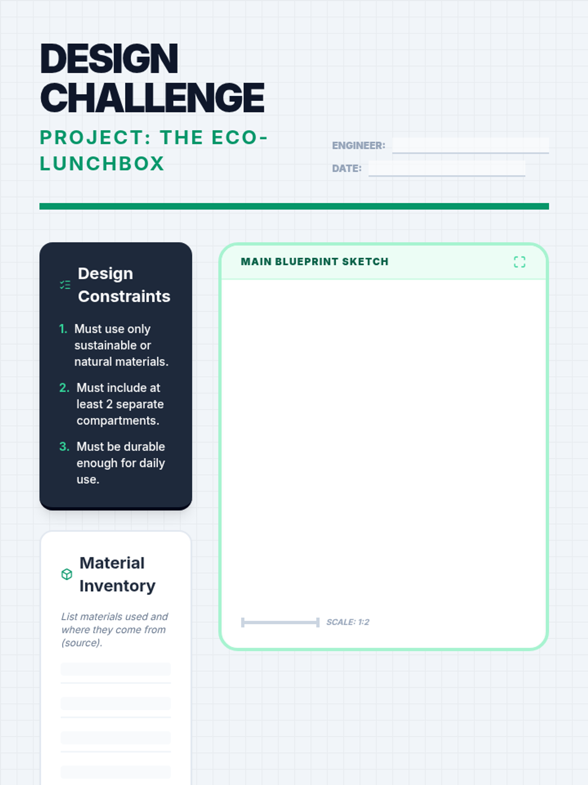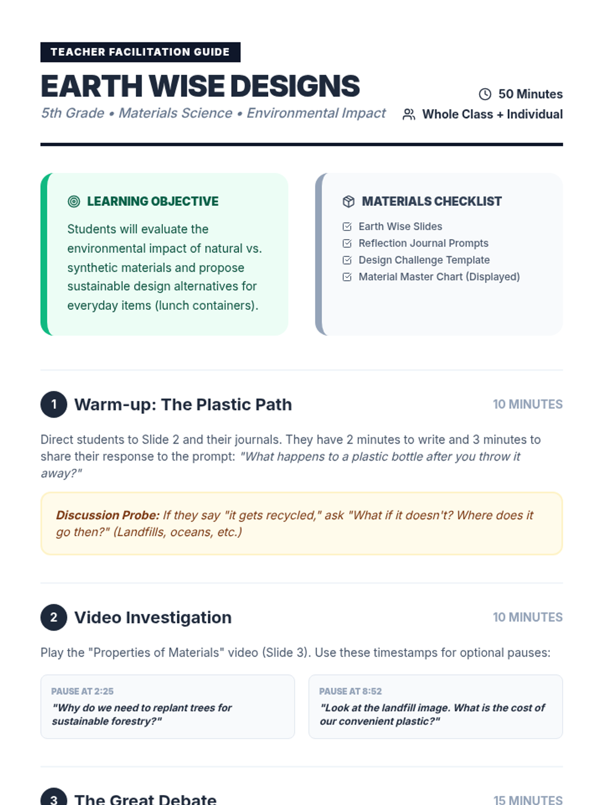 Students investigate the environmental impact of various materials, comparing sustainable forestry and natural resources to synthetic plastics. They apply their knowledge by designing a sustainable lunch container and debating the use of single-use plastics.