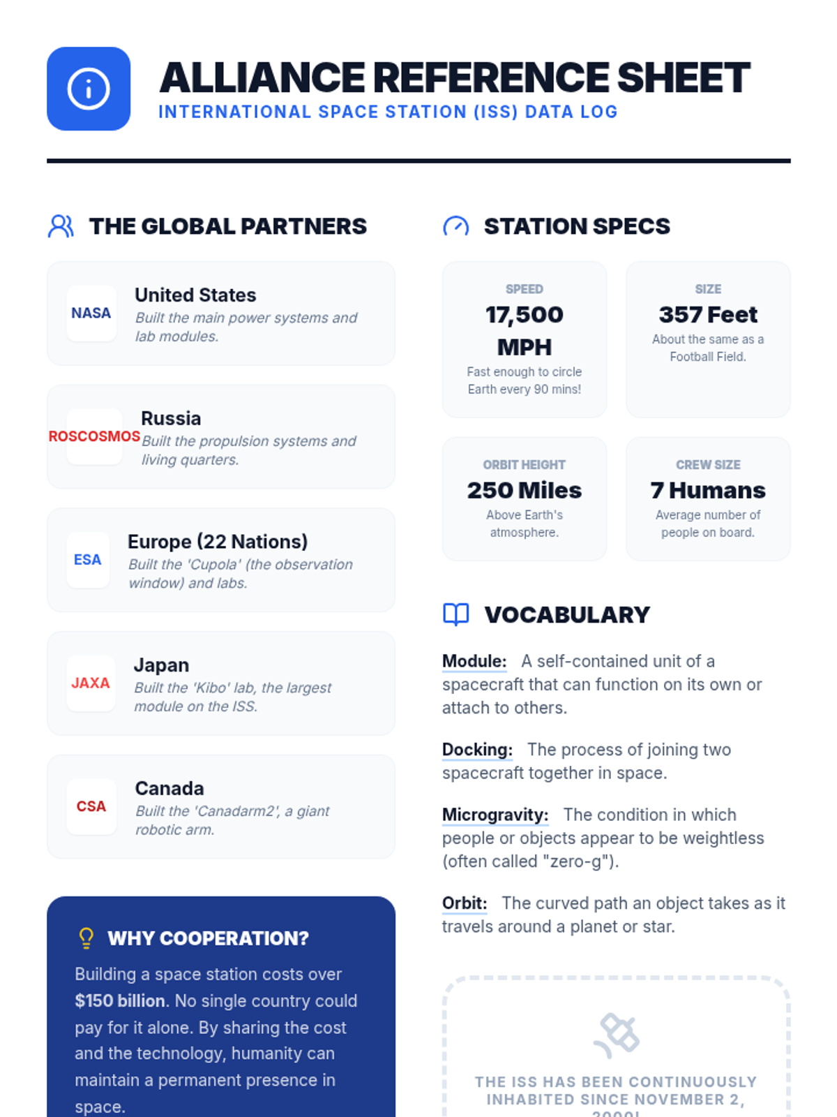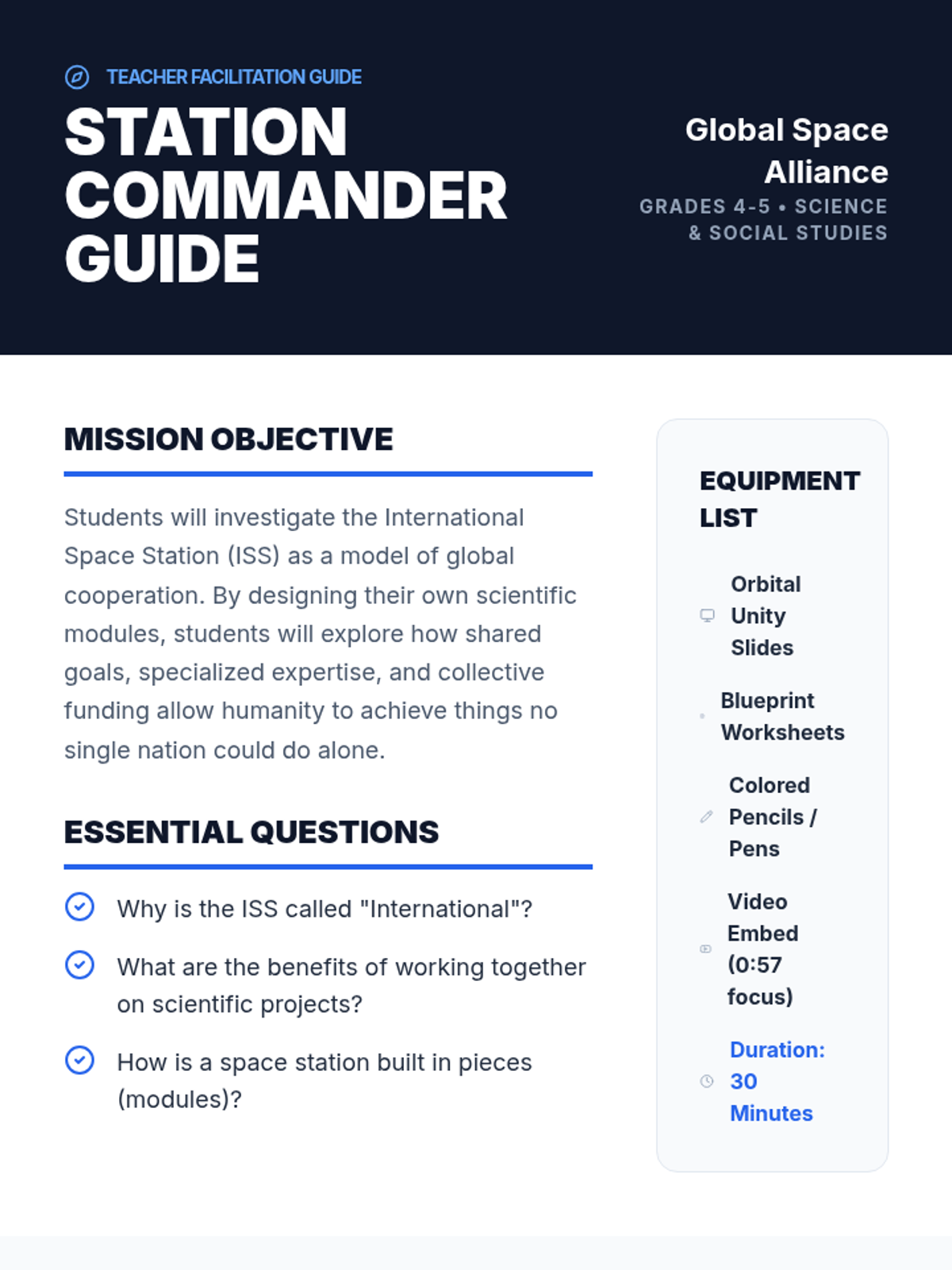 A comprehensive lesson where 5th-grade students explore the International Space Station as a model of global cooperation, researching specific contributions from partner nations to create a collaborative 'ISS Passport.'