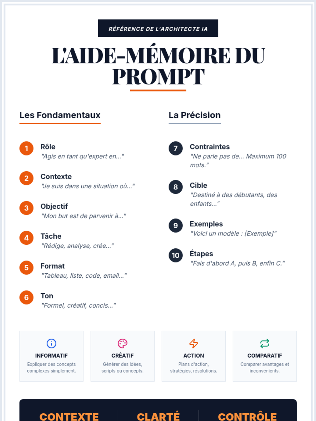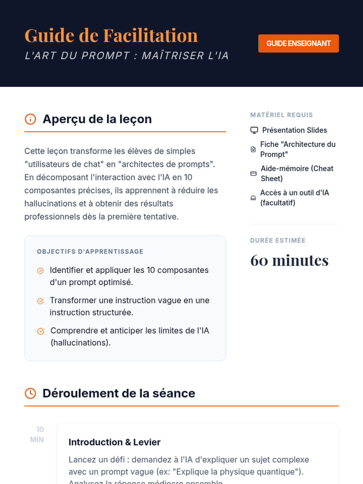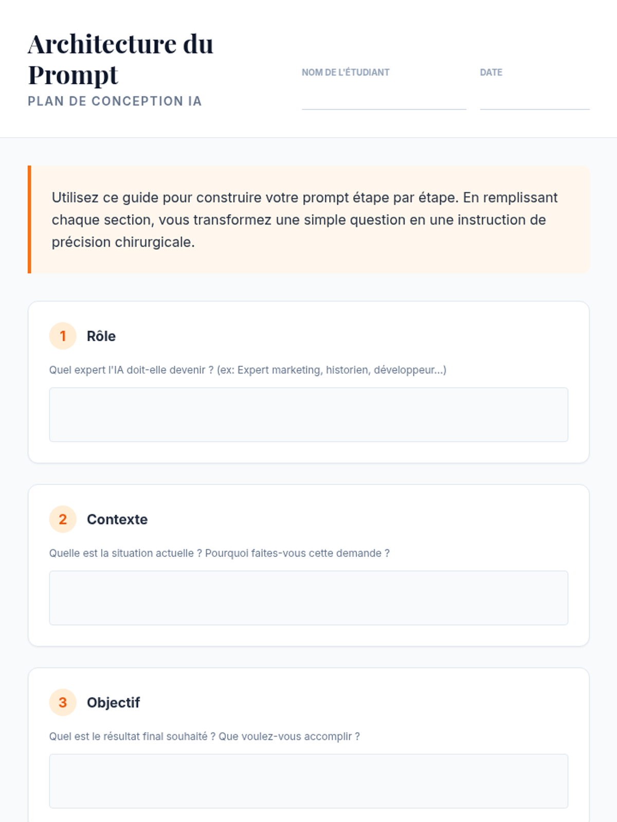 Cette leçon enseigne l'art de concevoir des prompts efficaces pour l'IA en utilisant 10 composantes clés, de la définition du rôle à l'itération finale.