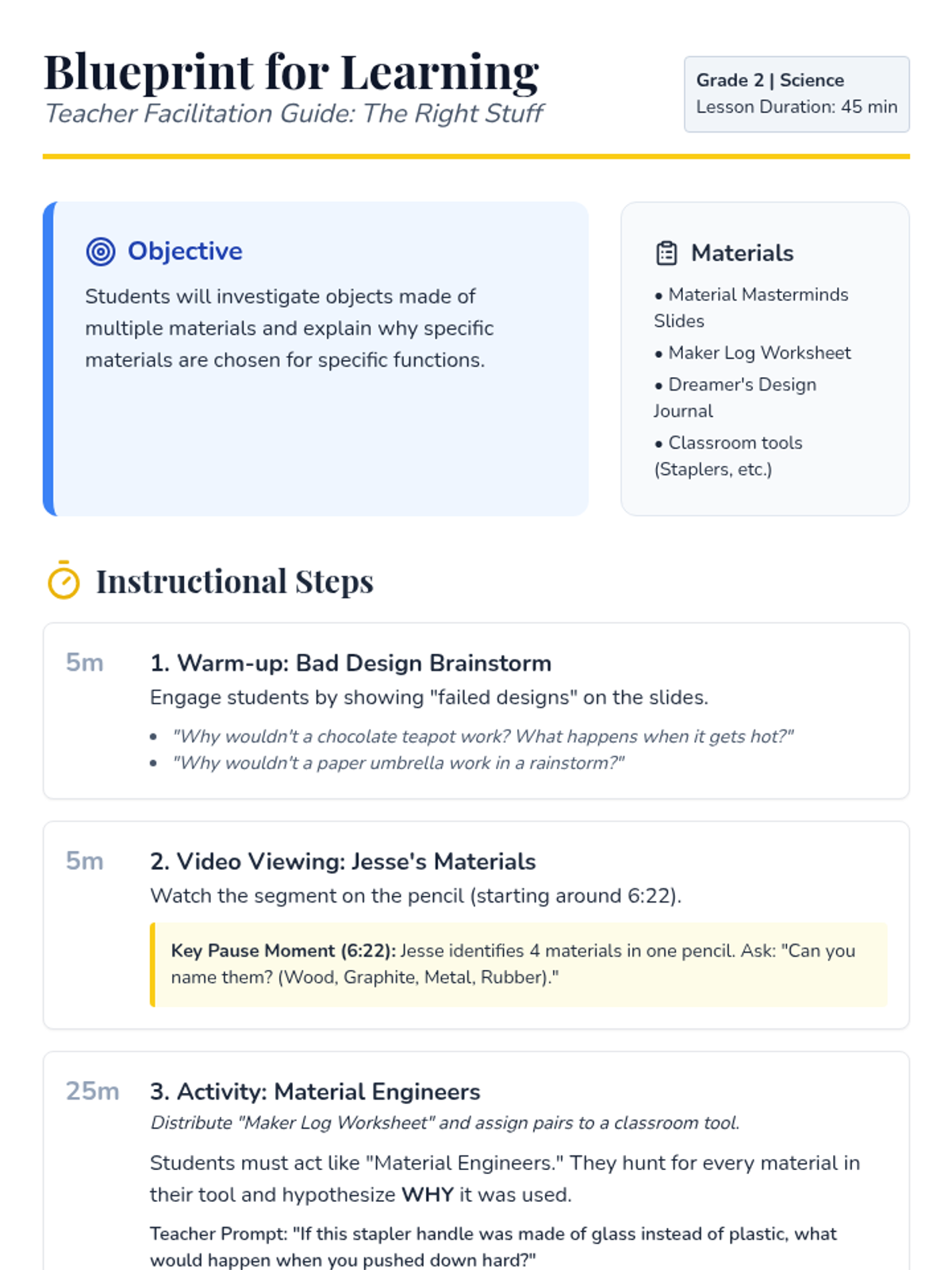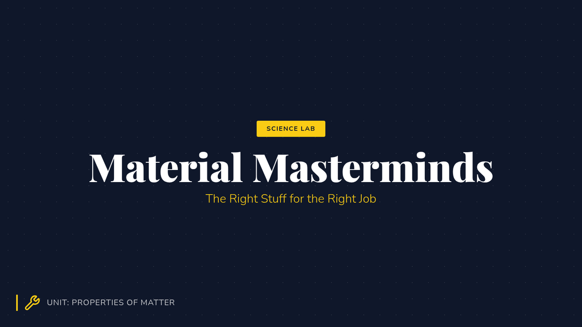 A hands-on investigation where 2nd-grade students explore why specific materials are chosen for objects based on their properties and functions.