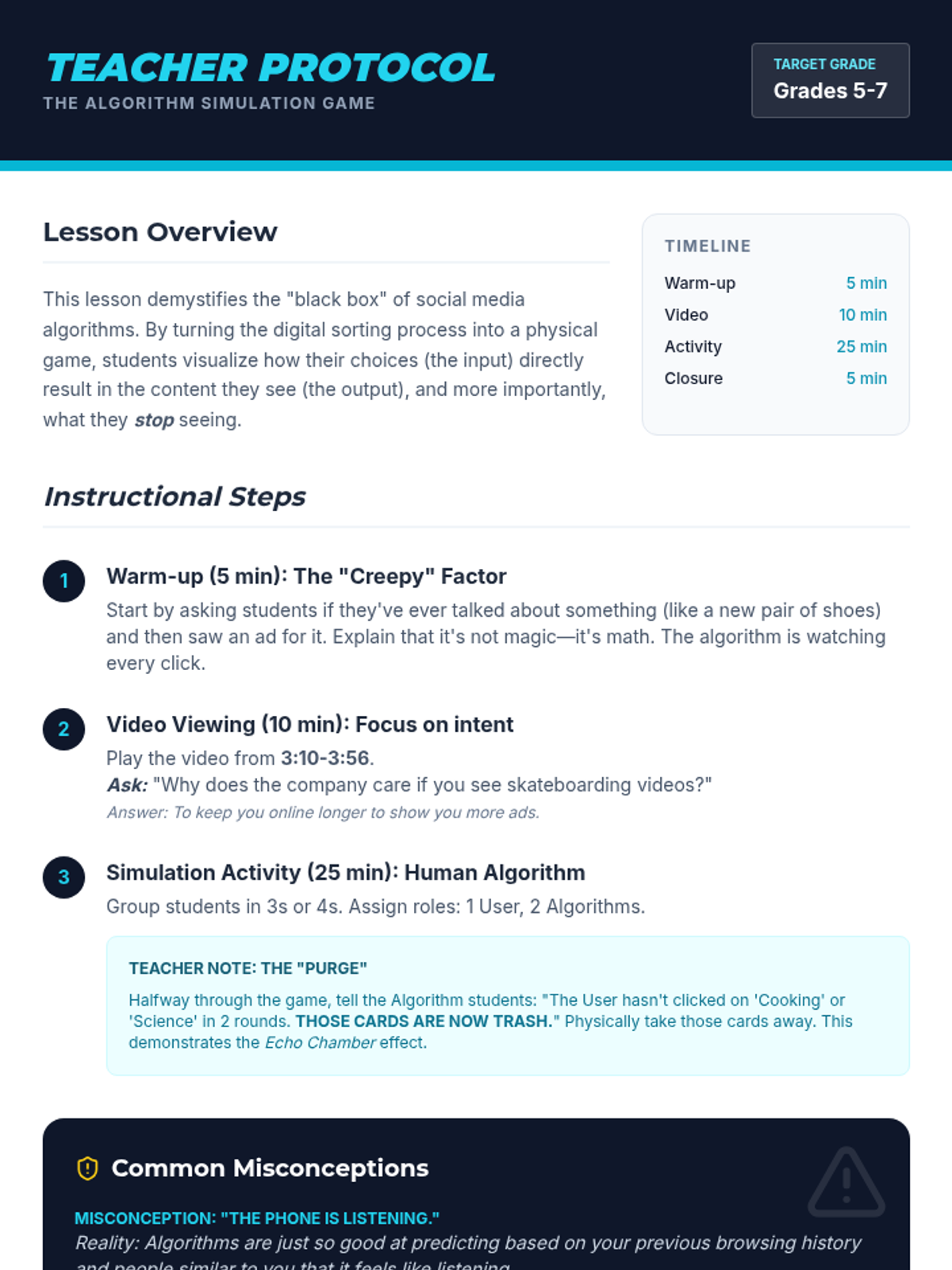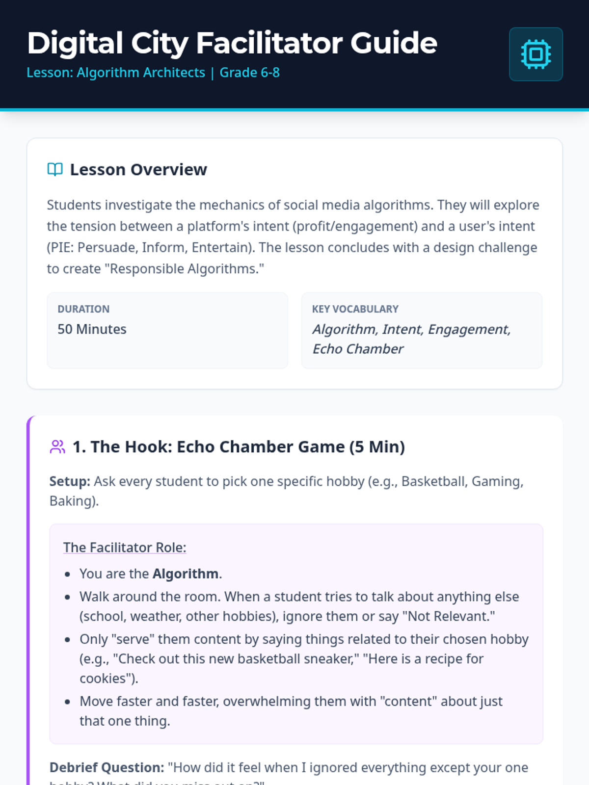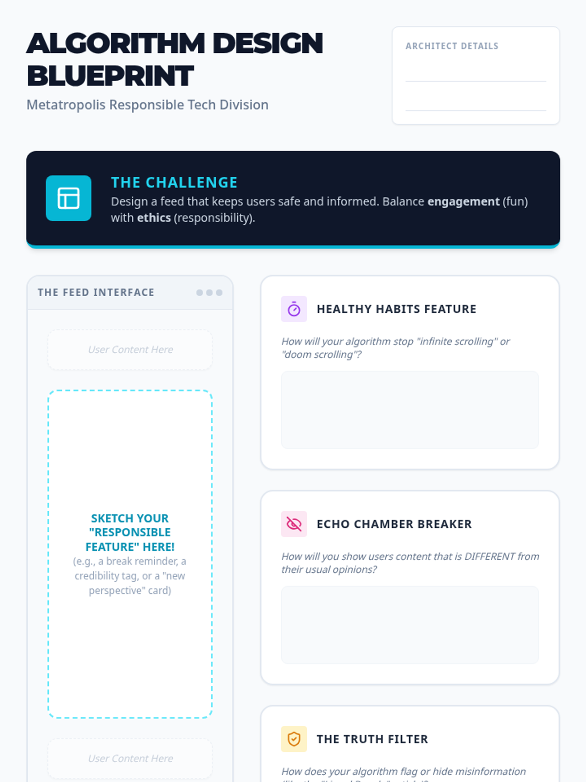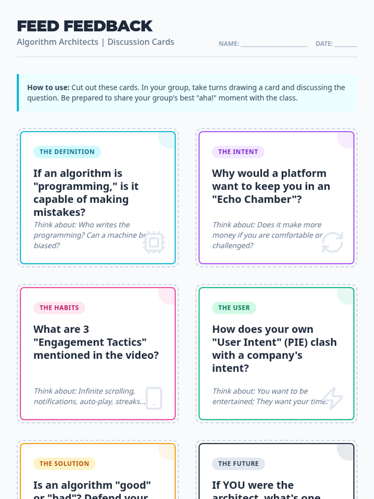 A middle school lesson exploring how social media algorithms work, their influence on user behavior, and how to design more responsible digital systems. Students will move from a physical simulation of an 'echo chamber' to designing their own ethical platform features.