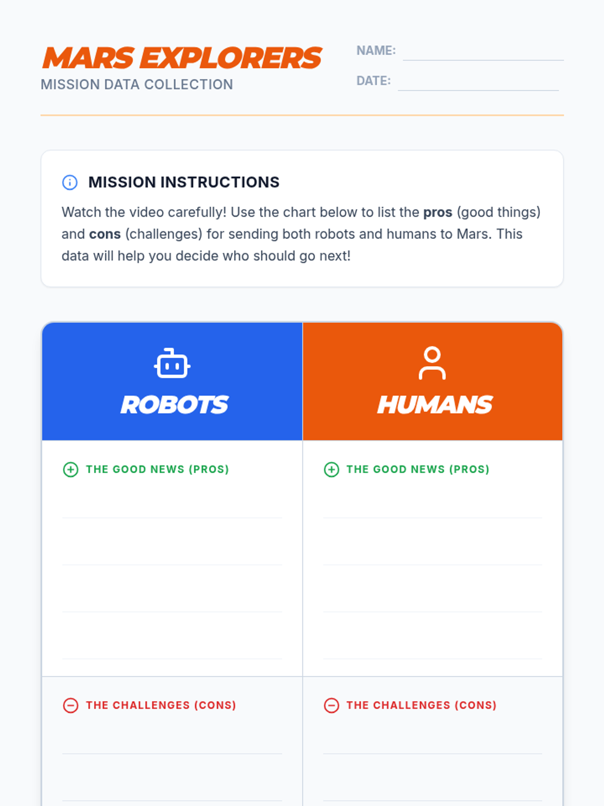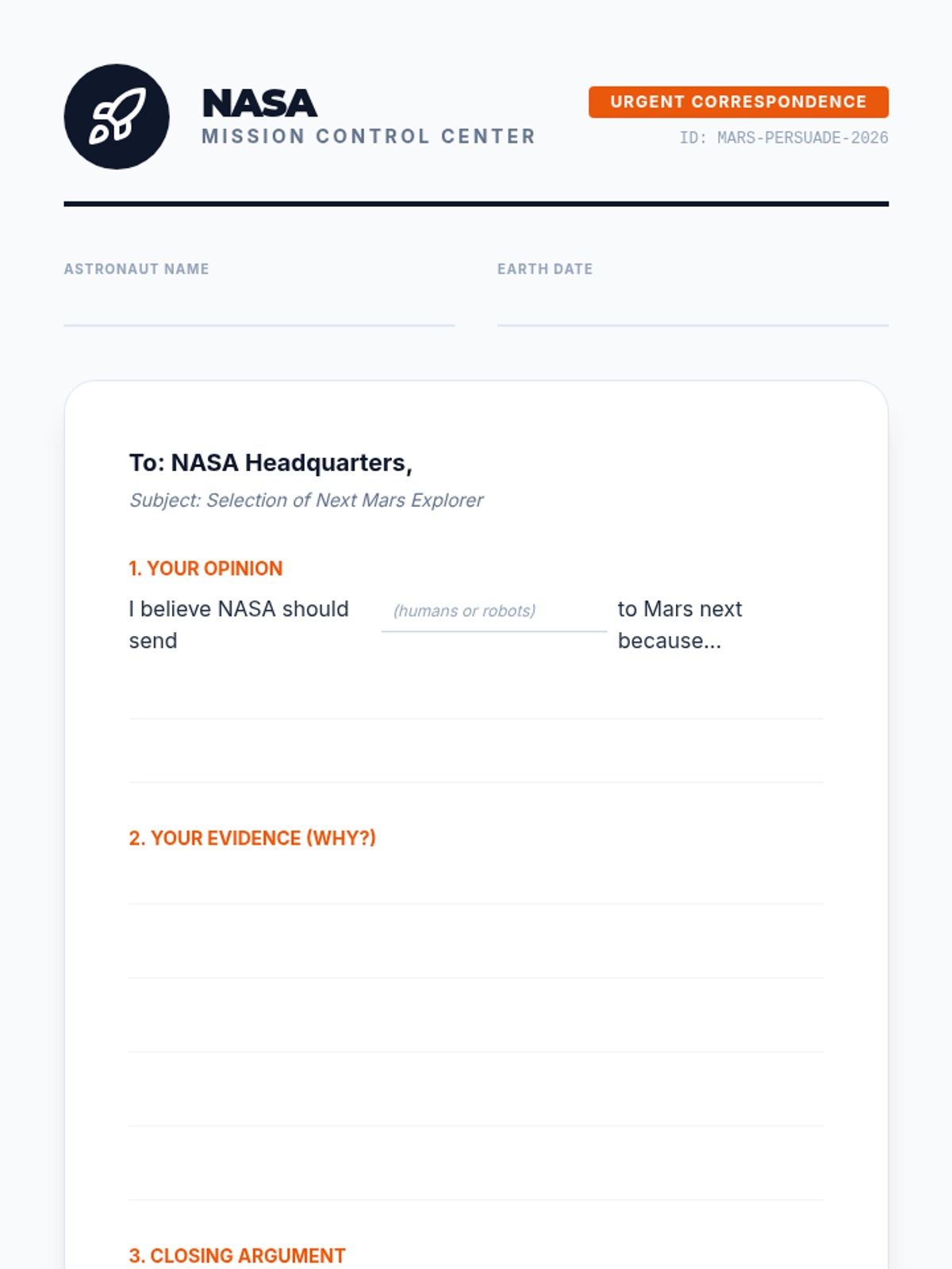 Students will investigate the pros and cons of sending humans versus robots to Mars, using evidence from a SciShow Kids video to form an opinion and write a persuasive letter to NASA.