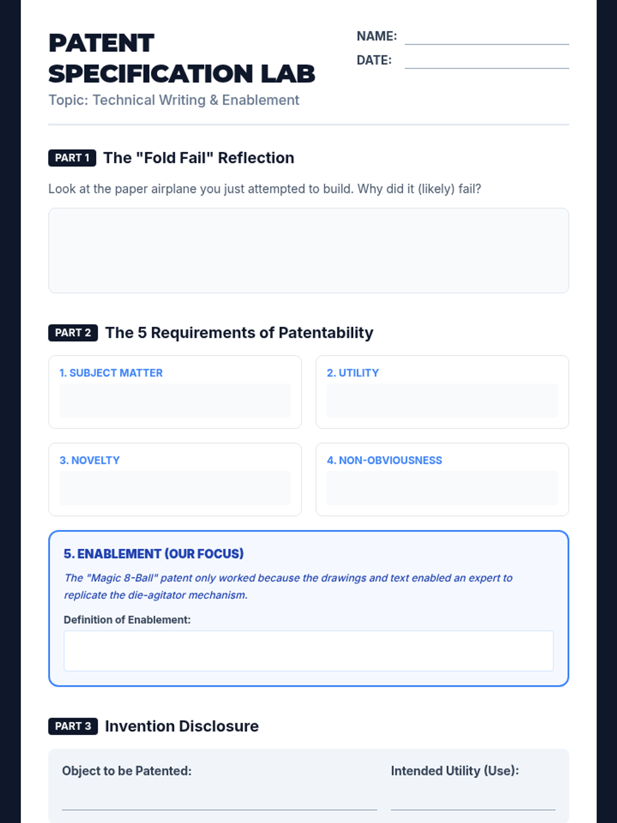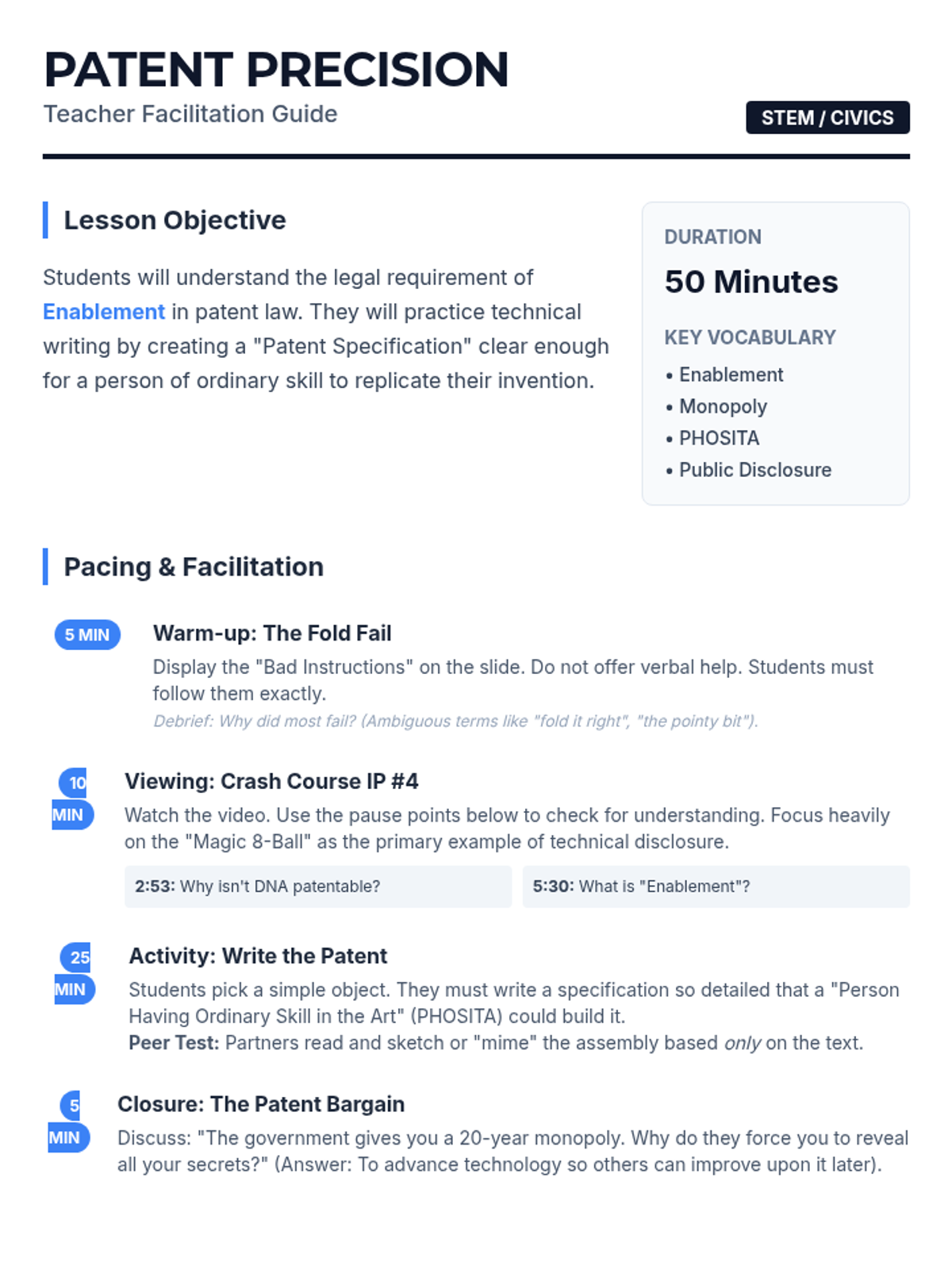 A STEM lesson for middle and high school students exploring the concept of 'enablement' in patent law. Students practice technical writing by creating precise specifications for everyday objects, learning how clear communication is the required 'price' for a legal monopoly.