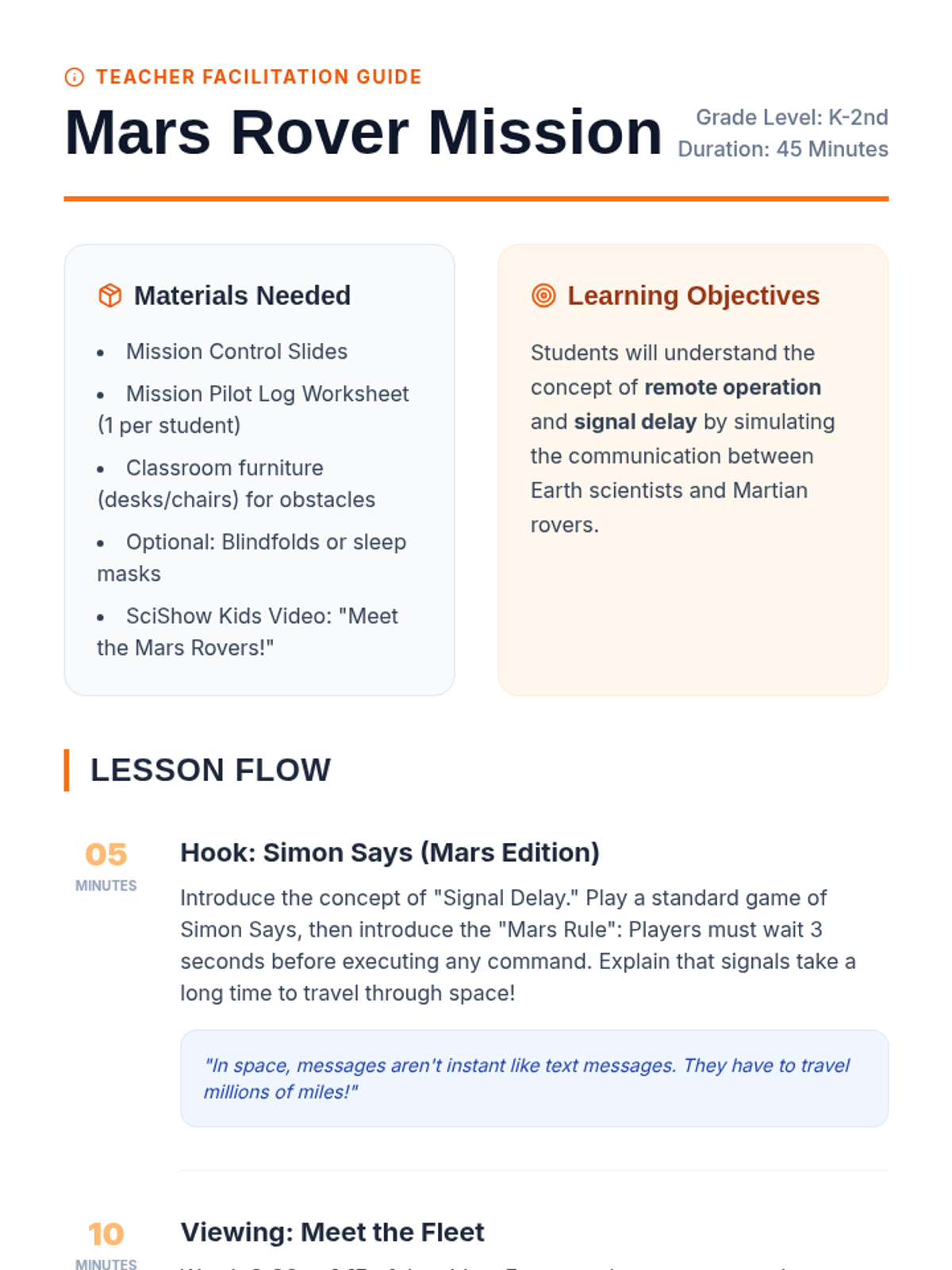 In this lesson for K-2nd grade, students explore the concept of remote-controlled space exploration. Through a 'Simon Says' hook, a video introduction to Mars rovers, and a hands-on partner activity simulating remote navigation, students learn how scientists control vehicles on other planets and the challenges of communicating over long distances.