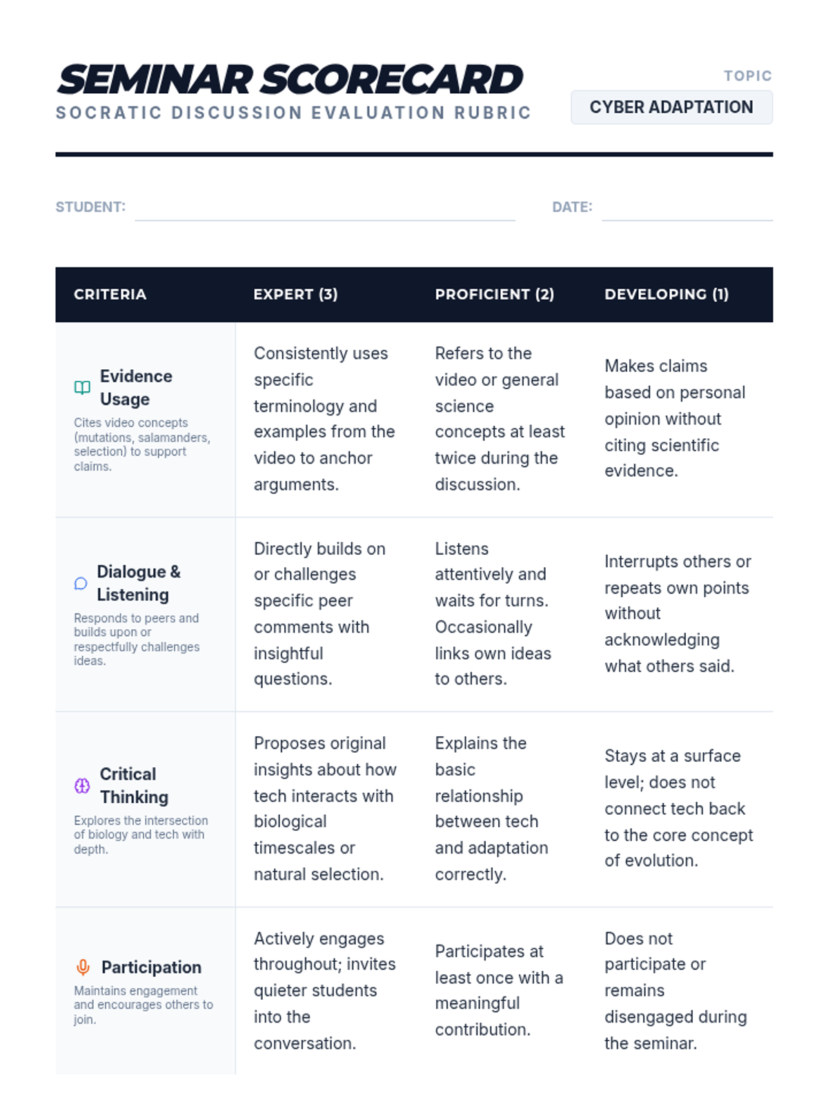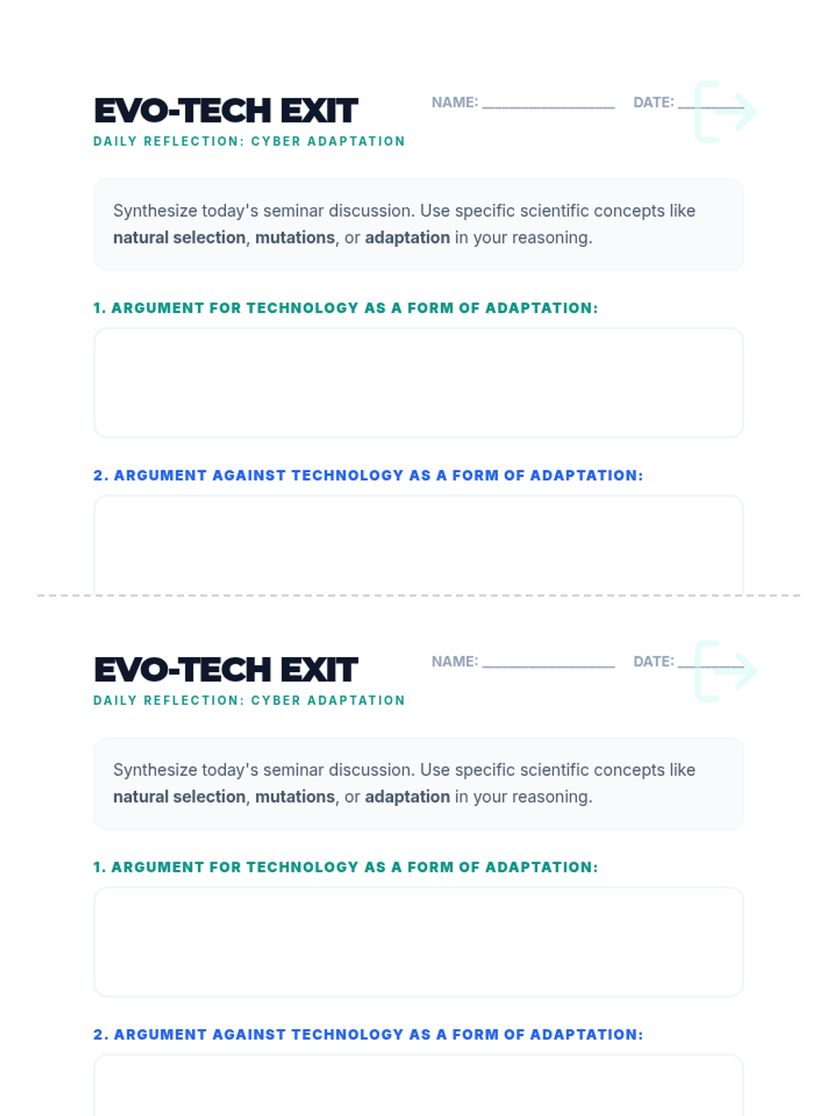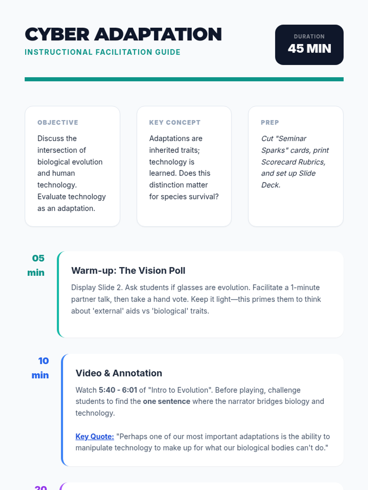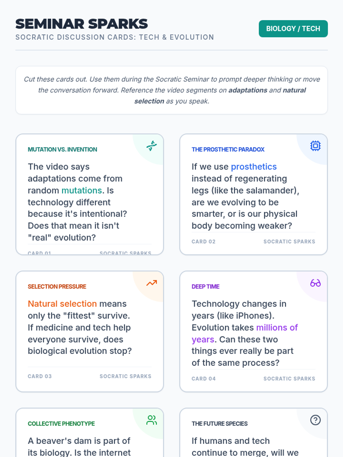 This lesson explores the intersection of biological evolution and human technology, questioning whether technology is a form of human adaptation or if it halts natural selection. Students participate in a Socratic Seminar using evidence from a video on foundational evolutionary biology.