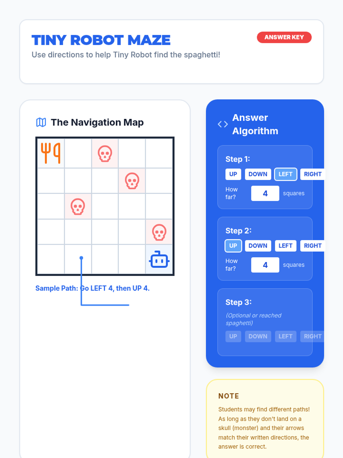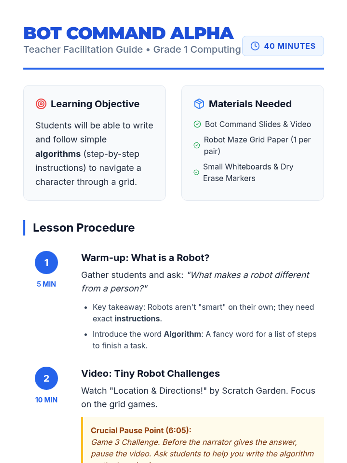 Students will learn the basics of algorithms by watching a robot-themed video and participating in a 'Partner Programmer' activity where they give and follow step-by-step instructions on a grid.