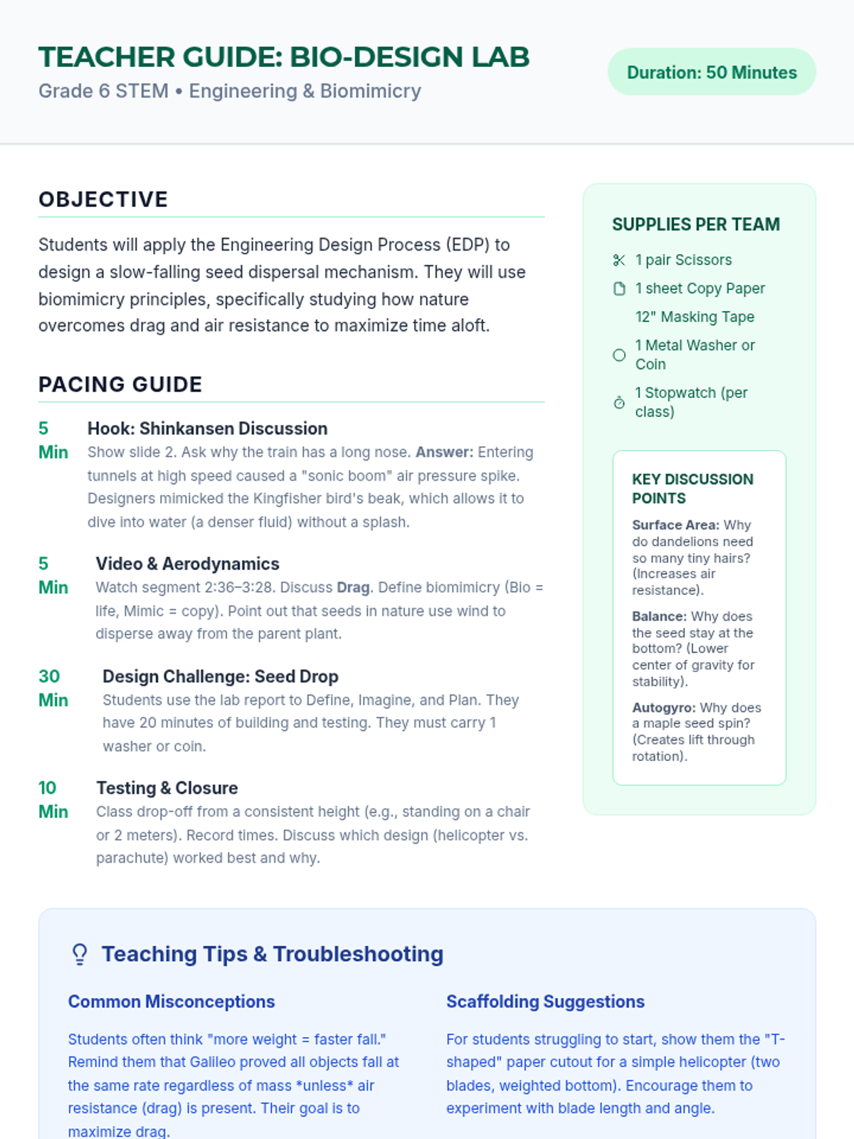 Students explore the world of biomimicry by analyzing the aerodynamics of the Shinkansen train and birds, culminating in a design challenge where they create a slow-falling seed carrier inspired by nature's dispersal methods.