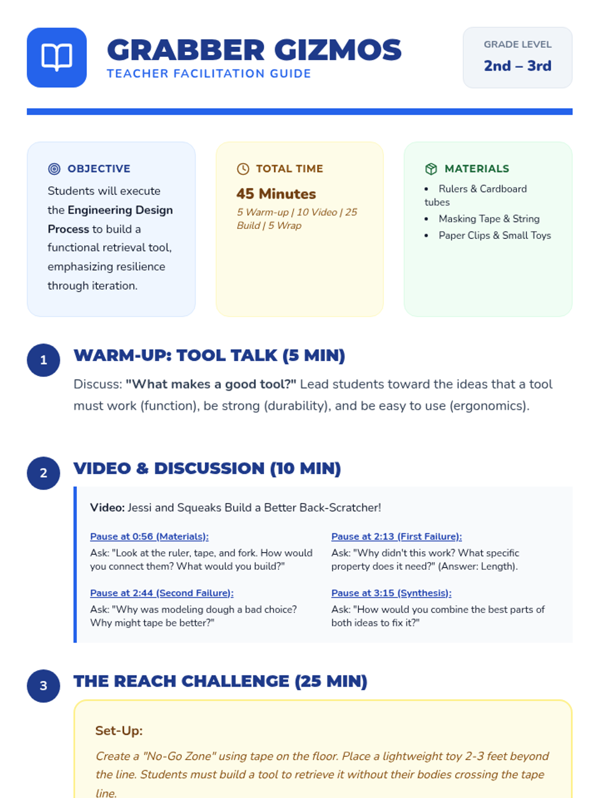 A Kindergarten and 1st Grade introduction to the engineering design process, focusing on identifying problems and brainstorming solutions through drawing. Students watch a video about building a back-scratcher and then design their own solution to a common classroom problem.