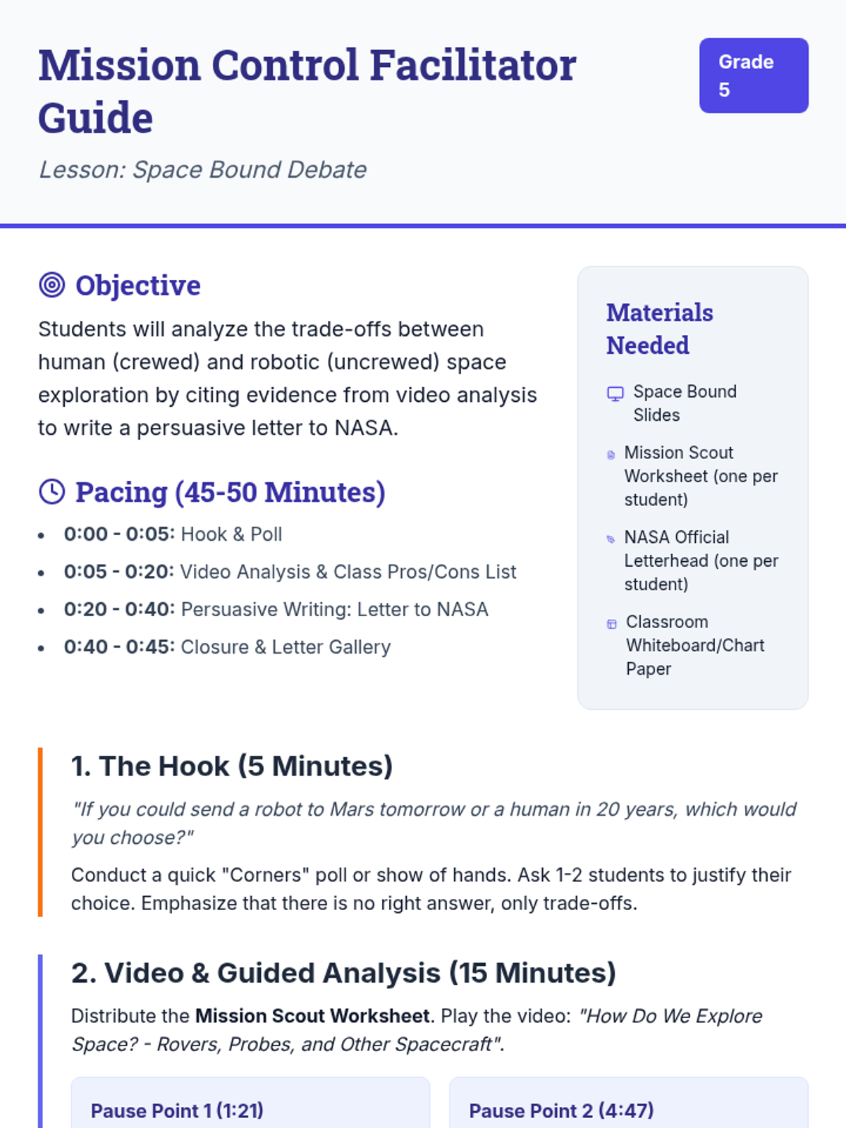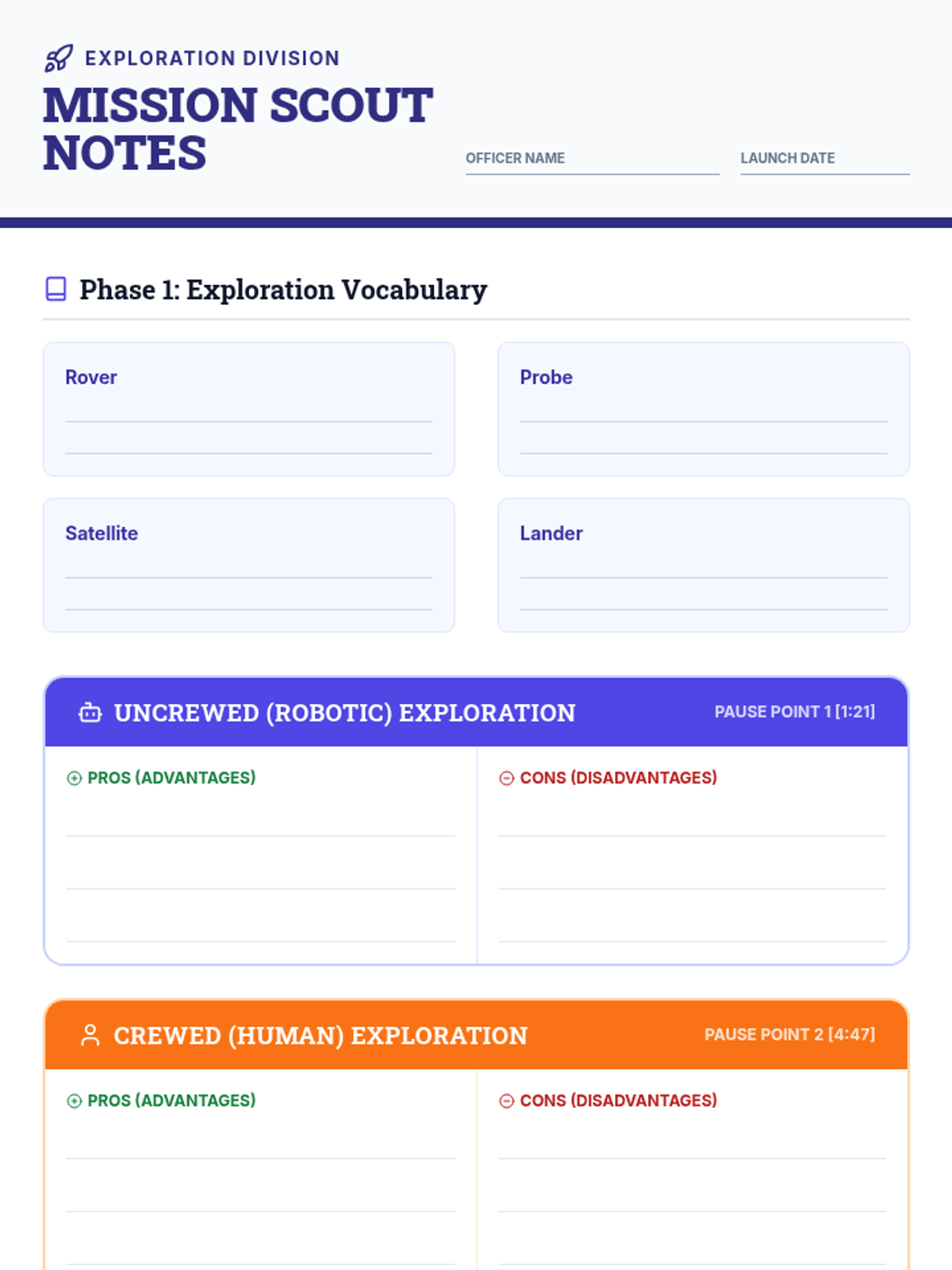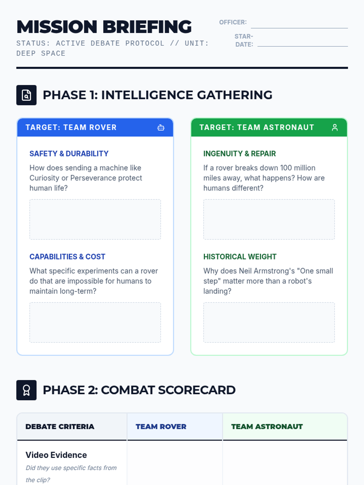 A high-energy lesson where students compare and contrast robotic vs. human space exploration, culminating in a structured debate using evidence from the 'Space Exploration – Beyond Our Planet' video.