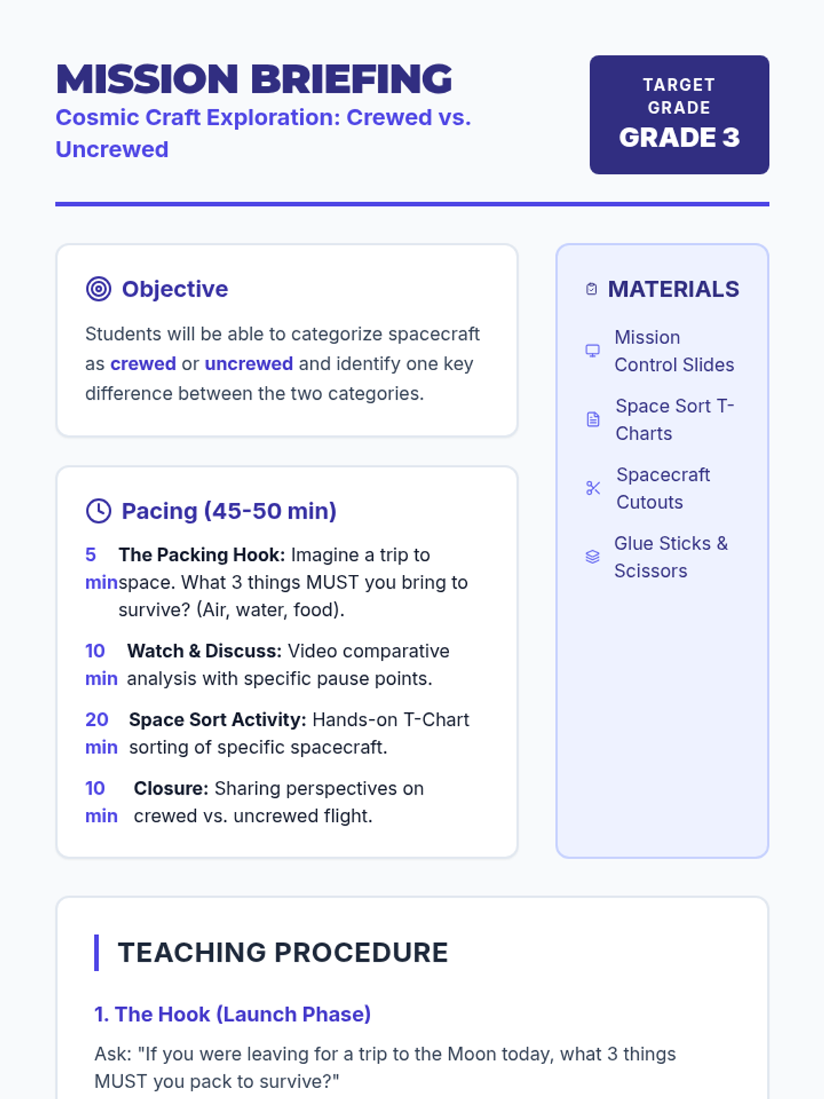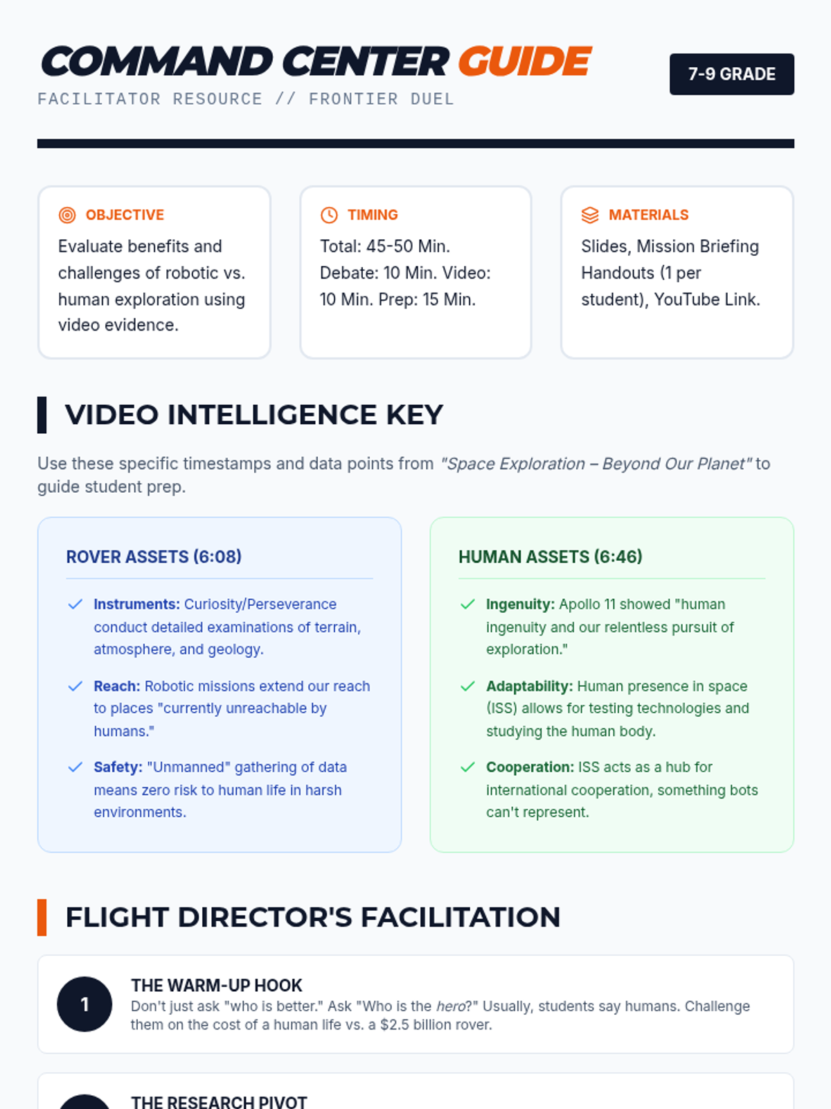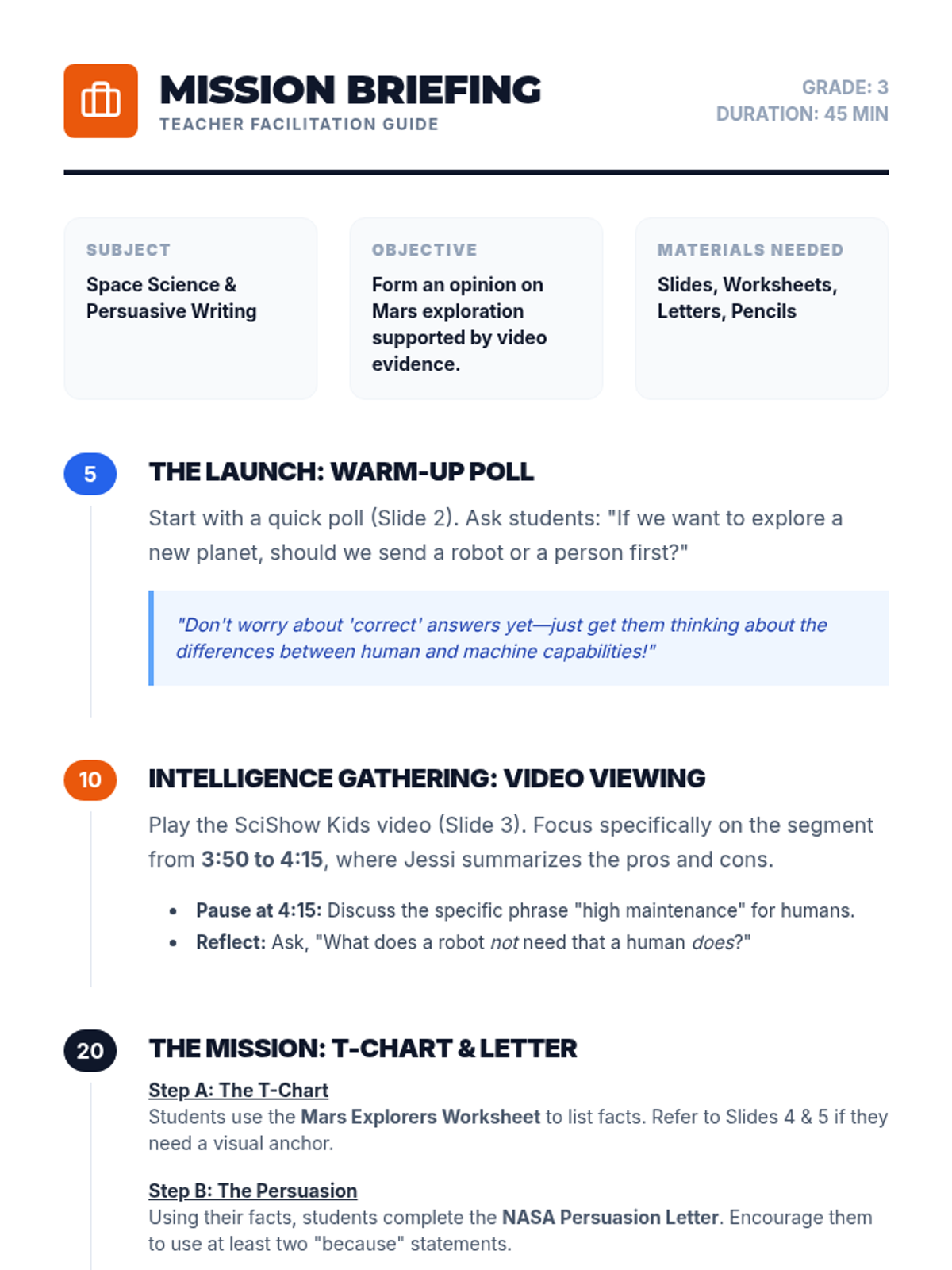 A high-energy lesson where students compare and contrast robotic vs. human space exploration, culminating in a structured debate using evidence from the 'Space Exploration – Beyond Our Planet' video.