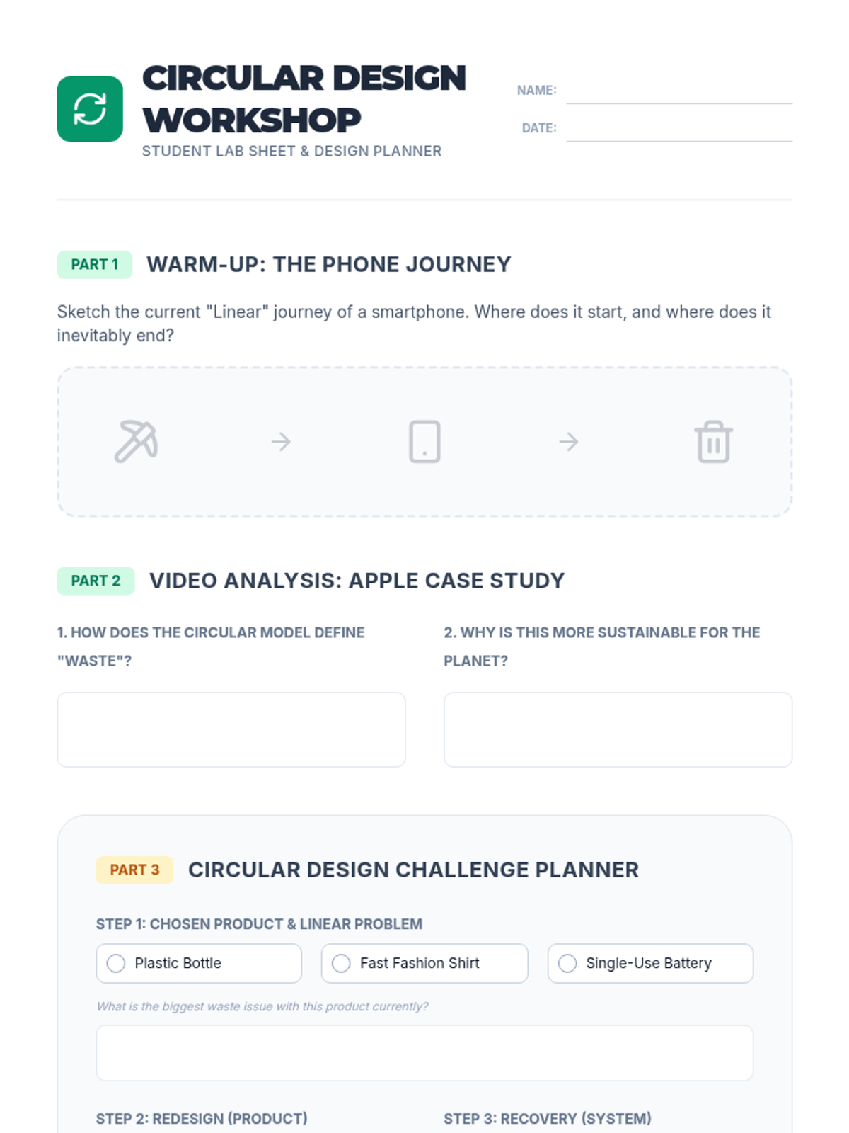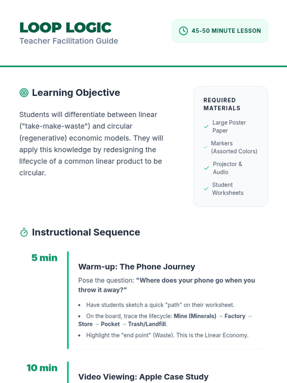 Students investigate the shift from 'take-make-waste' linear economies to regenerative circular models, using Apple's sustainability efforts as a case study before designing their own circular product lifecycles.