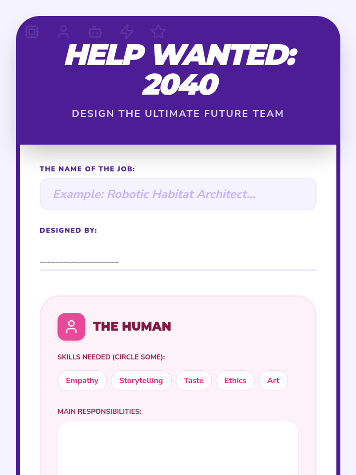 In this culminating activity, students invent a future job where a human and an AI tool work together as a team. They create a job poster explaining what the human does (empathy, creativity) and what the machine does (calculation, heavy lifting).