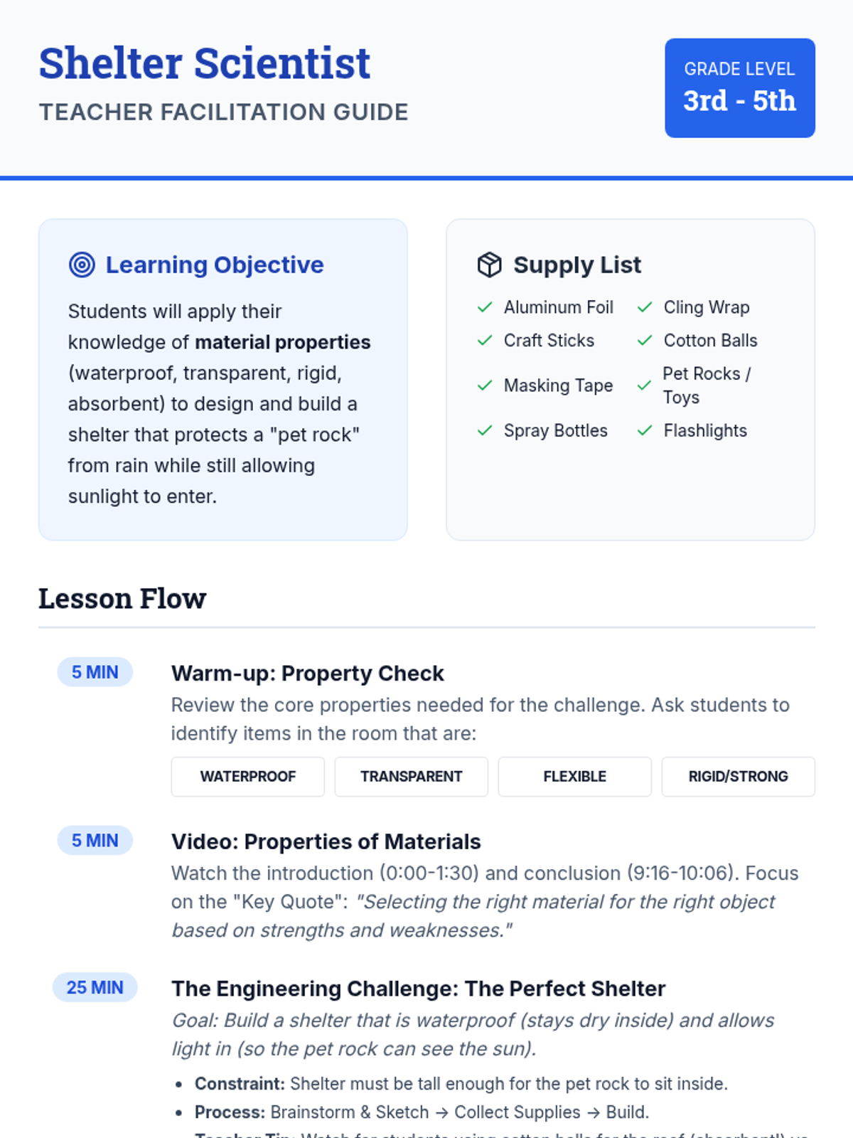 Students explore material properties through an engineering challenge to build a waterproof, light-permeable shelter for a pet rock. This lesson uses video analysis and hands-on testing to connect material characteristics to real-world function.