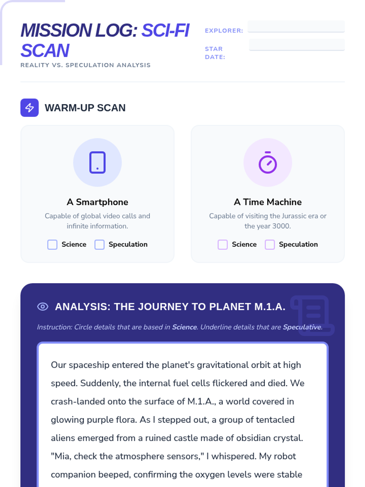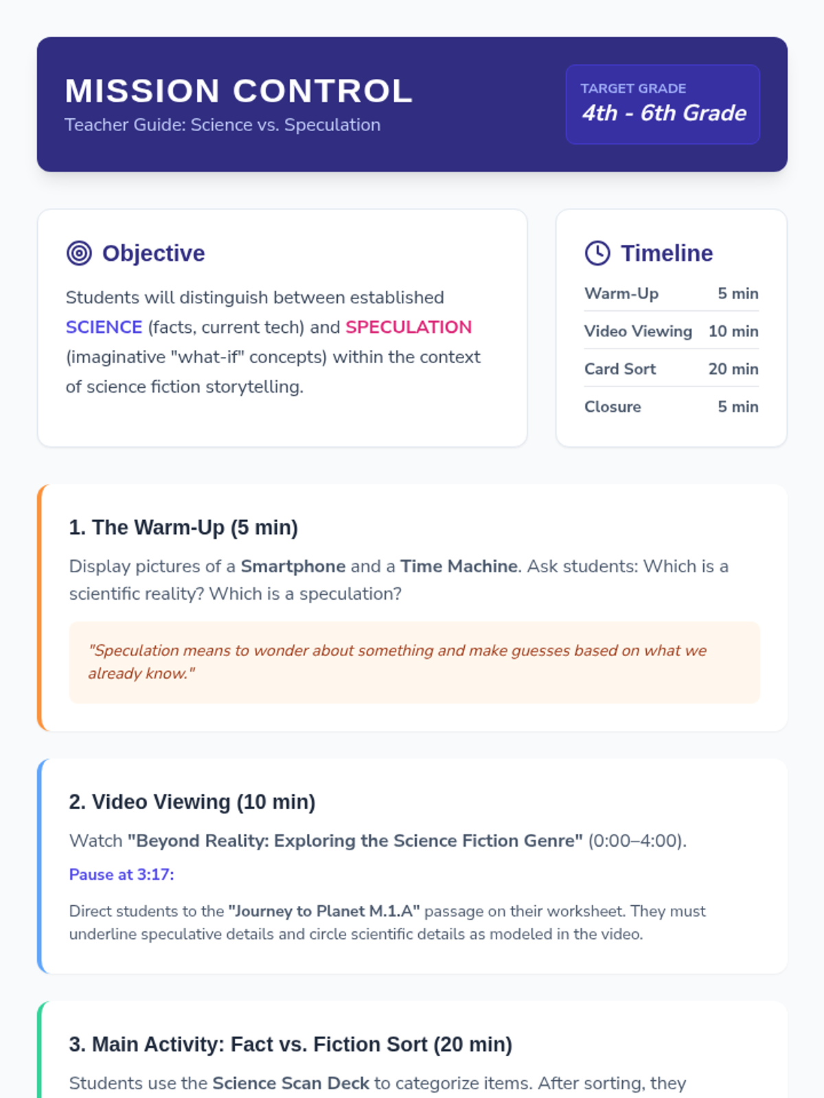A lesson for grades 4-6 exploring the difference between current science and imaginative speculation in science fiction, using a video-based analysis of 'The Journey to Planet M.1.A'.