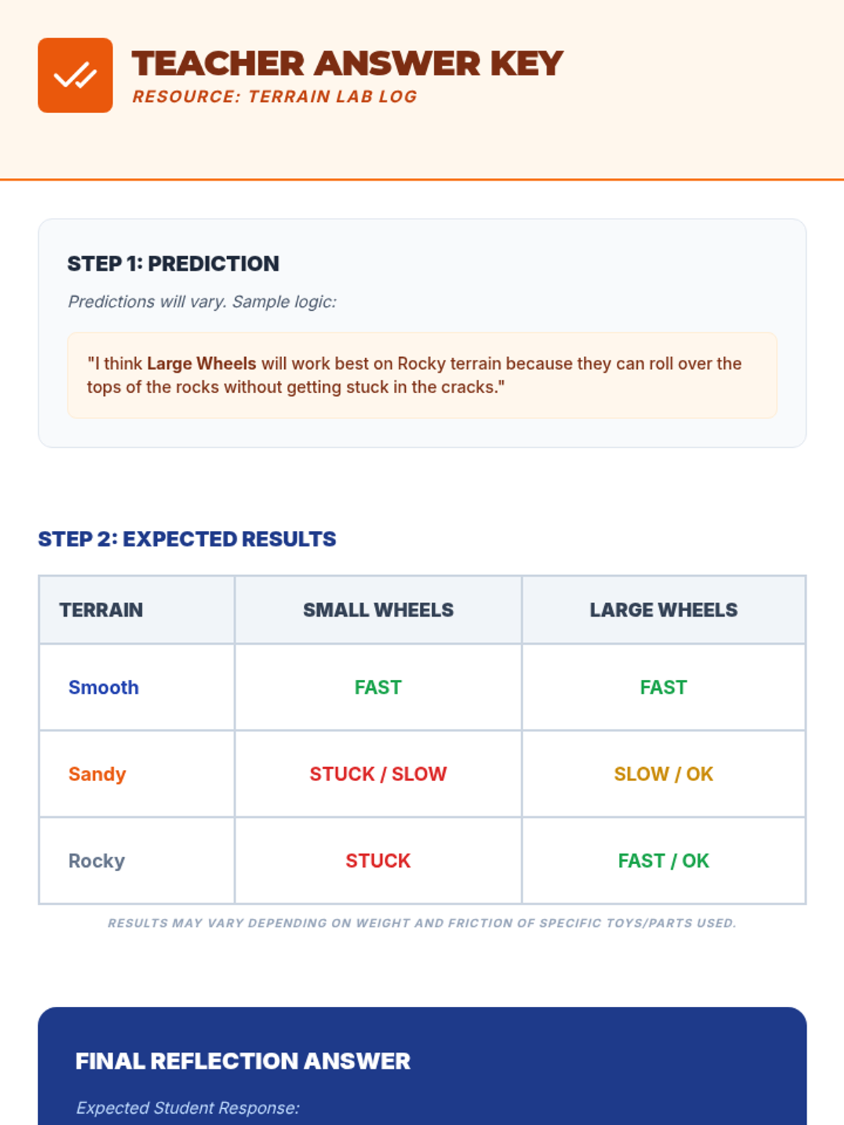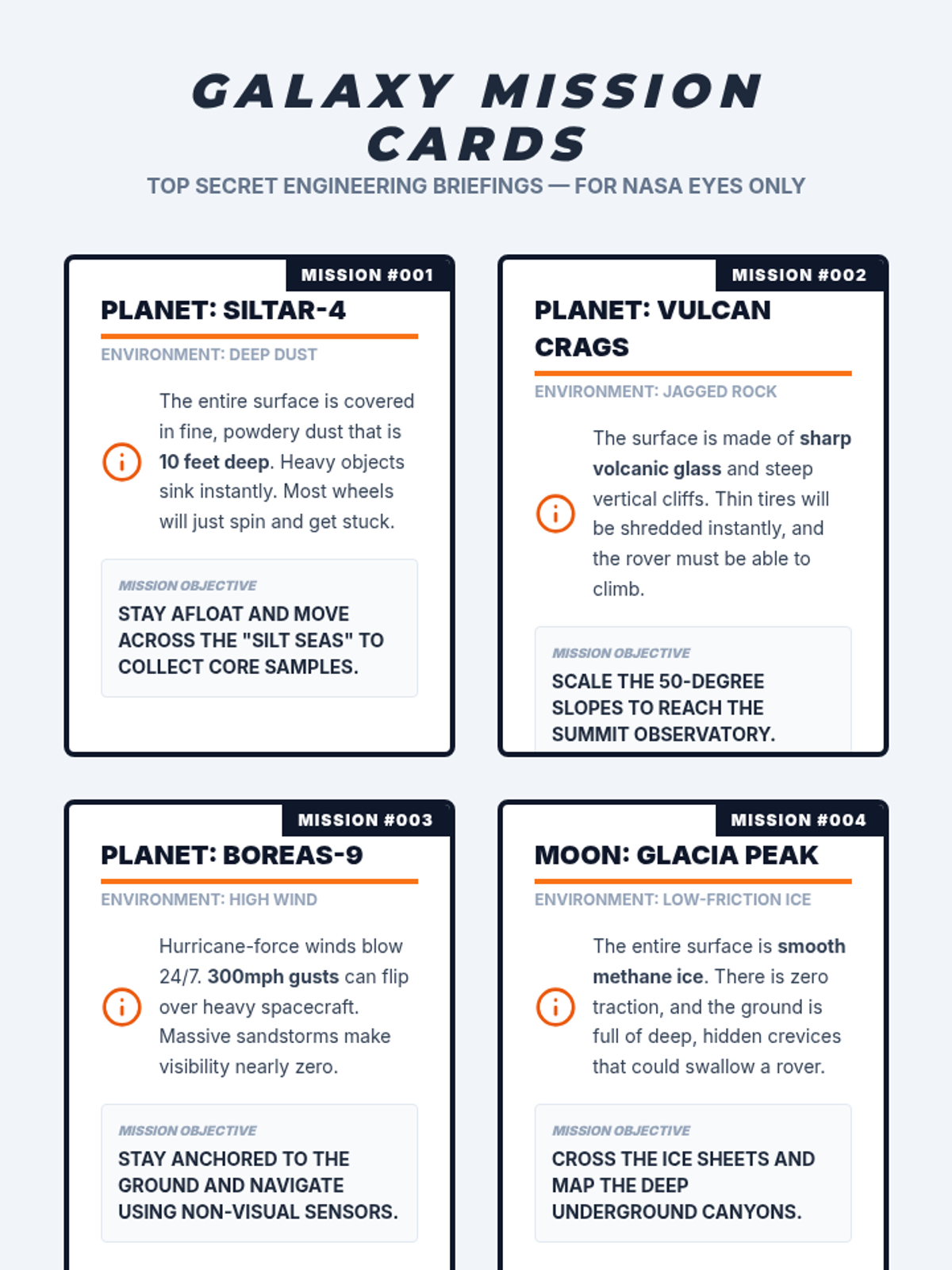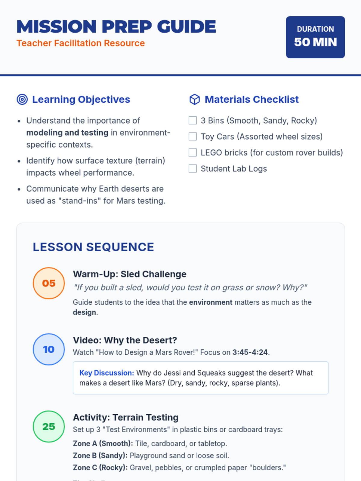 A hands-on engineering lesson where students explore how different terrains affect vehicle performance, modeling NASA's process for testing Mars rovers in Earth's deserts. Students will build and test toy or LEGO cars across varied surfaces to understand why engineers test designs in specific environments.
