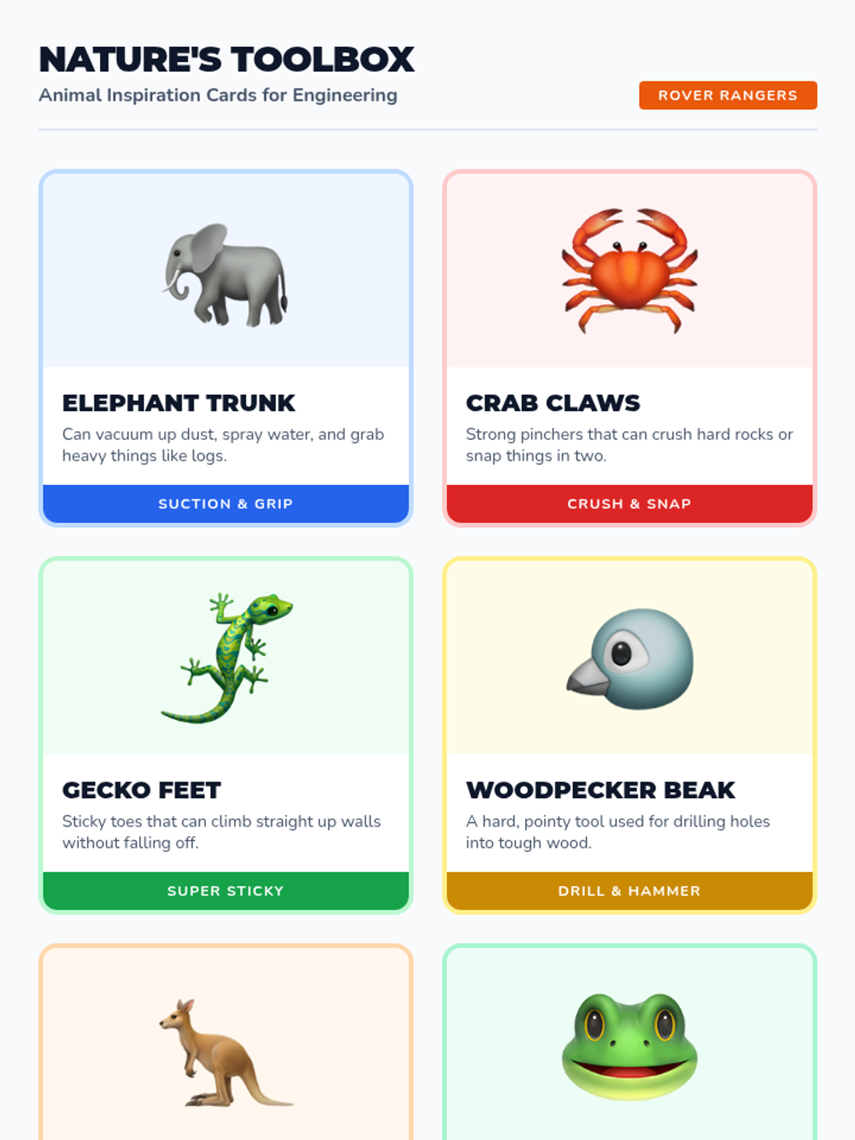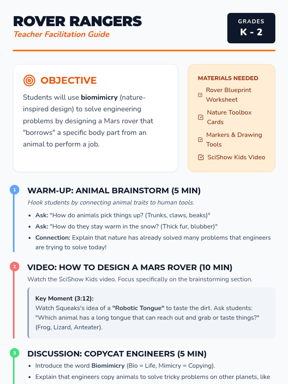 Students explore biomimicry by designing Mars rovers inspired by animal body parts, using the SciShow Kids video 'How to Design a Mars Rover!' as a springboard for engineering design.