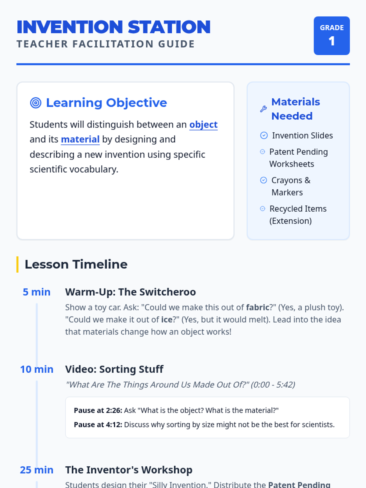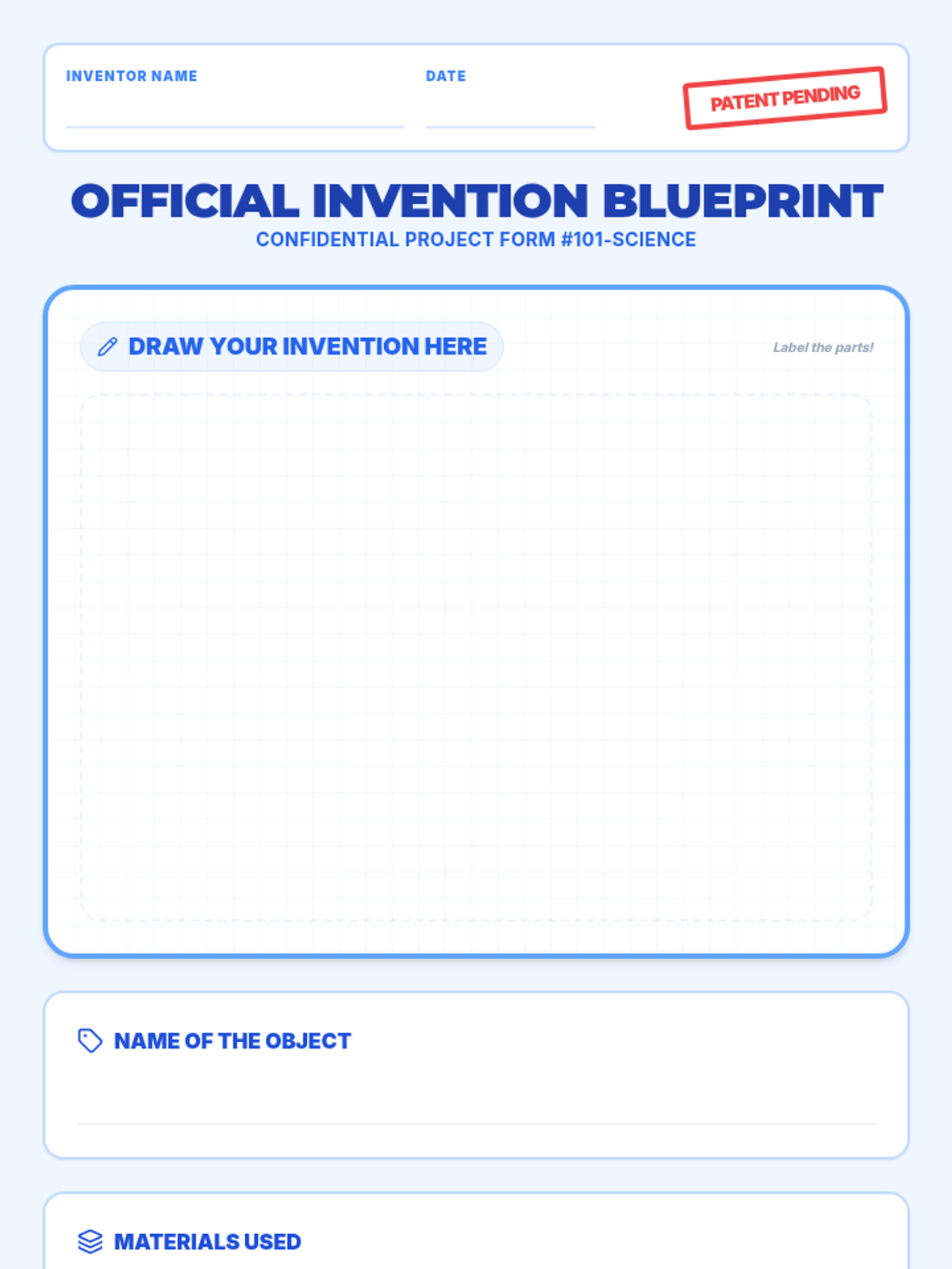 A hands-on science and engineering lesson where 1st graders distinguish between objects and materials by designing their own 'silly' inventions. Students watch a guided video and then complete a blueprint patent form for their new creation.