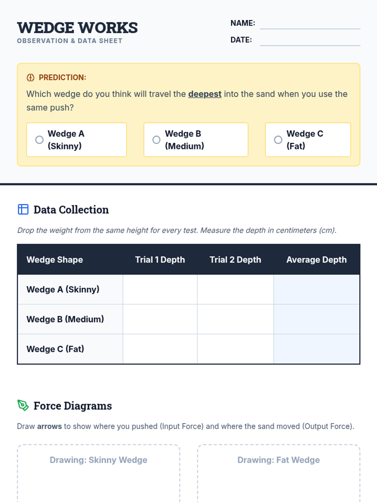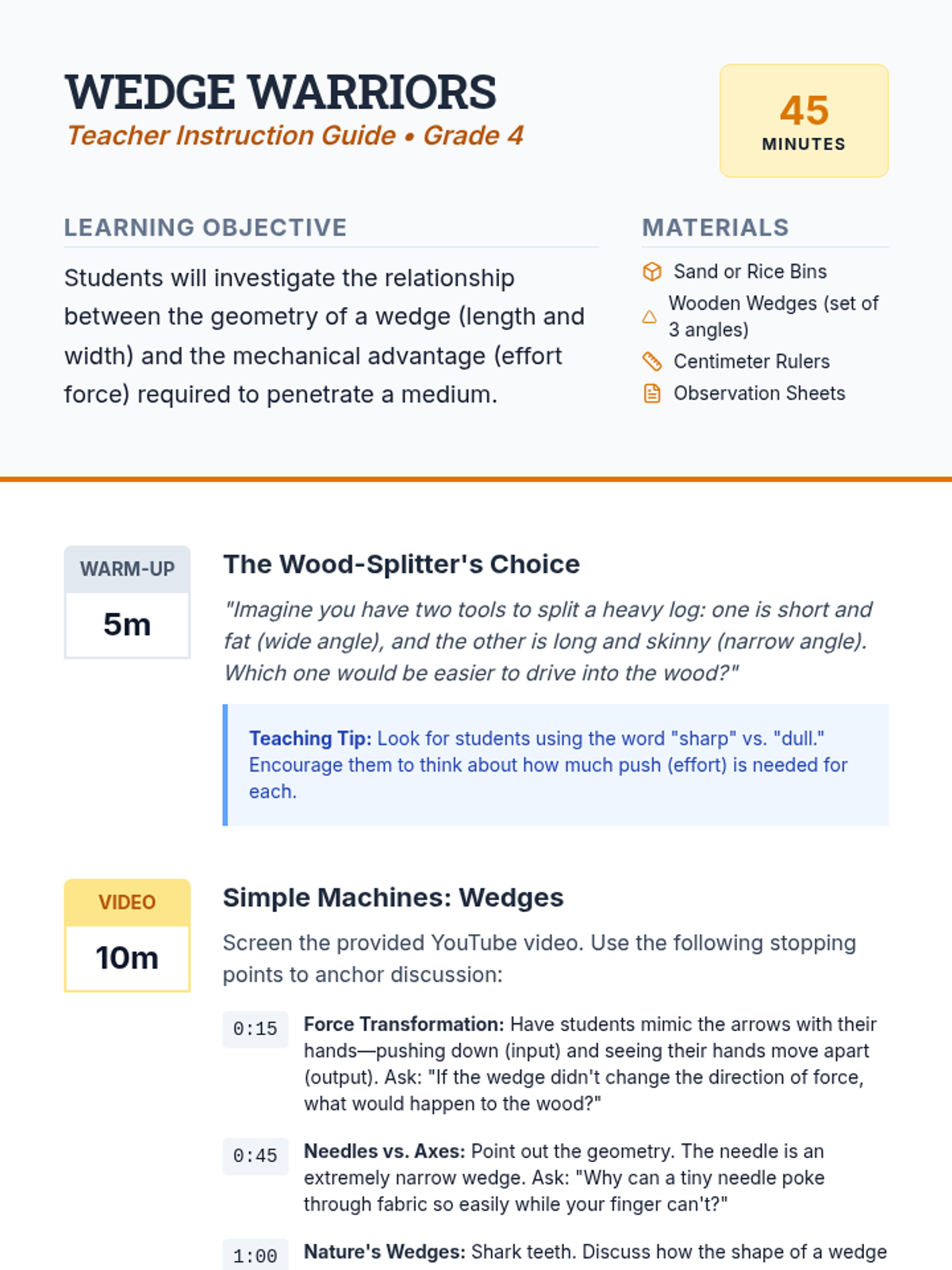 Students will explore how the angle of a wedge affects the force required to move through materials using a sand-bin simulation and video analysis.
