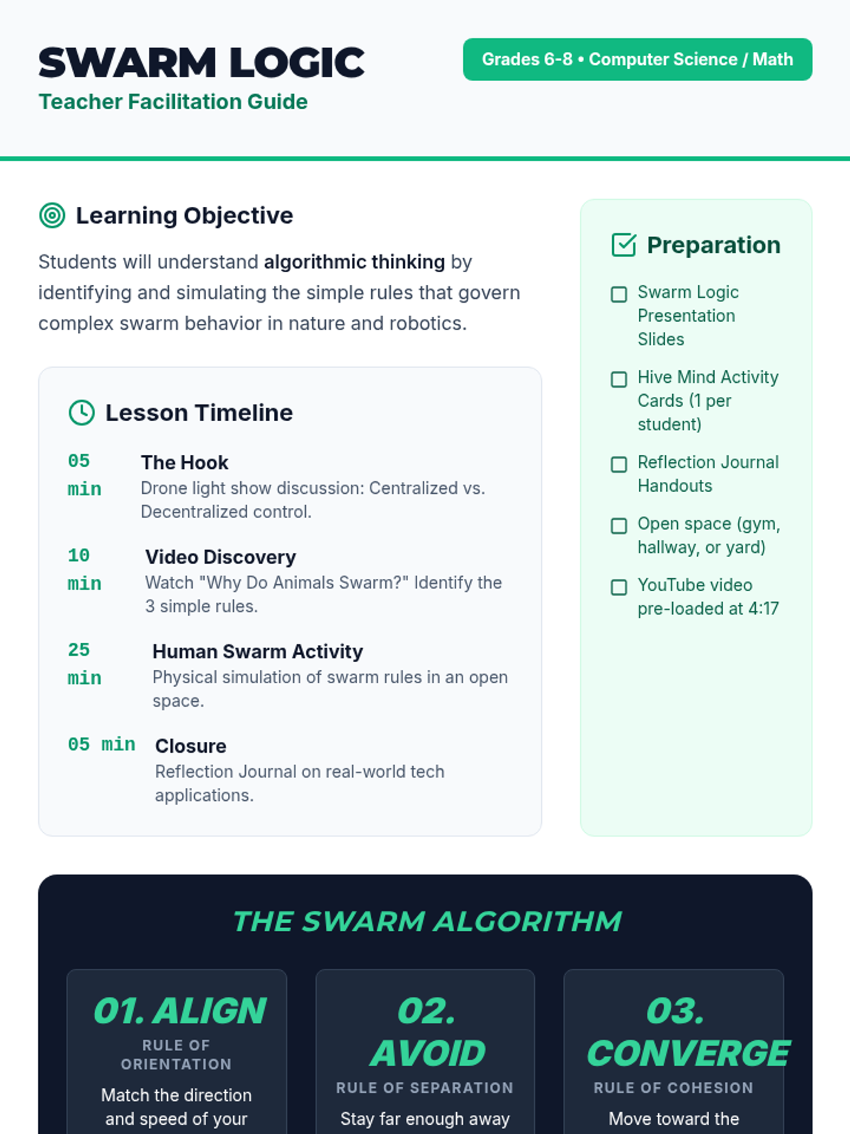 Students explore algorithmic thinking by simulating animal swarm behavior, connecting biological 'simple rules' to computer science and robotics. The lesson includes a video analysis, a physical human simulation, and a reflection on real-world applications.