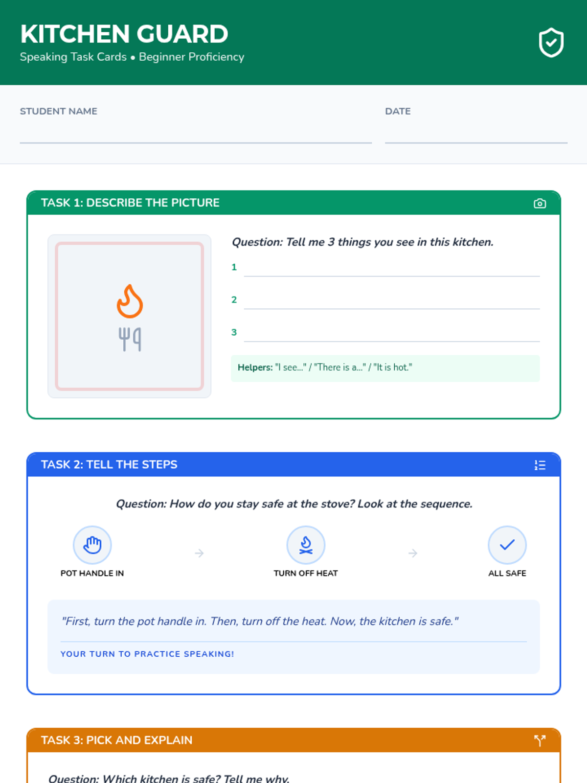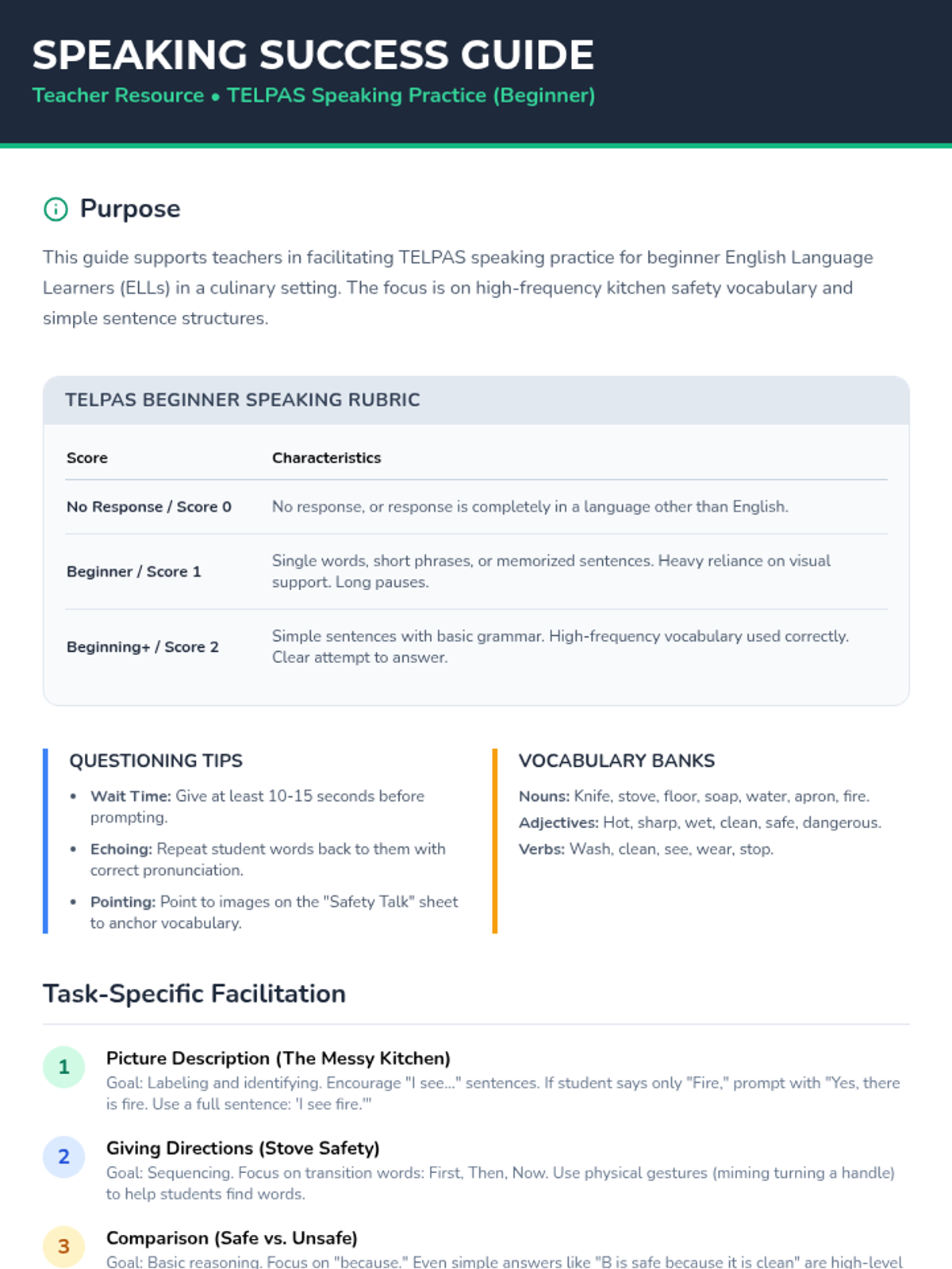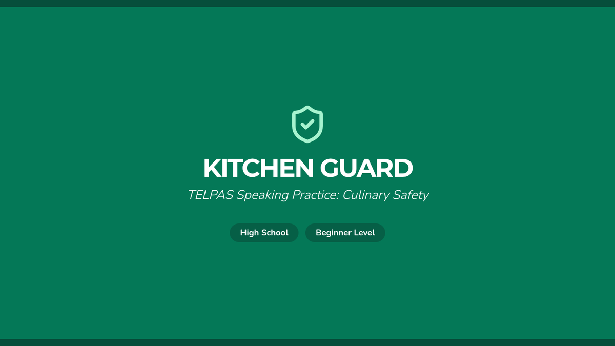 A specialized TELPAS speaking practice lesson for high school beginner English learners focused on kitchen safety procedures in culinary arts. Includes visual prompts, vocabulary building, and structured speaking tasks.