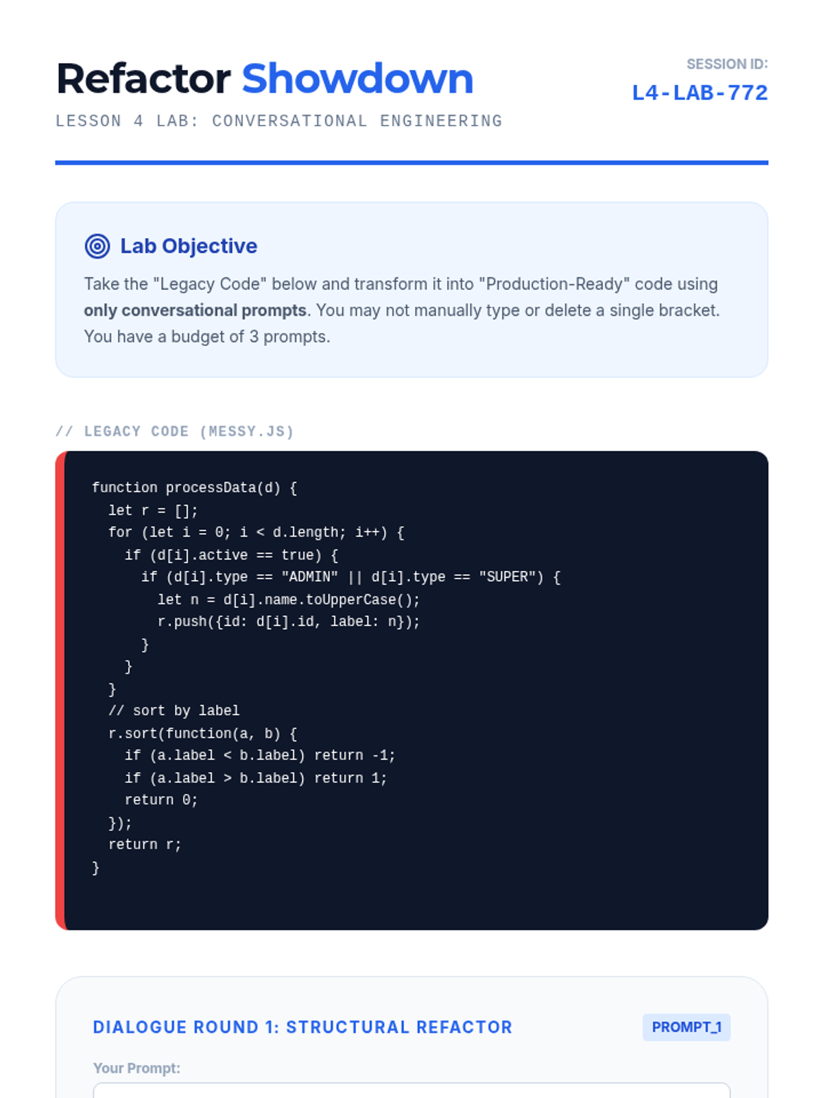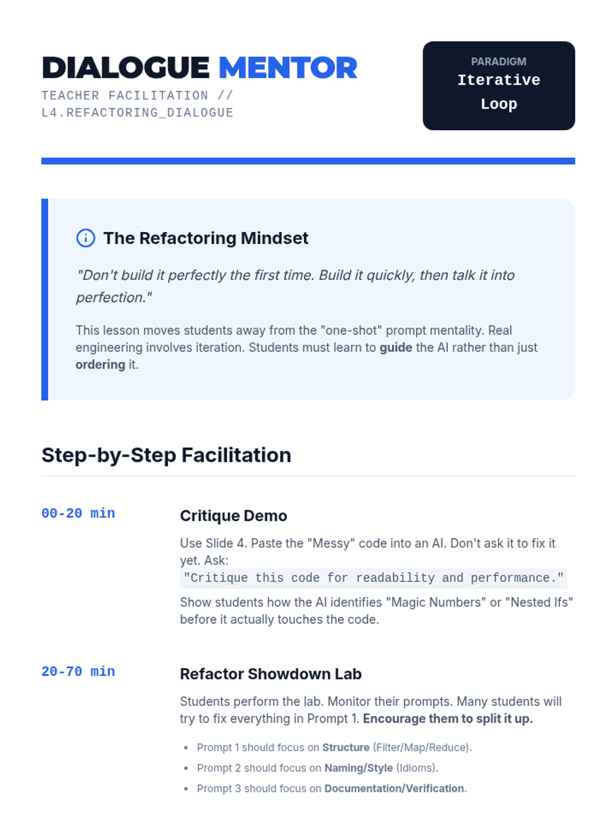 The sequence ends with a focus on cleanup. Students take a working but messy conversation-generated codebase and use final prompts to standardize variable names, add comments, and format the code for human readability.