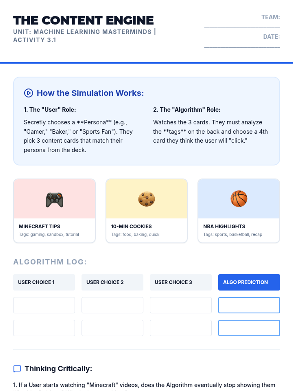 Students simulate how platforms like YouTube or Netflix predict content preferences and discuss the impact of recommendation loops on digital habits.