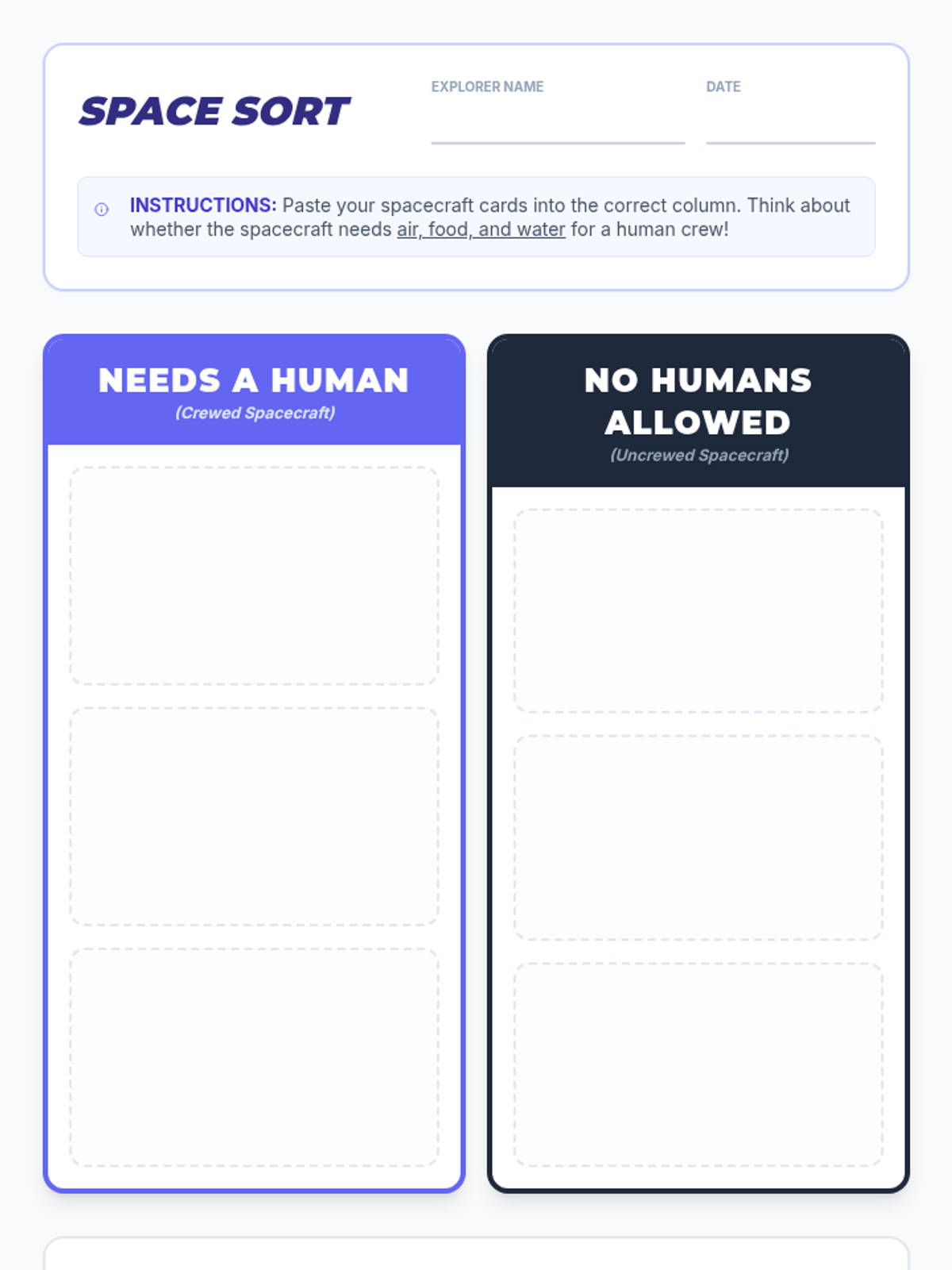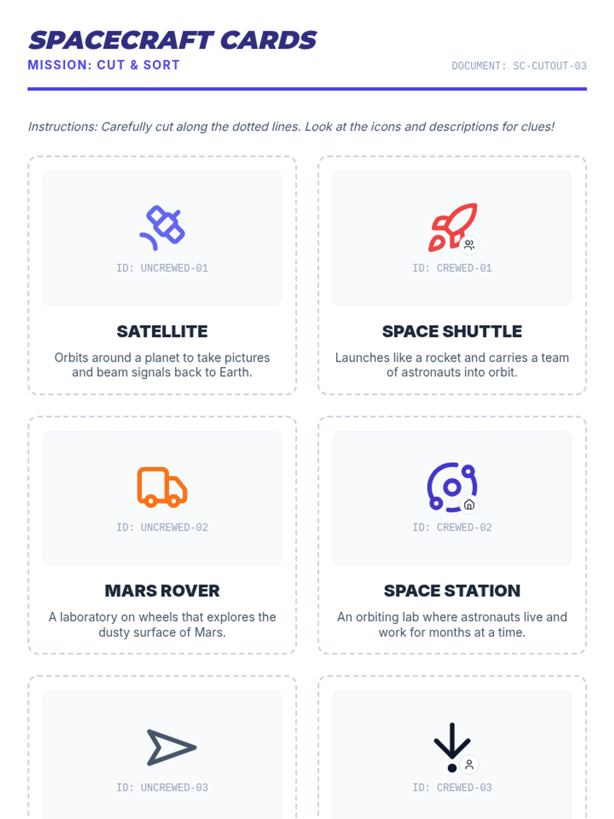 Students explore the differences between crewed and uncrewed spacecraft through a comparative video analysis and a hands-on sorting activity. They will learn how humans and robots have different needs and capabilities when exploring the cosmos.