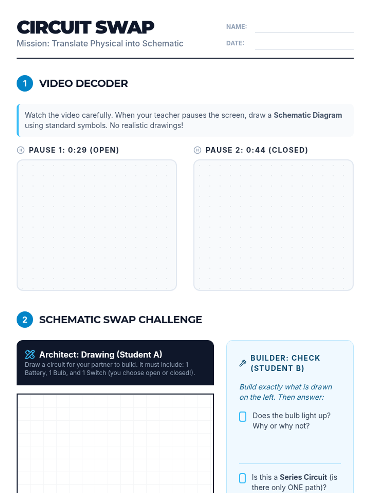 Students will learn to translate physical electrical circuits into standard schematic diagrams using symbols. They will practice identifying components from a video demonstration and participate in a 'Schematic Swap' peer activity to build circuits from technical drawings.