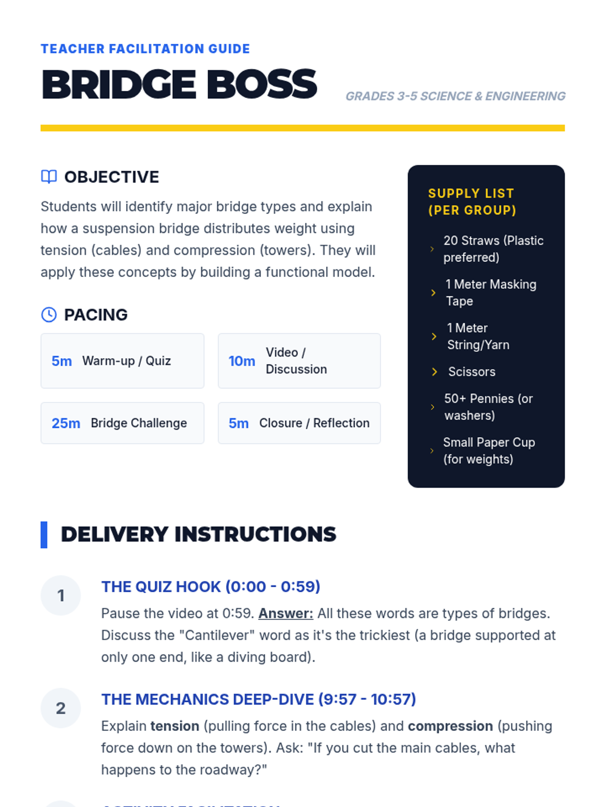 A hands-on engineering lesson where students explore different bridge types, specifically focusing on the mechanics of suspension bridges through the lens of the Golden Gate Bridge. Students build and test their own straw bridges to understand forces like tension and compression.