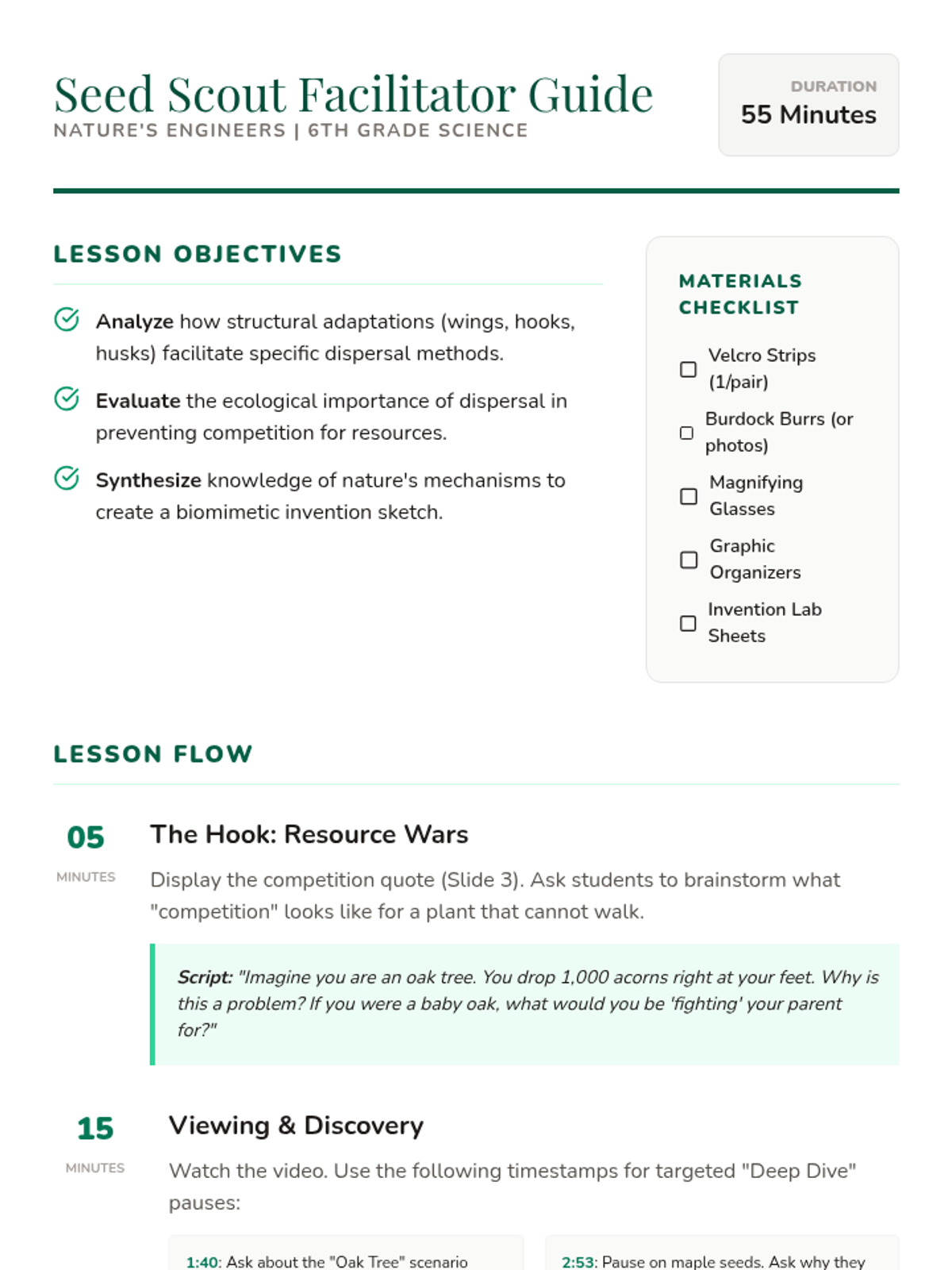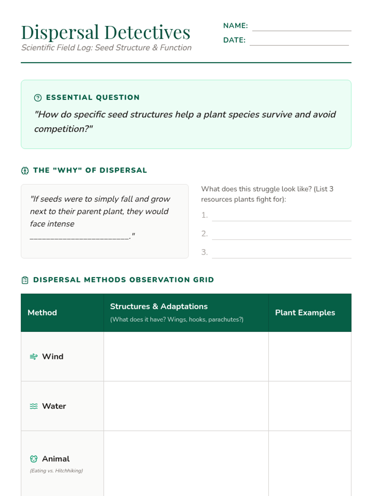 Students will investigate the ingenious methods plants use to move their seeds, analyzing the relationship between structure and function. They will apply these concepts through a biomimicry activity based on burdock seeds and an engineering design challenge based on explosive dispersal.