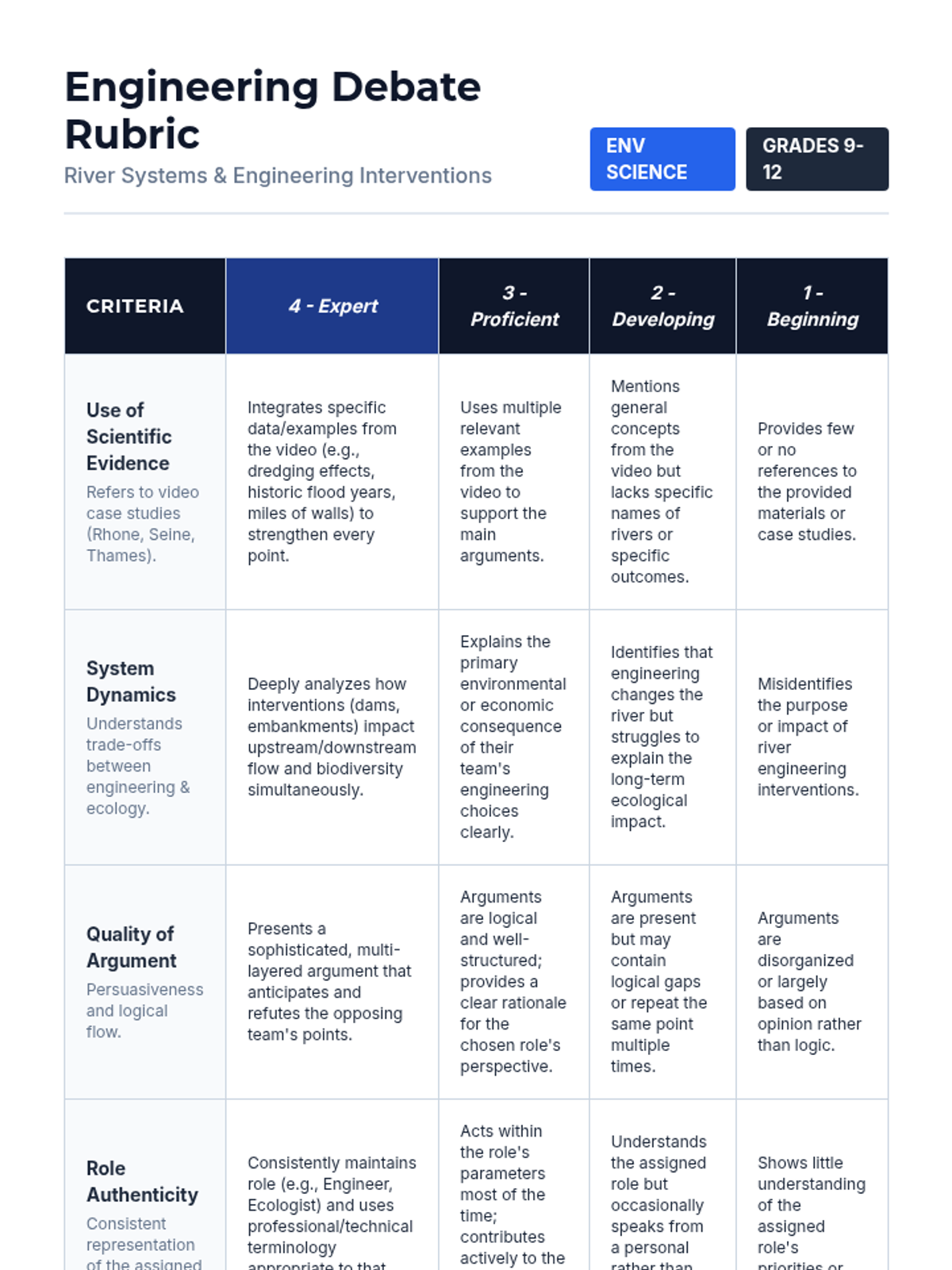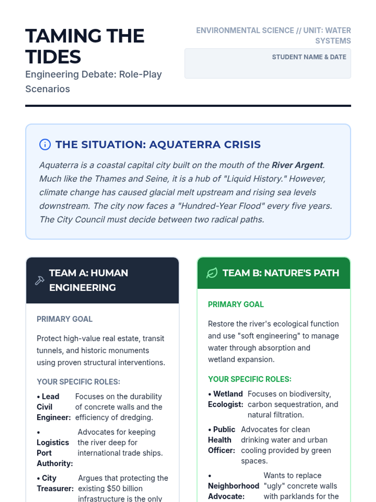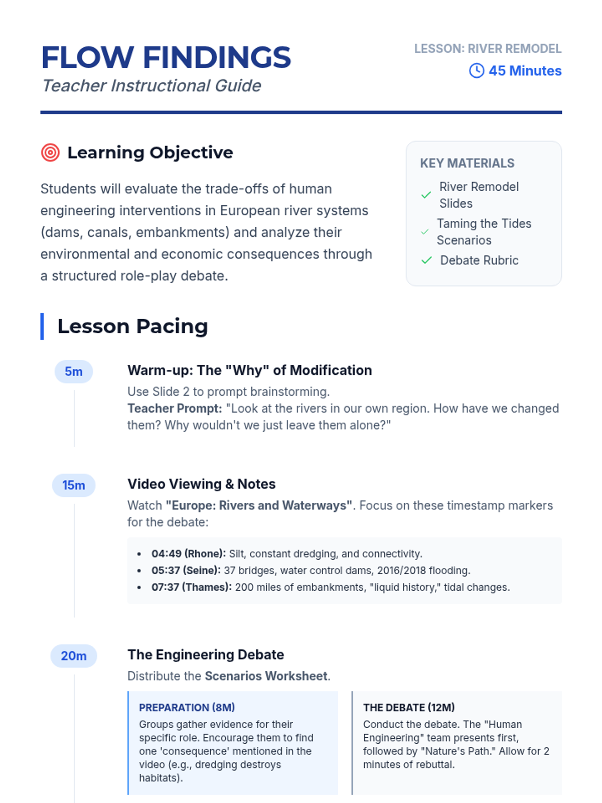 A high school environmental science lesson exploring the trade-offs between human engineering (dams, embankments, dredging) and natural river systems, featuring a case-study debate based on major European rivers.