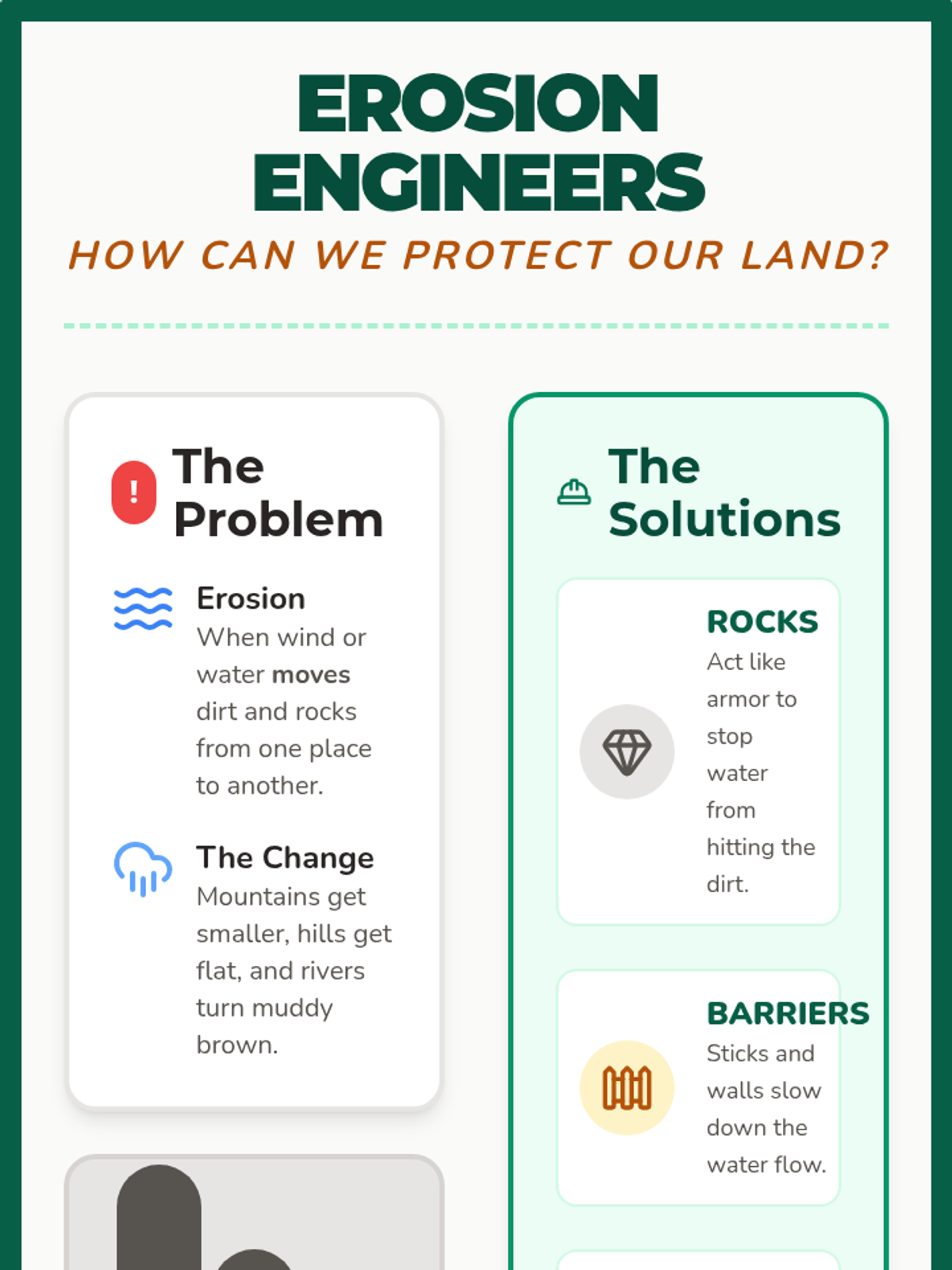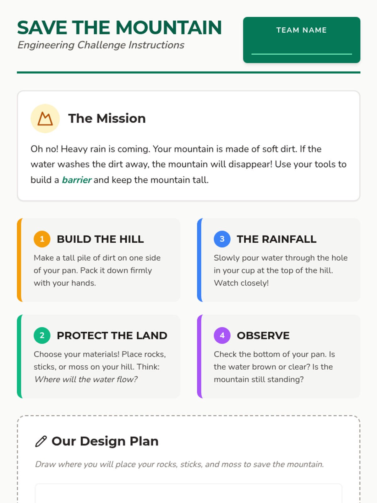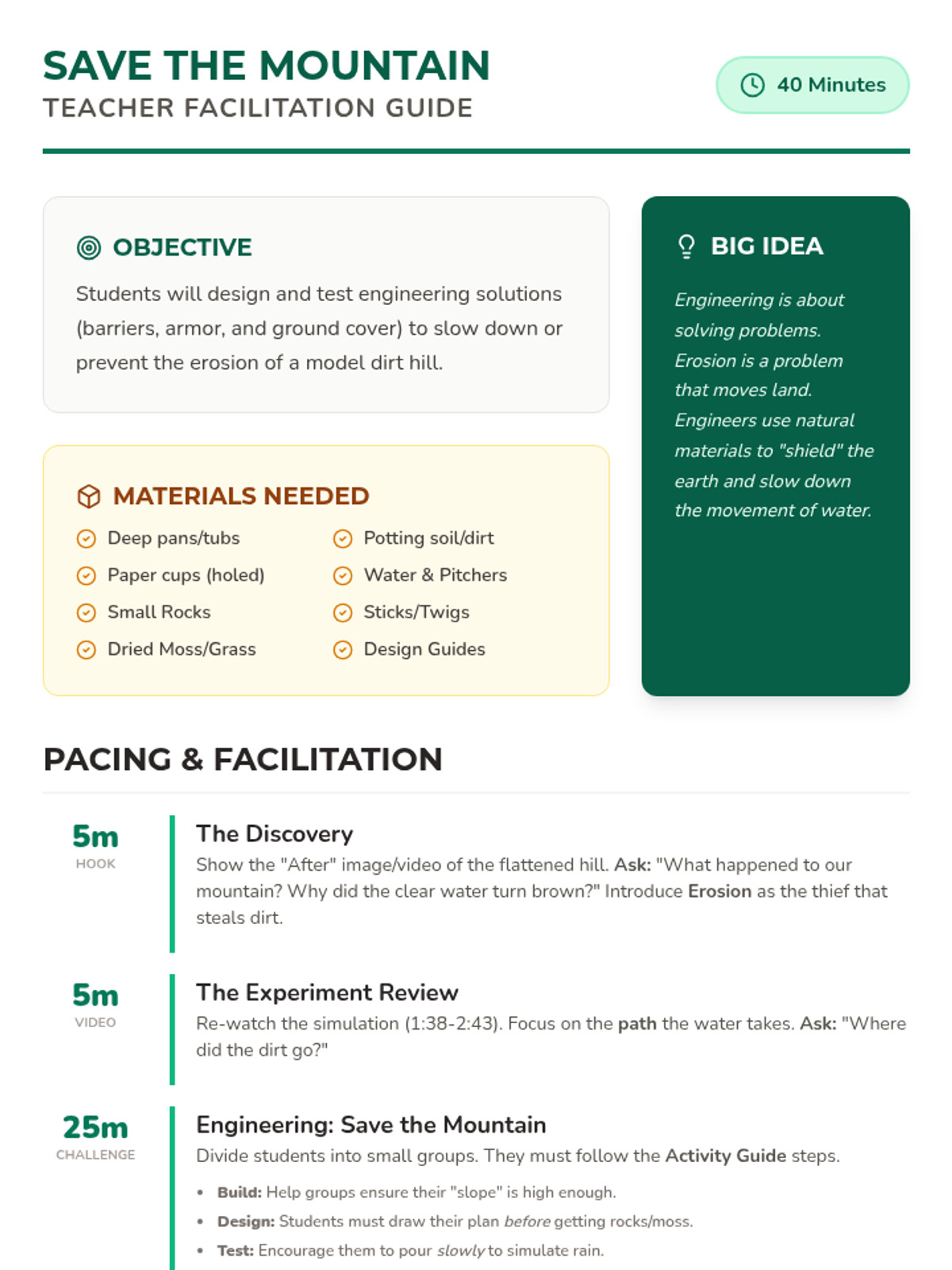 In this hands-on engineering lesson, 2nd-grade students explore how to slow down erosion. They will build a model hill and test various natural materials like rocks, sticks, and moss to see which engineering solutions best protect the land from water.