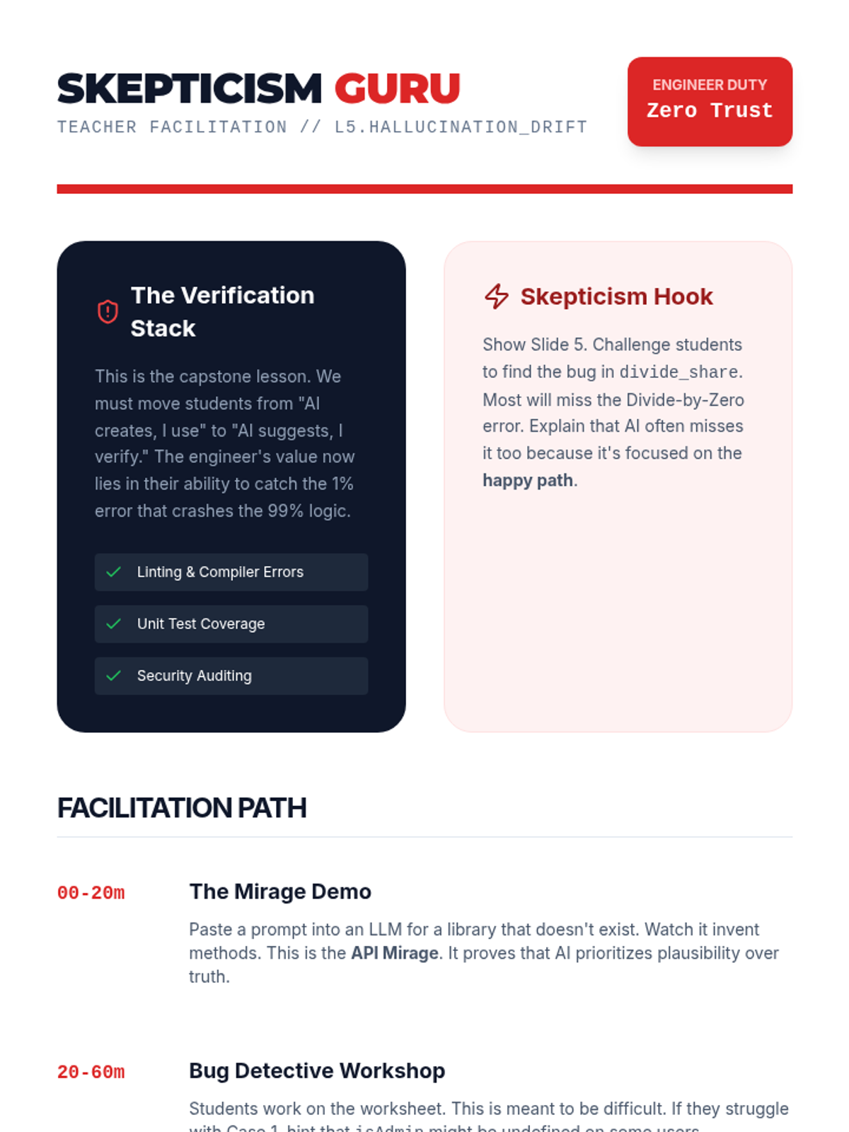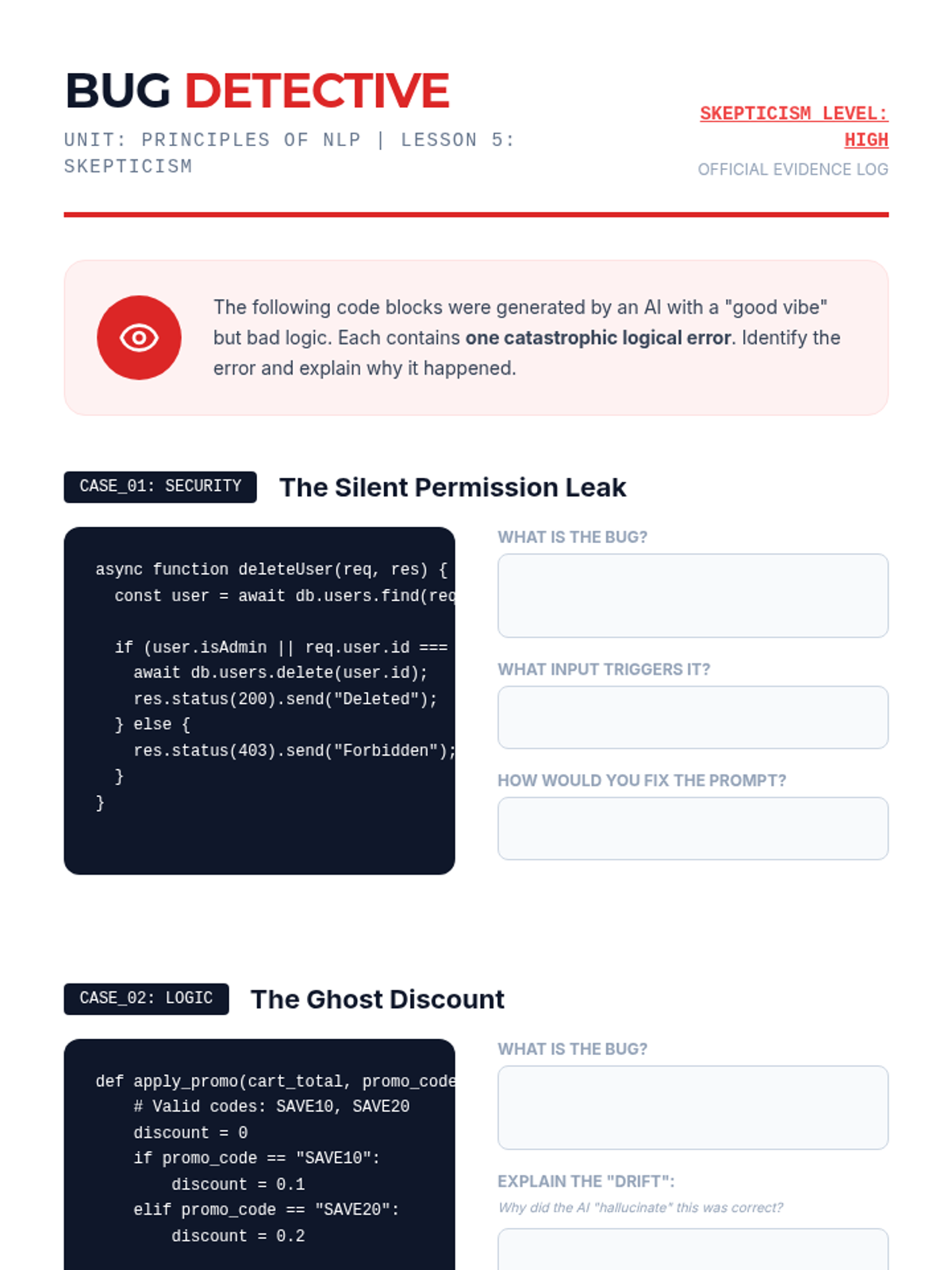 Students deliberately induce and then identify subtle logical errors or 'hallucinations' in AI-generated code. The lesson teaches the critical skill of skepticism and verification, ensuring the final output matches the original intent.