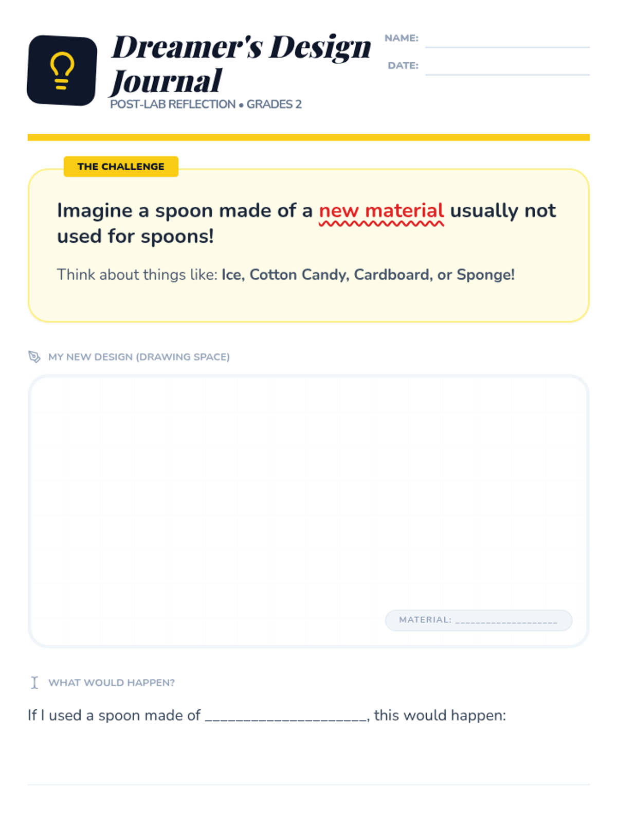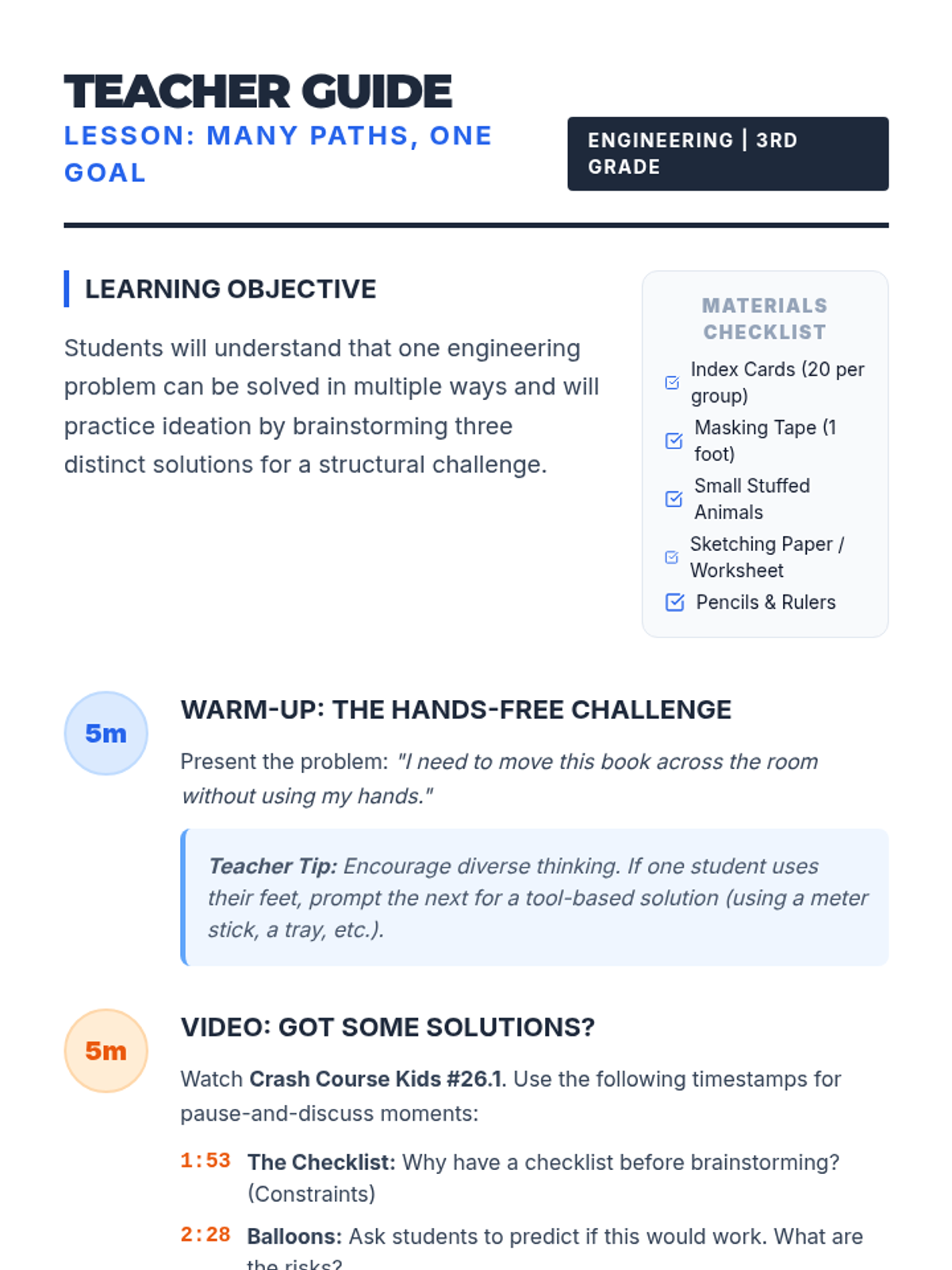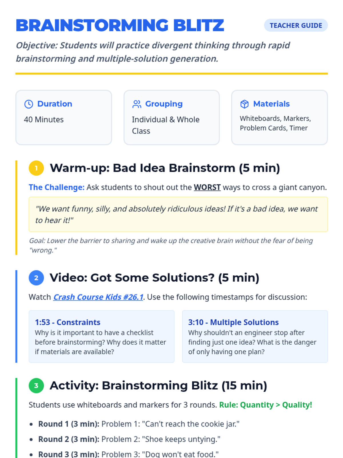 A high-energy lesson focused on divergent thinking and the engineering process. Students will practice rapid brainstorming to generate multiple creative solutions to everyday problems.