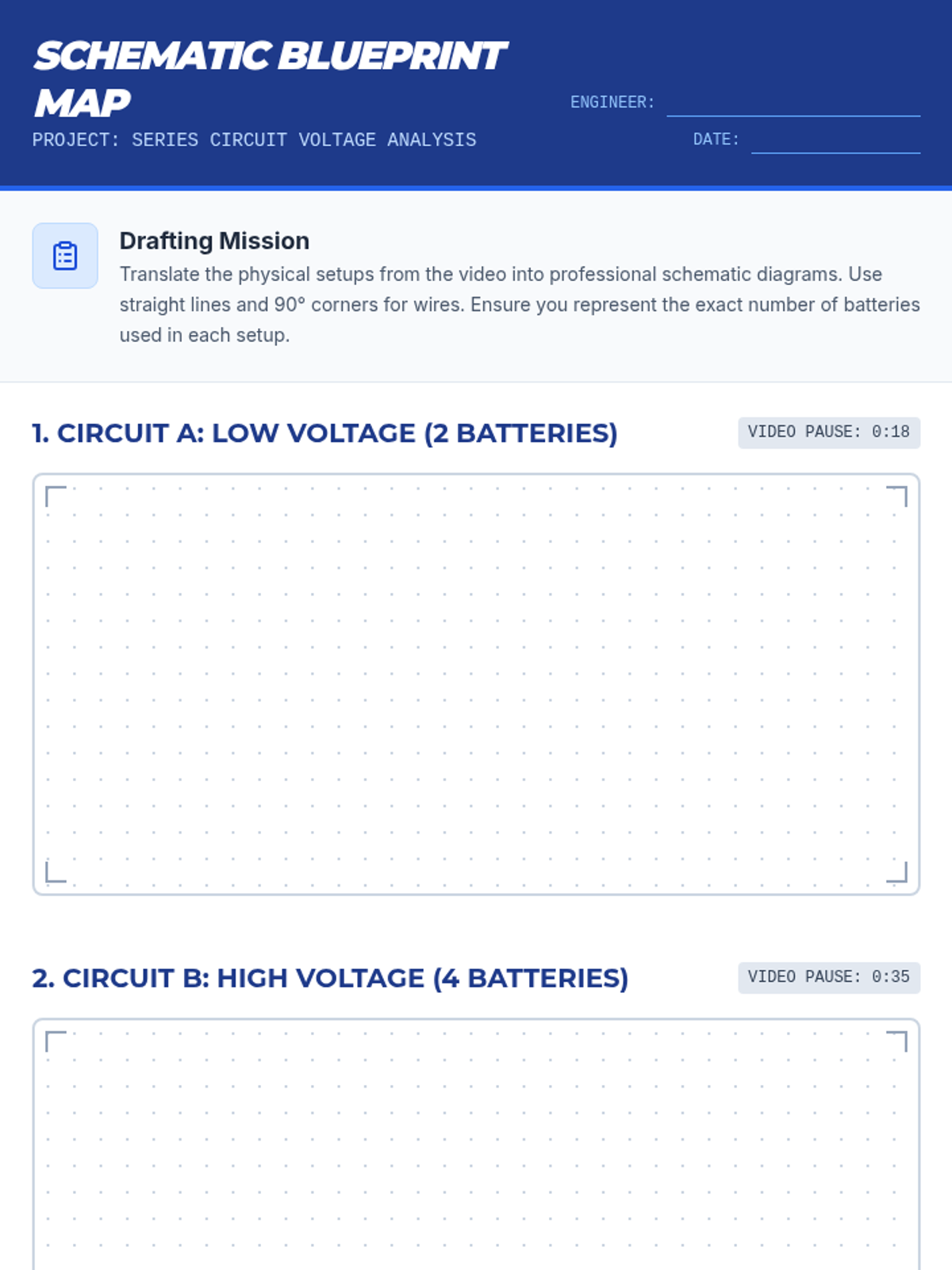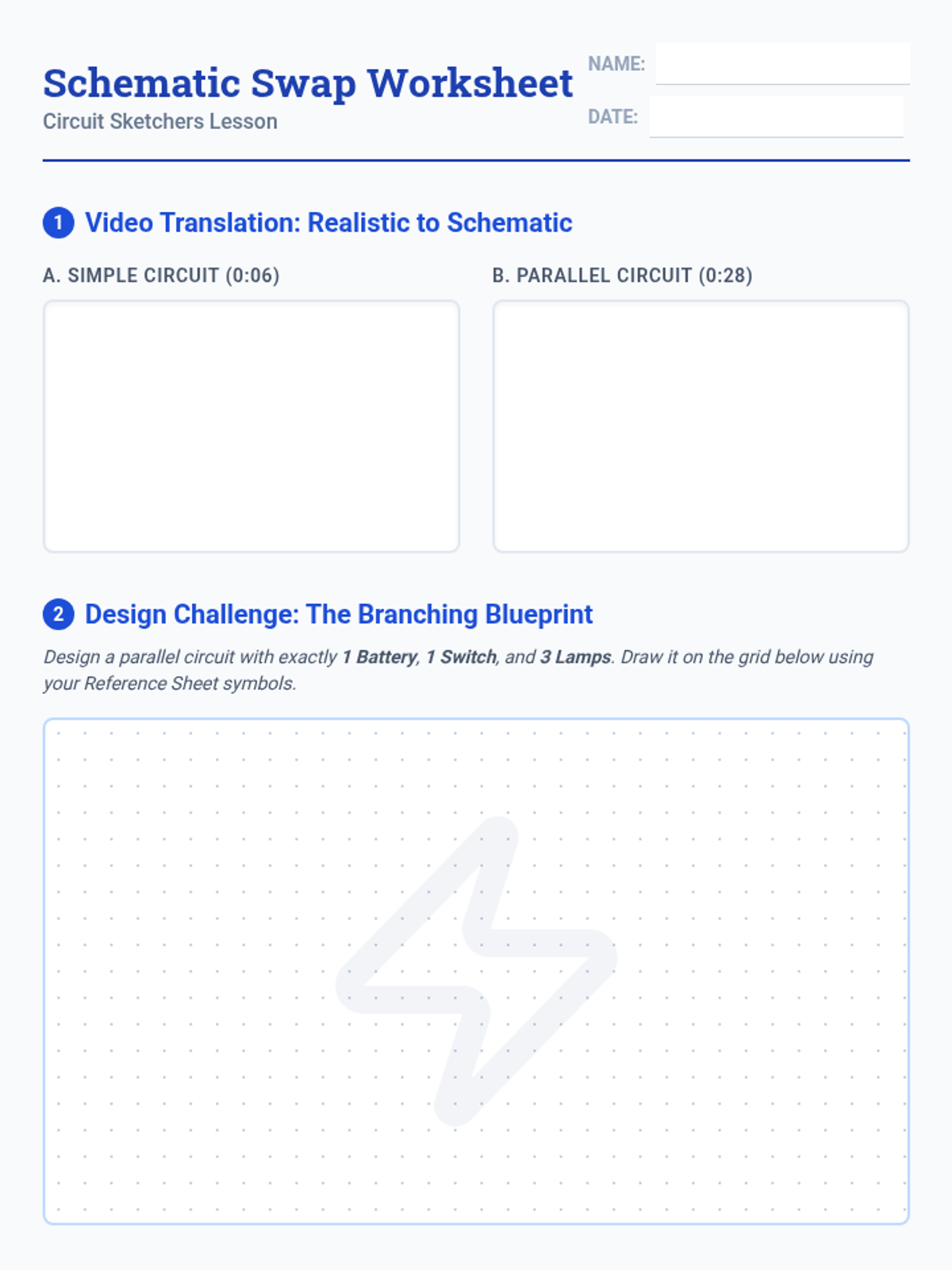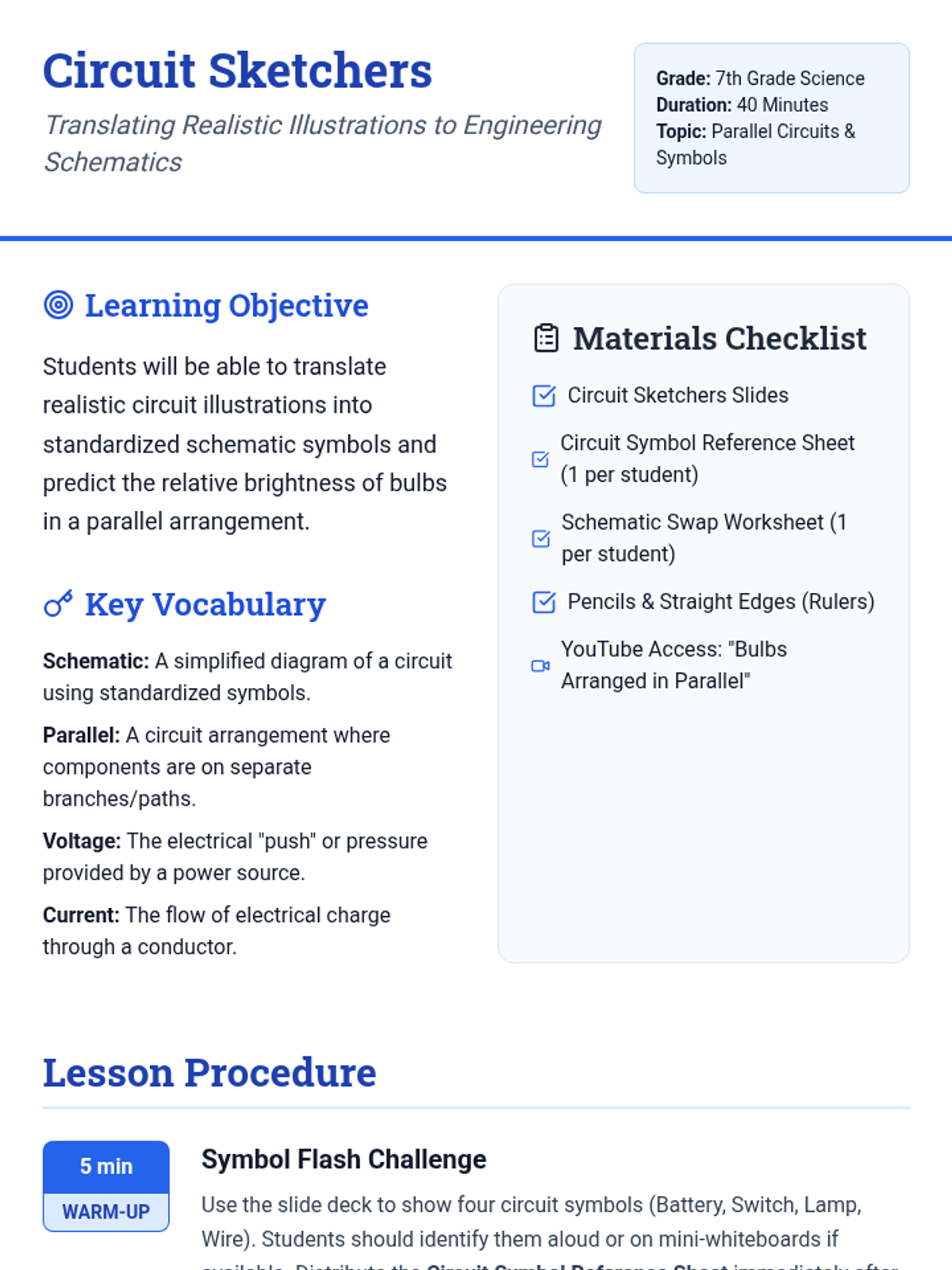 Students will learn to translate realistic circuit components into standardized schematic symbols through video analysis and a peer-to-peer drawing challenge focused on parallel circuits.