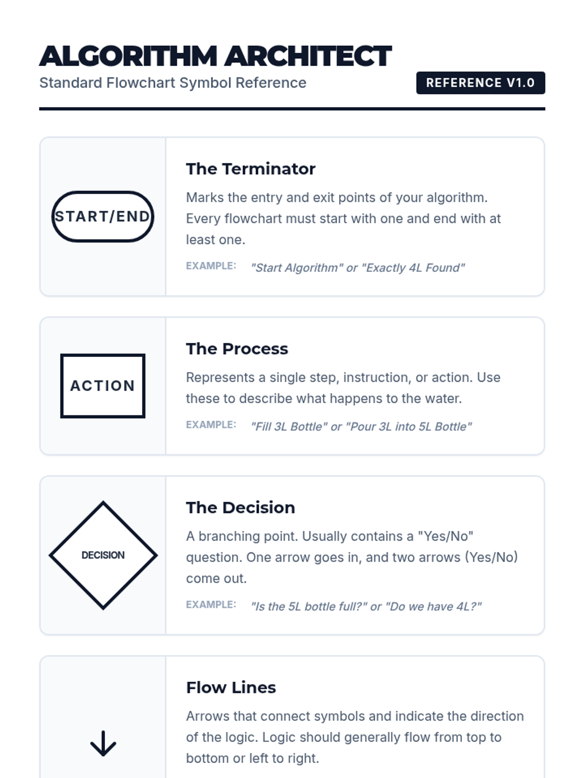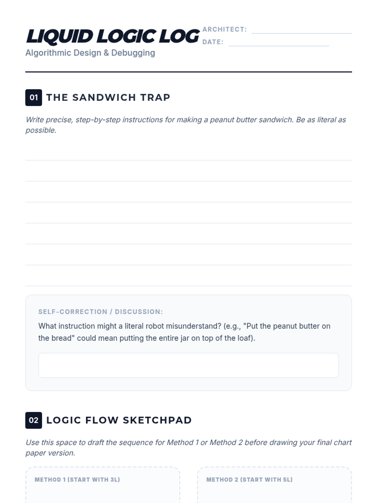 A lesson where students use flowchart symbols to map out the algorithms for solving the classic 3L and 5L water jug riddle, focusing on precise sequencing and logical flow.