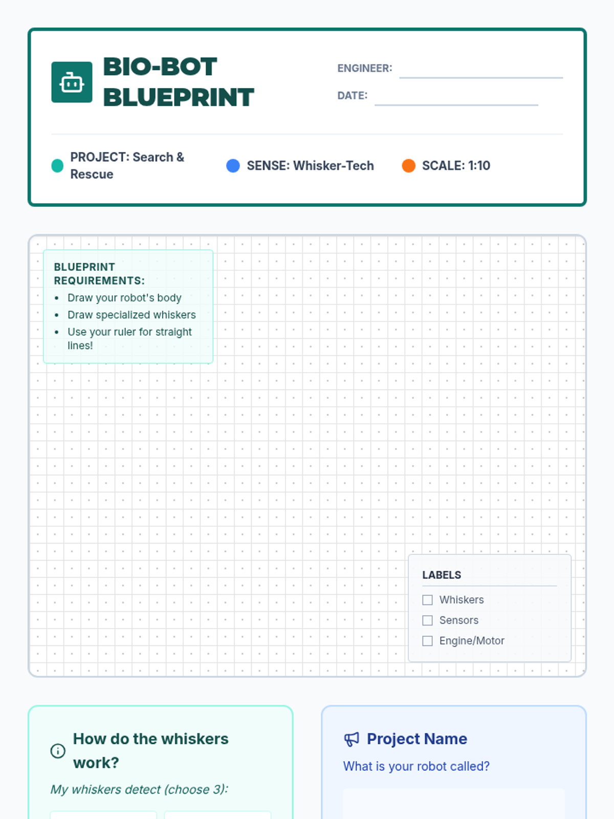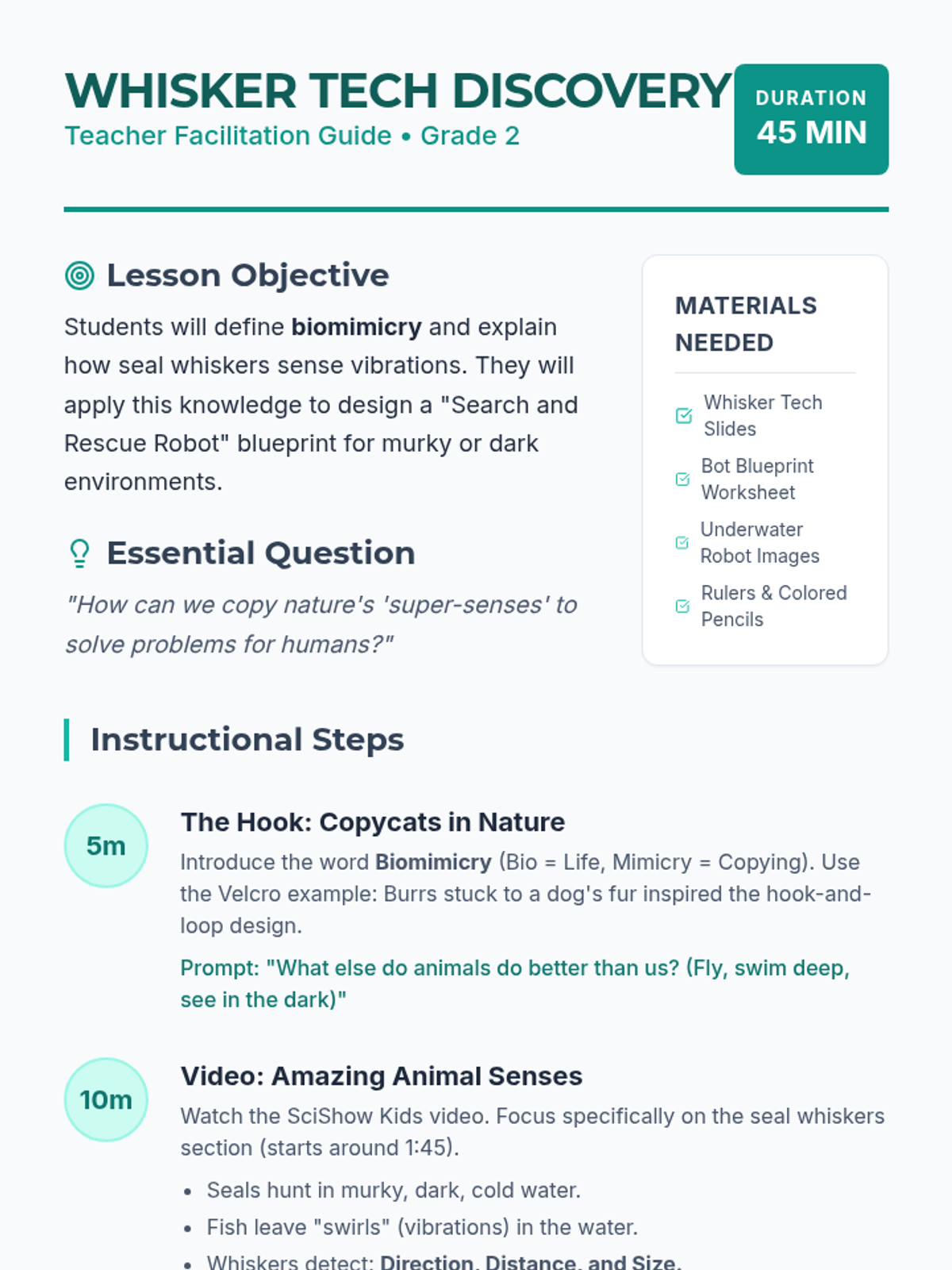 A 2nd-grade engineering lesson where students explore how seal whiskers detect underwater vibrations and apply this biomimicry concept to design a search and rescue robot.