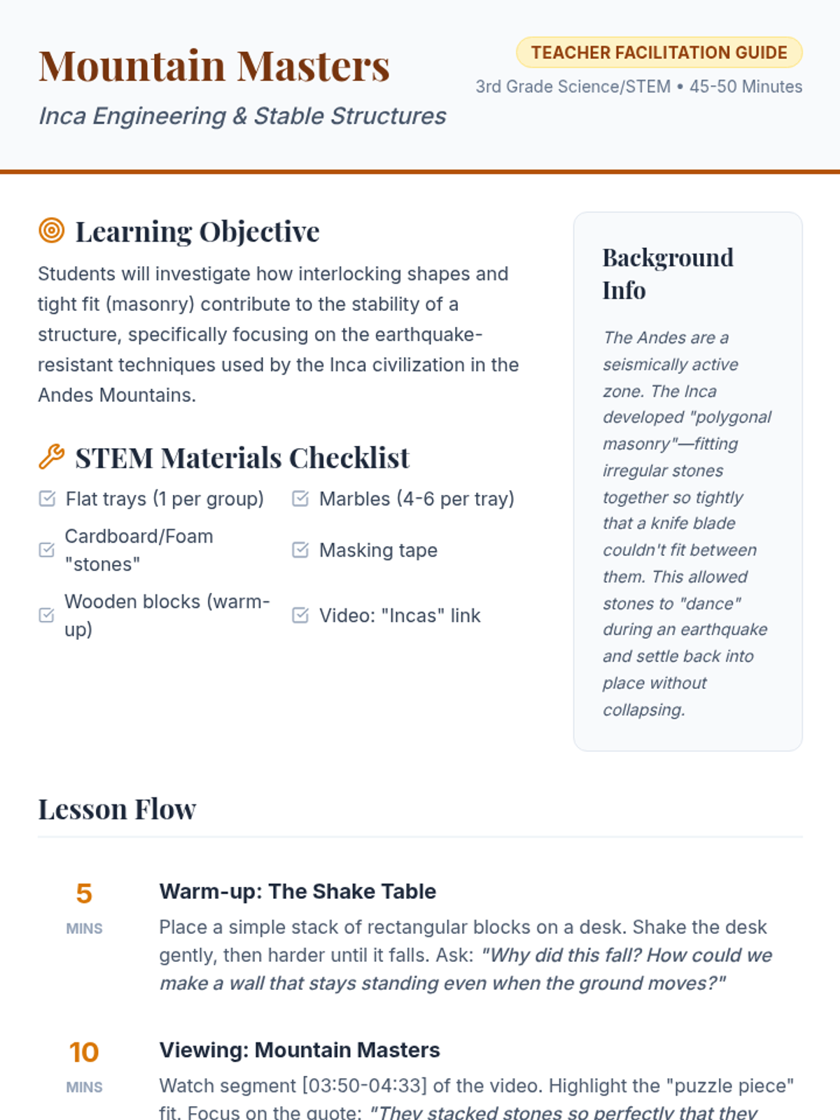 Students will investigate the engineering secrets of the Inca civilization, specifically their earthquake-resistant masonry. Through a hands-on building activity and a 'shake table' test, students explore how irregular, interlocking shapes create stable structures without mortar.