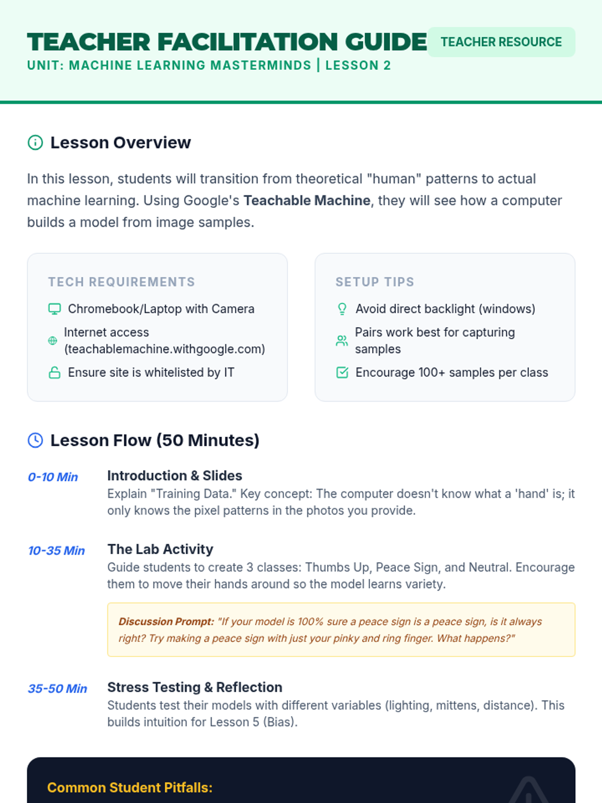 Students use Teachable Machine to build their own image recognition models, exploring how the quality and quantity of training data impacts accuracy.