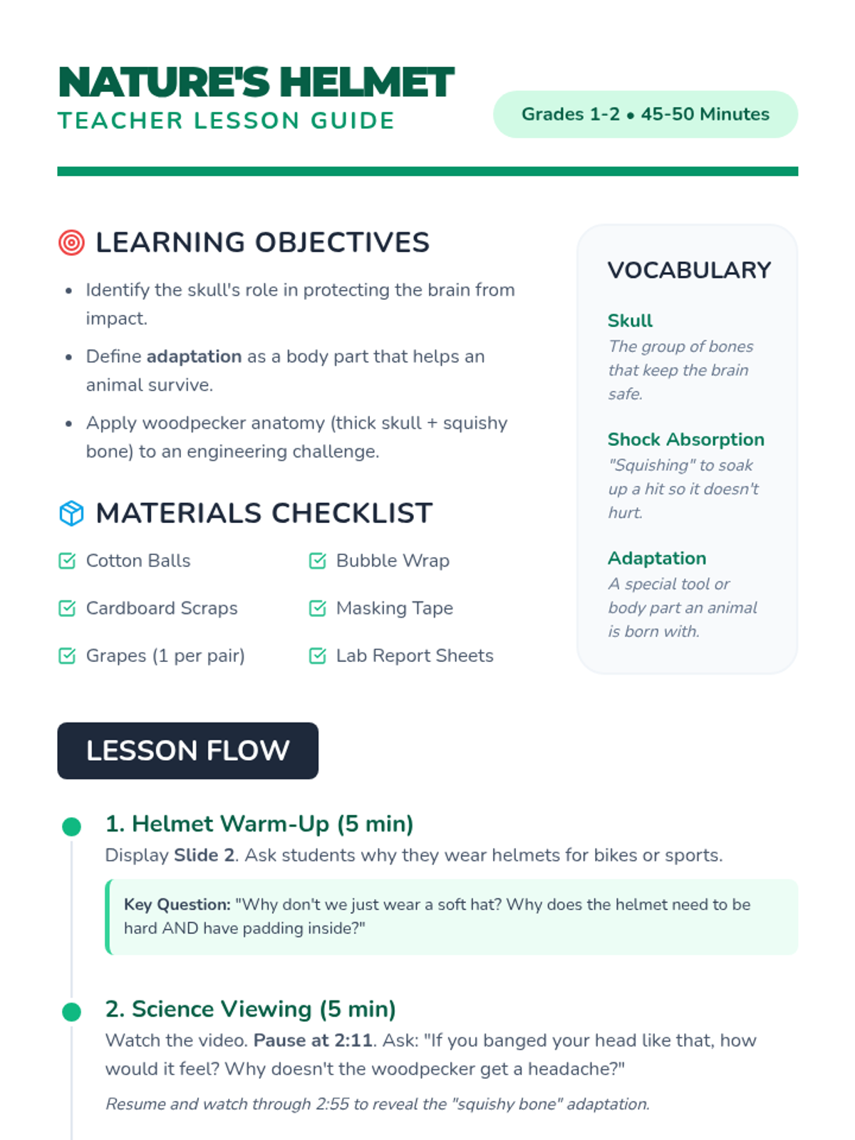 Students explore how biological adaptations protect animals from injury by studying woodpecker anatomy and engineering their own 'brain protectors' for delicate objects.
