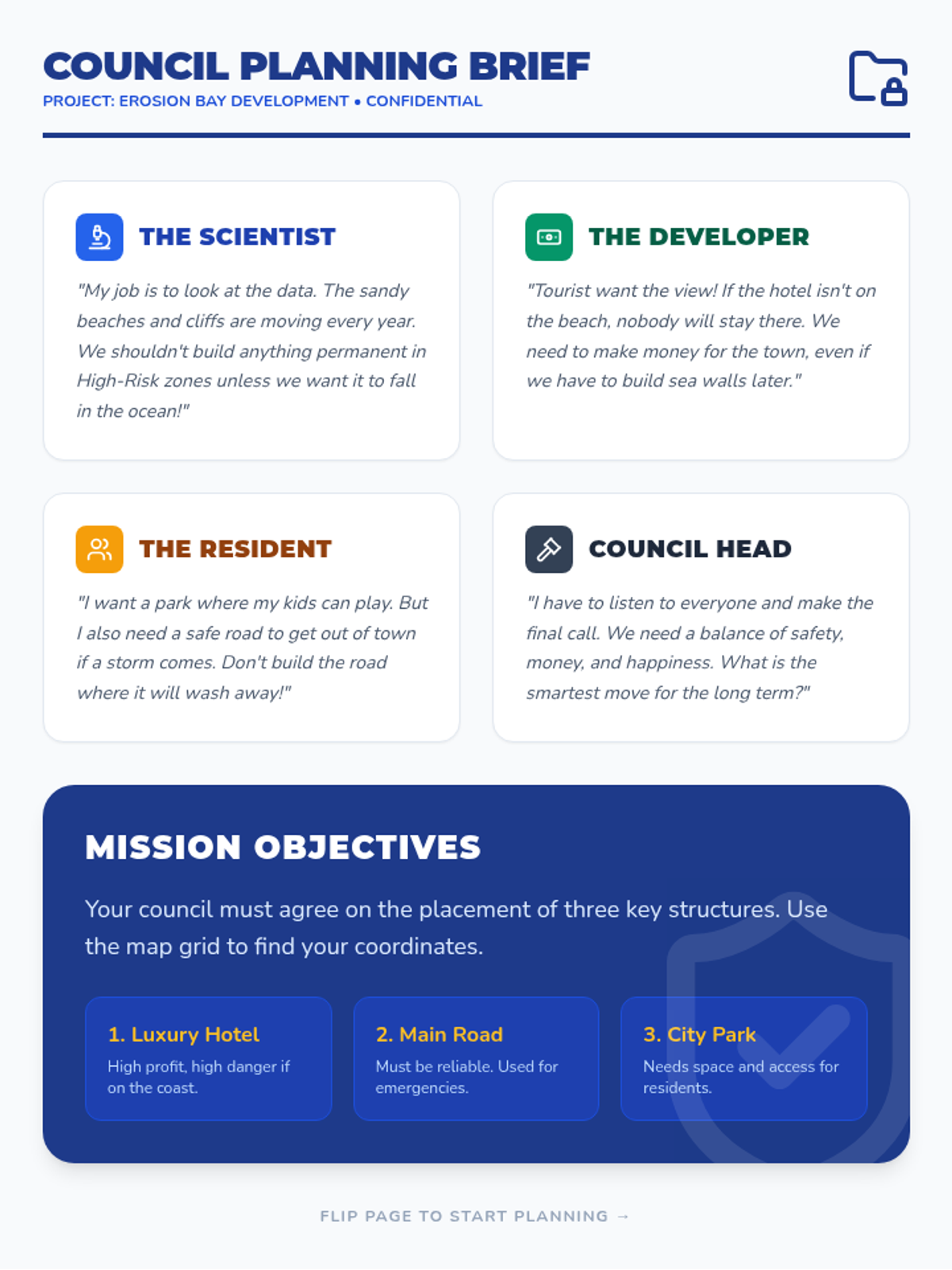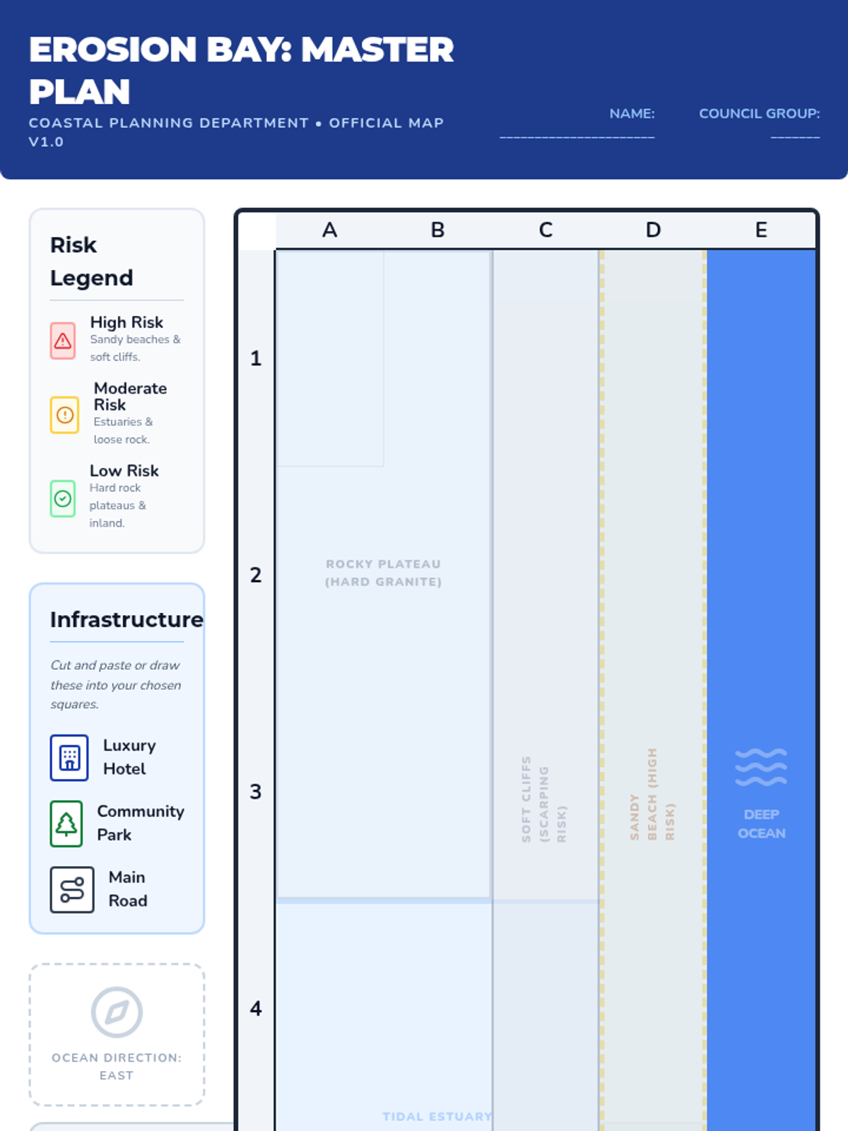 Students act as town planners for a fictional coastal community, evaluating the risks of rapid and slow erosion while proposing infrastructure solutions to protect their town.