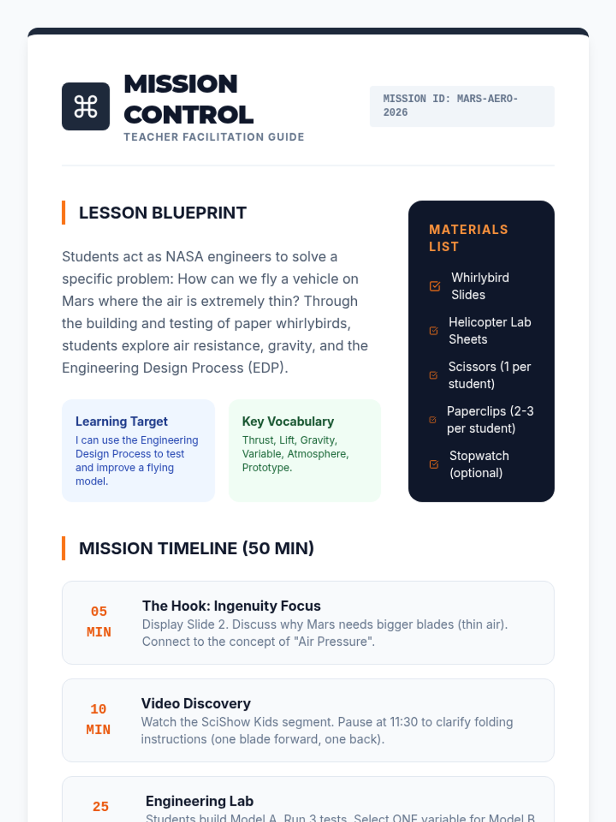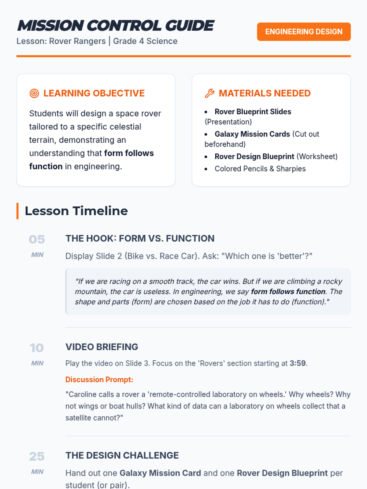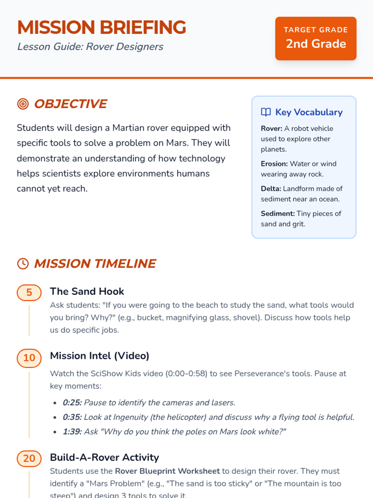 Students explore the tools and technology of the Perseverance rover through a video-led discussion, then design their own Martian rover to solve a specific problem on the Red Planet, concluding with a gallery walk and a postcard reflection.